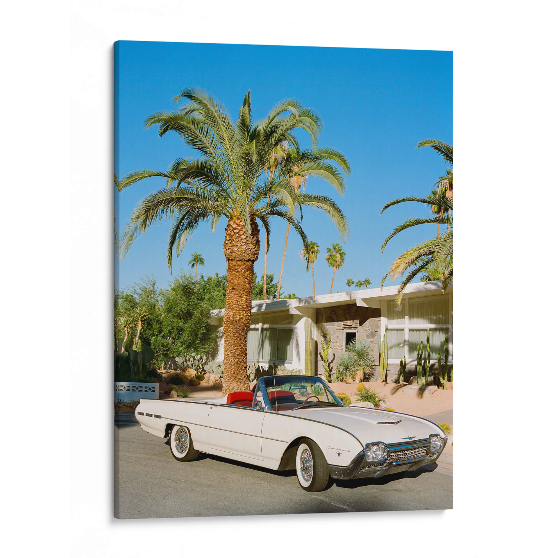 Captura la esencia de un idílico día en Palm Springs con este evocador cuadro decorativo, "Thunderbird de Palm Springs" de Bethany Young. La obra presenta un clásico automóvil descapotable blanco, un Ford Thunderbird, estacionado frente a una residencia de arquitectura moderna, rodeado de exuberantes palmeras y cactus bajo un cielo azul intenso y despejado. La paleta de colores vibrantes, dominada por el azul del cielo y el verde de la vegetación, contrasta con la pureza del blanco del coche y los tonos terrosos del paisaje desértico, creando una atmósfera de nostalgia y sofisticación. El estilo fotográfico captura la luz del sol de California, infundiendo a la escena una sensación de calidez y serenidad vacacional. Ideal para añadir un toque de glamour retro y un aire de escapada a cualquier espacio, este cuadro decorativo es perfecto para salones, estudios o incluso espacios comerciales que busquen transmitir una vibra de estilo de vida relajado pero elegante. Es una pieza que invita a la contemplación, transportando al espectador a un momento de tranquilidad y belleza atemporal, celebrando el icónico diseño automotriz y la arquitectura distintiva de Palm Springs.