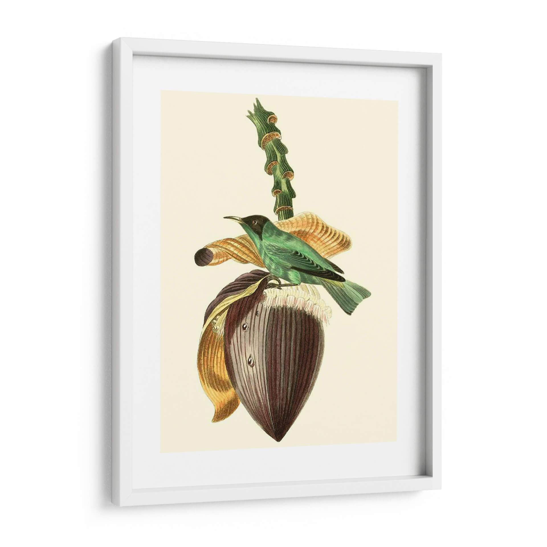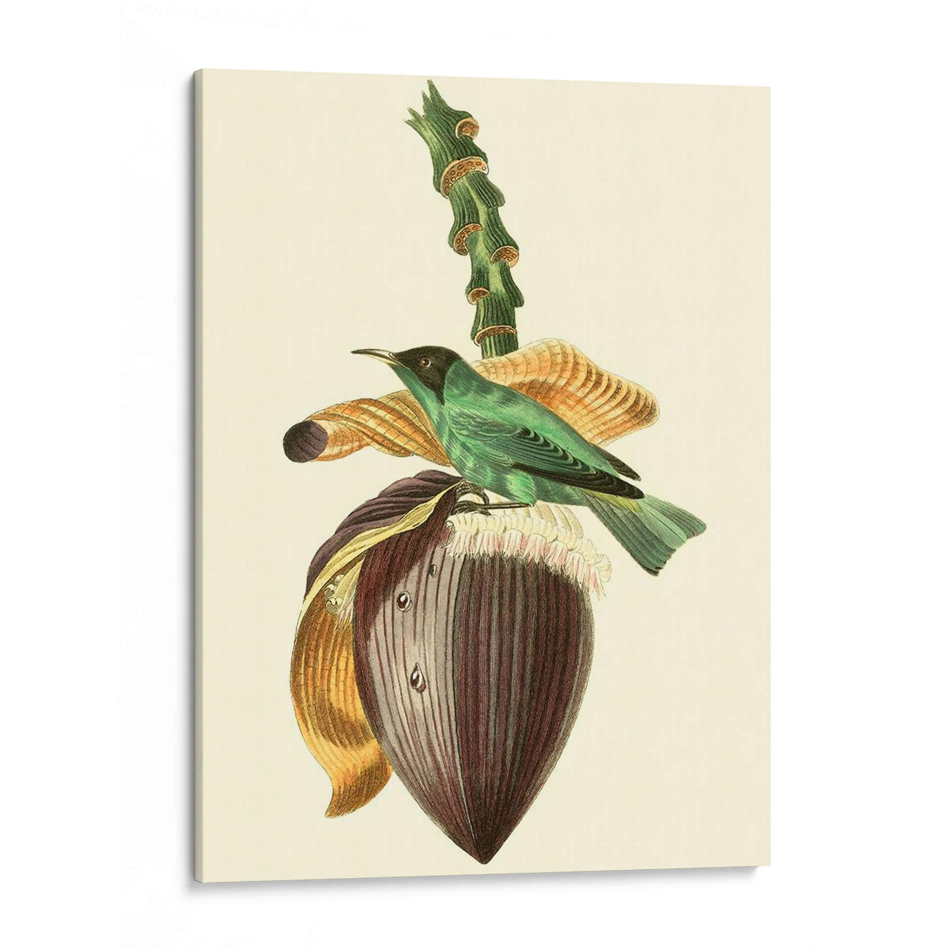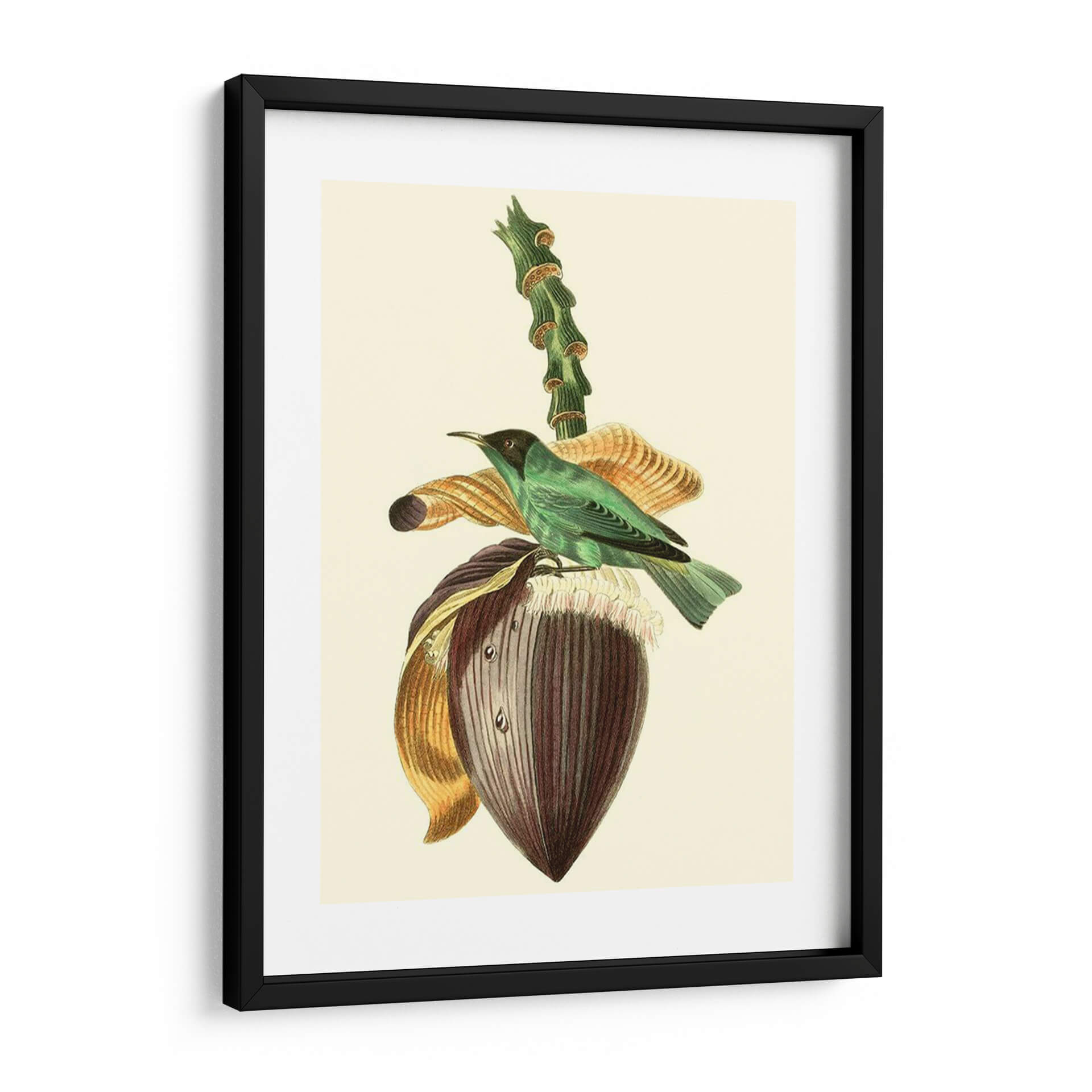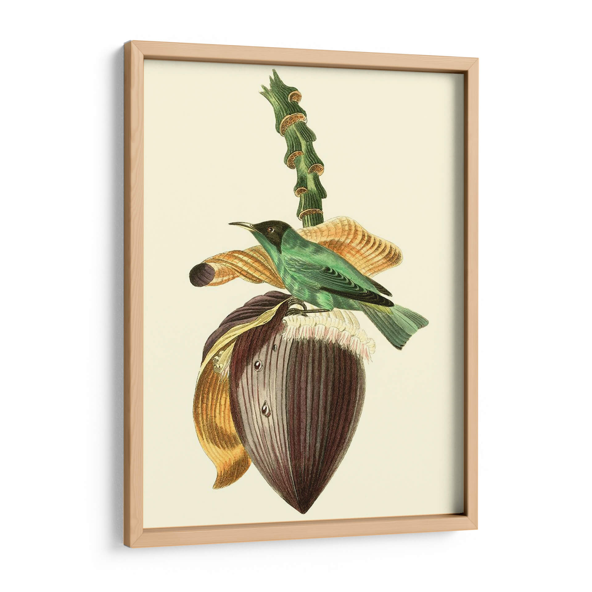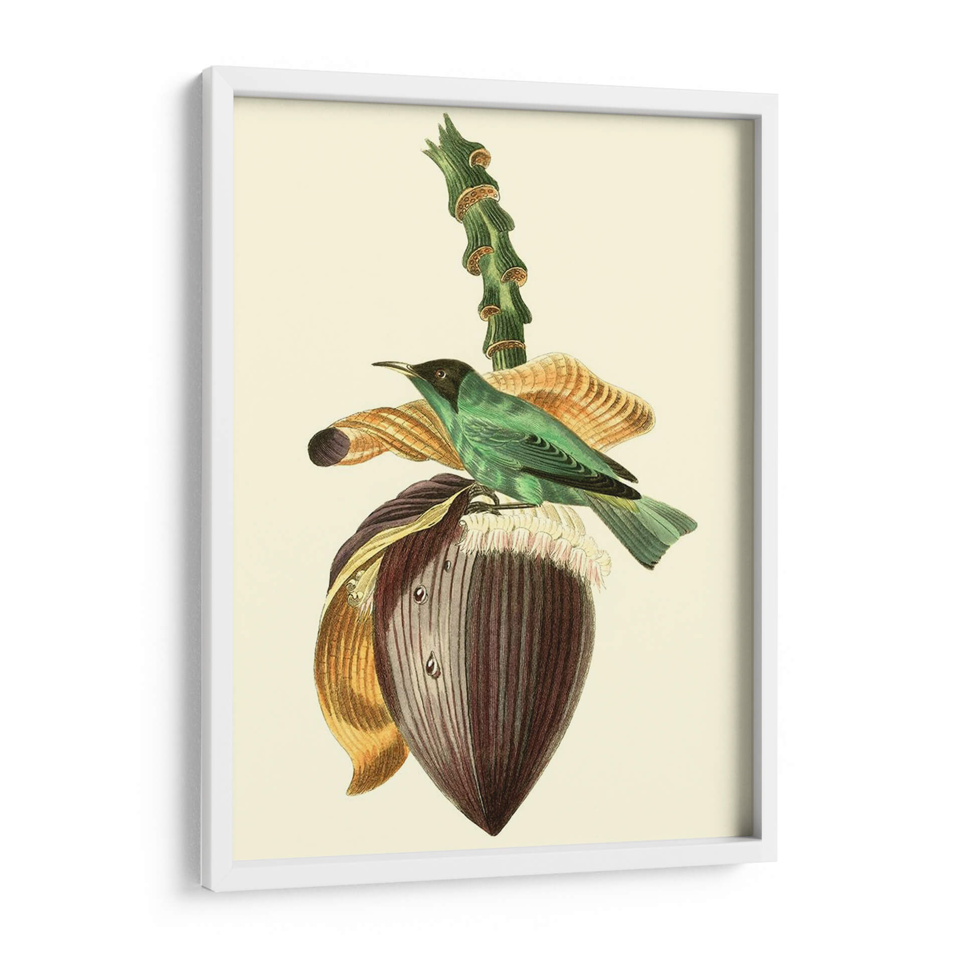Emb k r k El cuadro decorativo "Cuvier Exotic Birds Viii" de Becky Davis es una exquisita pieza que captura la delicadeza de la naturaleza con un estilo clásico y atemporal. La obra presenta un vibrante pájaro exótico de plumaje verde esmeralda posado sobre la flor de un banano, acompañado de elementos botánicos detallados que evocan un jardín exuberante. La paleta de colores, dominada por tonos verdes, marrones, dorados y toques de púrpura, crea una atmósfera serena y a la vez cautivadora, perfecta para añadir un toque de elegancia y sofisticación a cualquier espacio. La técnica de ilustración, que recuerda a los grabados científicos de antaño, aporta un aire de autenticidad y valor histórico. Este cuadro decorativo es ideal para salas de estar, comedores o estudios, donde se busca un punto focal que inspire tranquilidad y aprecio por la belleza natural. Su composición equilibrada y los detalles intrincados invitan a la contemplación, convirtiendo cualquier pared en una ventana a un paraíso tropical. Añade un toque de clase y naturaleza a tu hogar con esta impresionante representación artística que combina ciencia y arte con maestría.