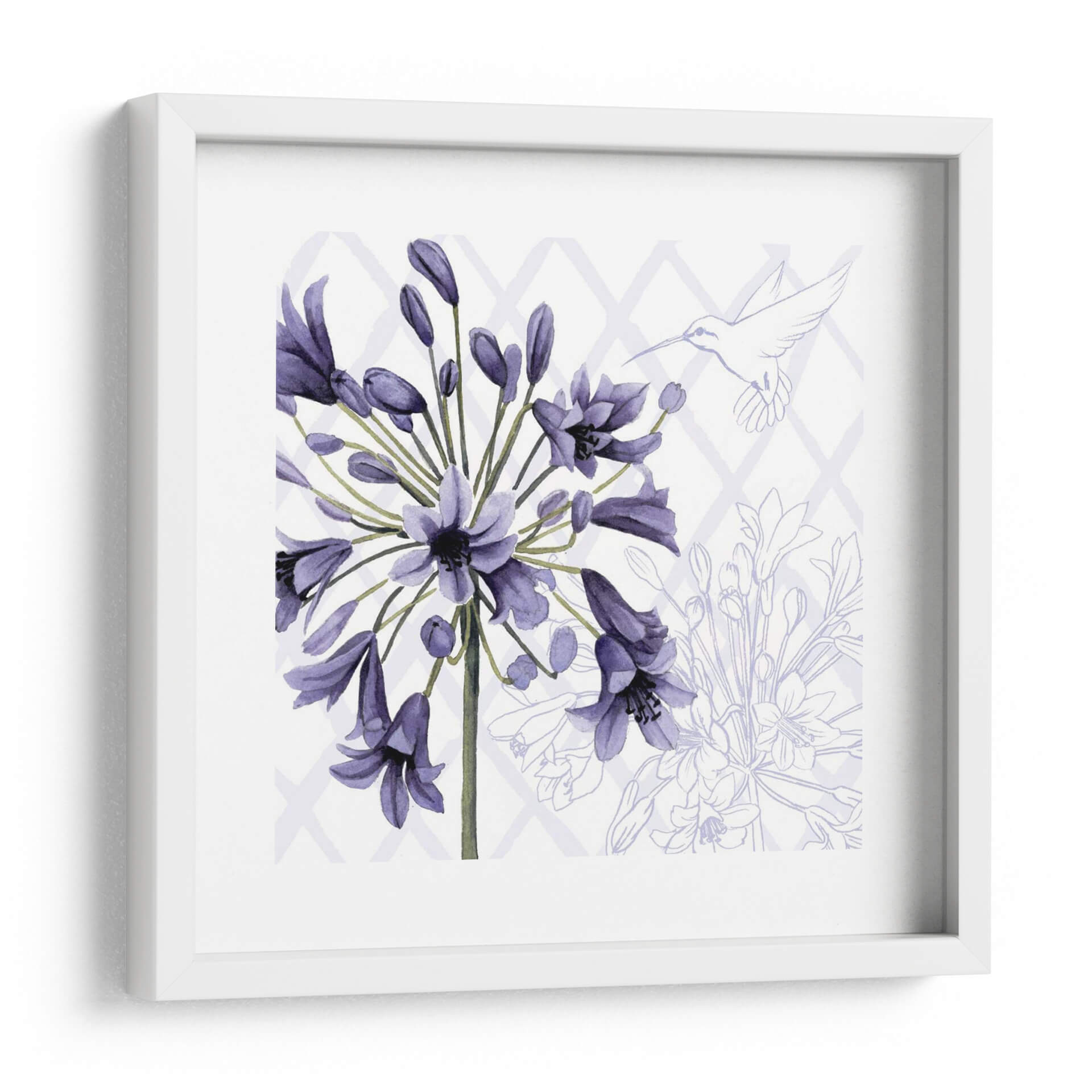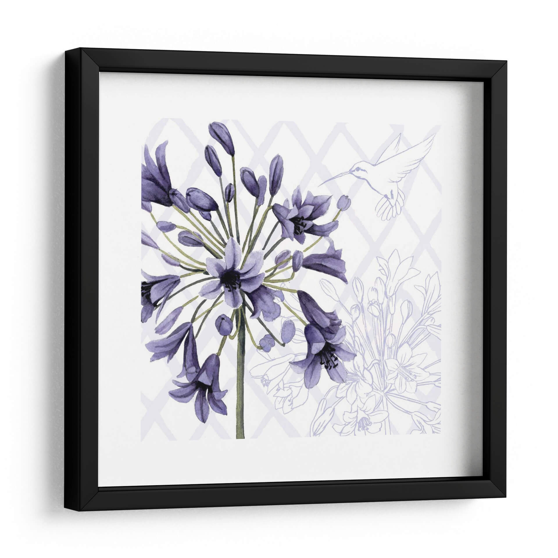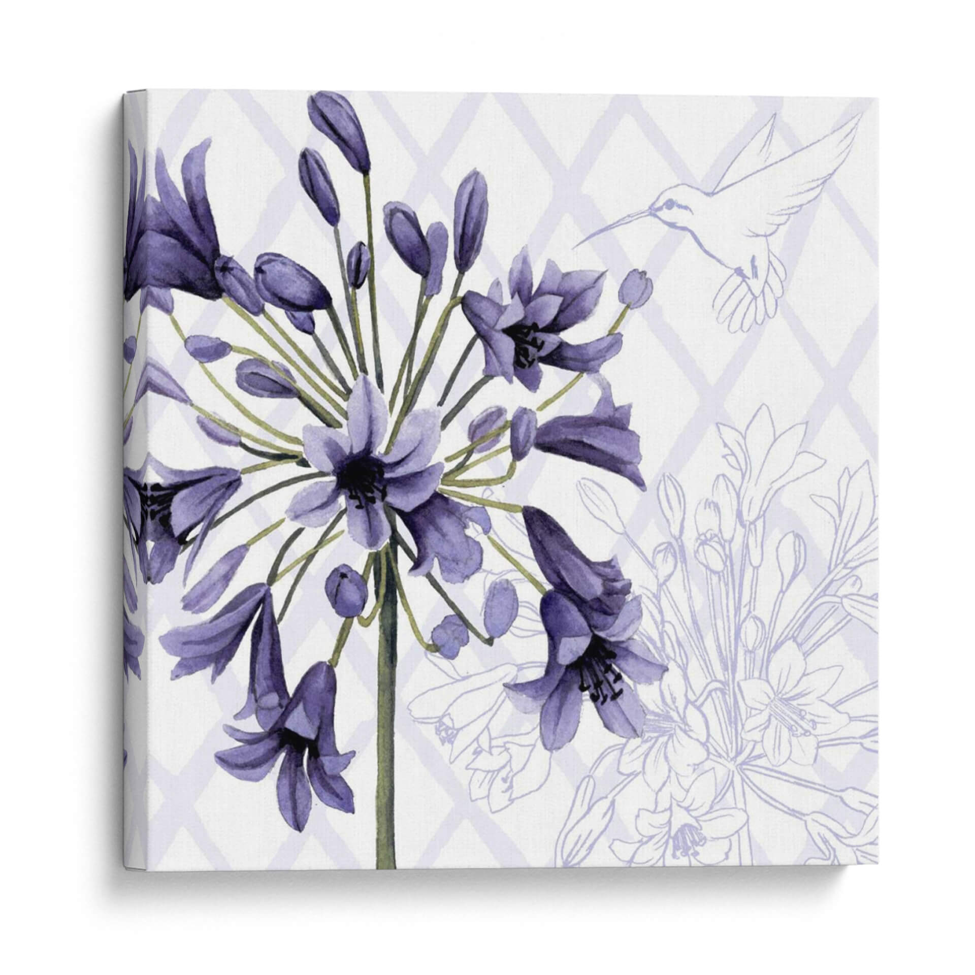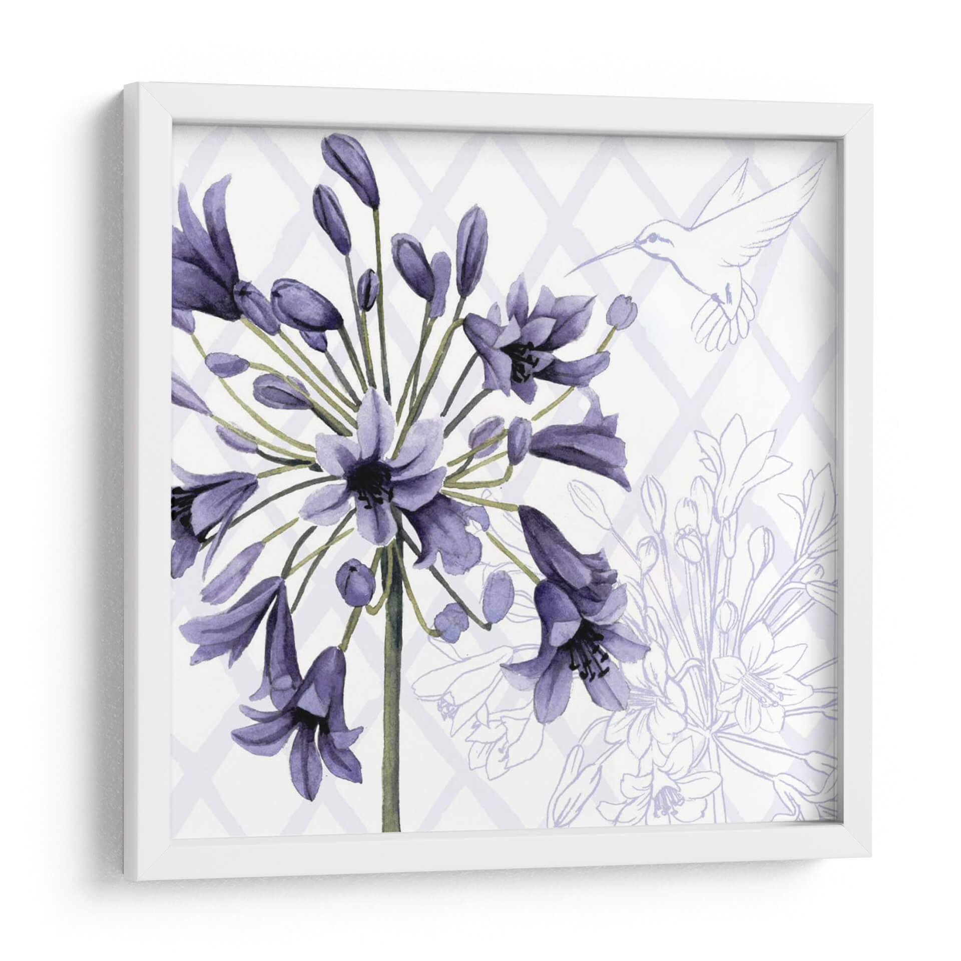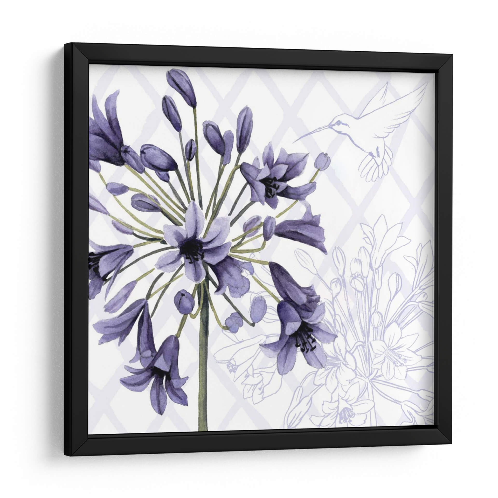 Sumérgete en la delicadeza y el movimiento etéreo con "Danza Del Colibrí I", una obra de arte contemporáneo que captura la gracia de la naturaleza. Esta pieza, creada por Grace Popp, presenta un vibrante ramo de flores moradas en acuarela, detalladas con trazos precisos y llenos de vida. Los pétalos aterciopelados y los capullos en distintas etapas de apertura invitan a la contemplación, mientras que la sutil silueta de un colibrí revoloteando añade un toque de dinamismo y asombro. El fondo, adornado con un patrón de rombos en tono lavanda pálido y un esbozo delicado de flores, crea una atmósfera serena y etérea, complementando a la perfección la explosión de color del elemento principal. Los tonos morados profundos y los verdes sutiles de los tallos contrastan maravillosamente con el fondo claro, otorgando profundidad y sofisticación a la composición. "Danza Del Colibrí I" es más que un cuadro decorativo; es una ventana a un jardín encantado, ideal para infundir serenidad y un toque de magia en cualquier espacio. Su estilo acuarela, con la suavidad de las transiciones de color y la ligereza de los trazos, la hace perfecta para salas de estar, dormitorios o estudios que buscan un ambiente relajante y elegante. Este cuadro decorativo contemporáneo es una elección excepcional para quienes aprecian la belleza de la flora y la fauna, aportando una dosis de naturaleza y arte refinado a tu hogar u oficina.