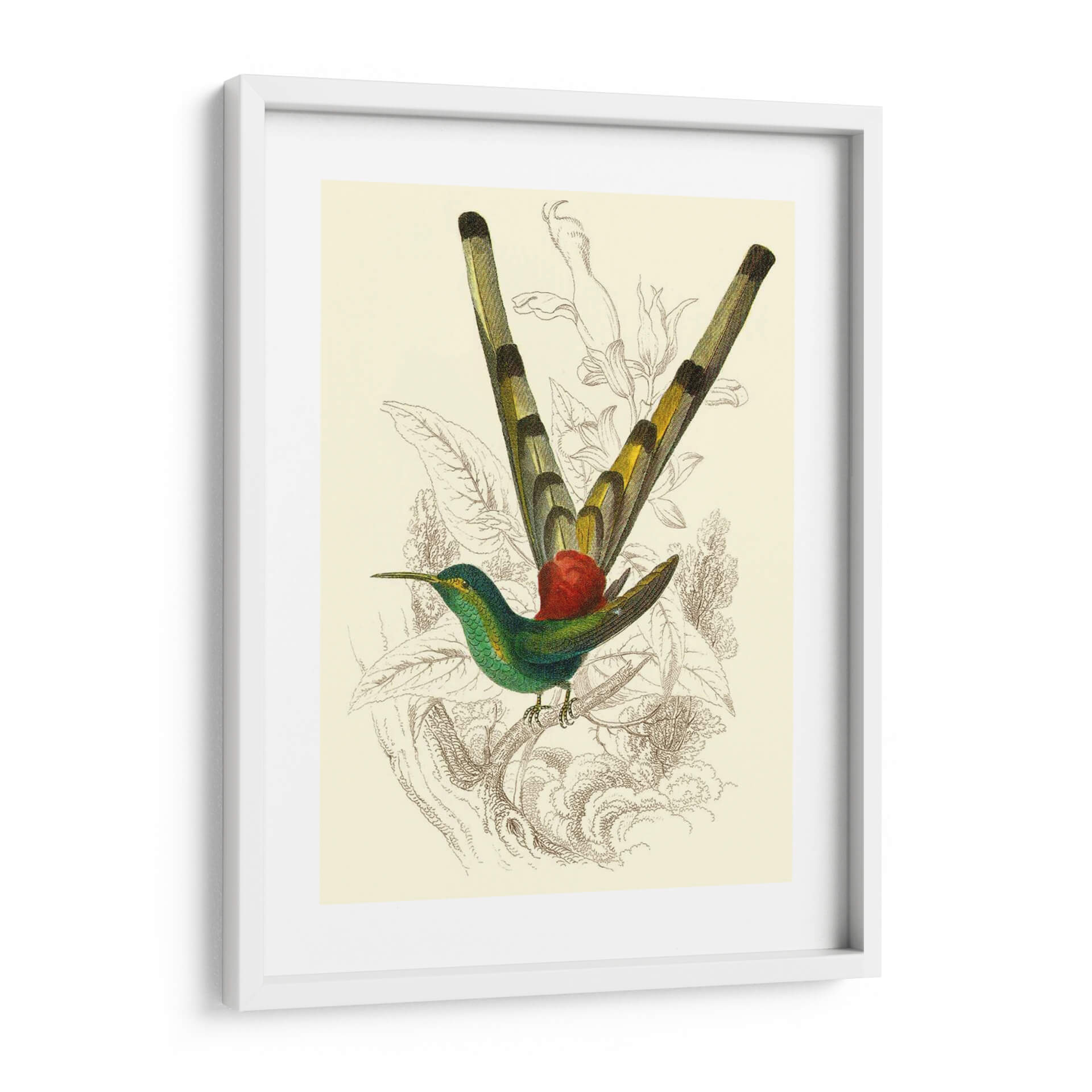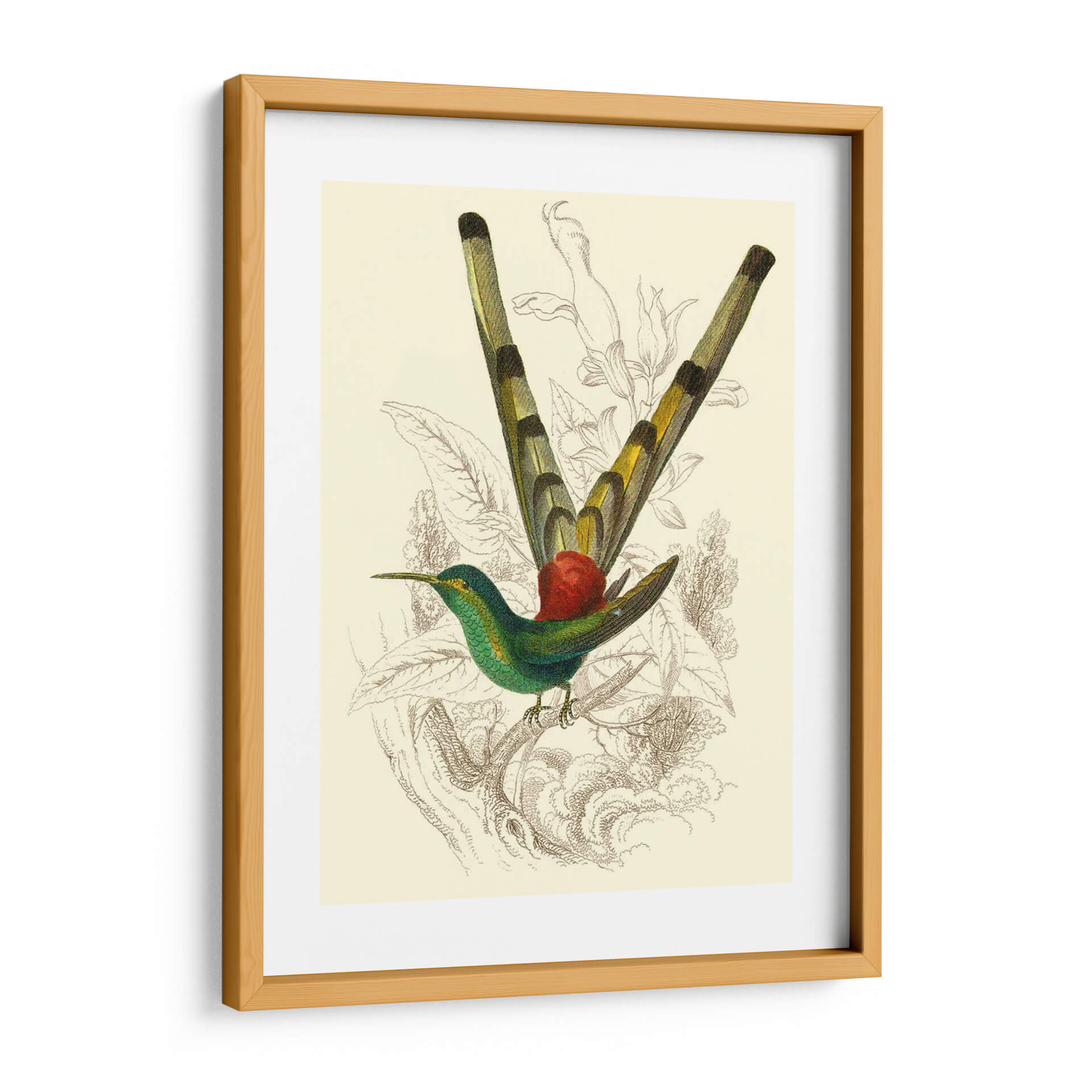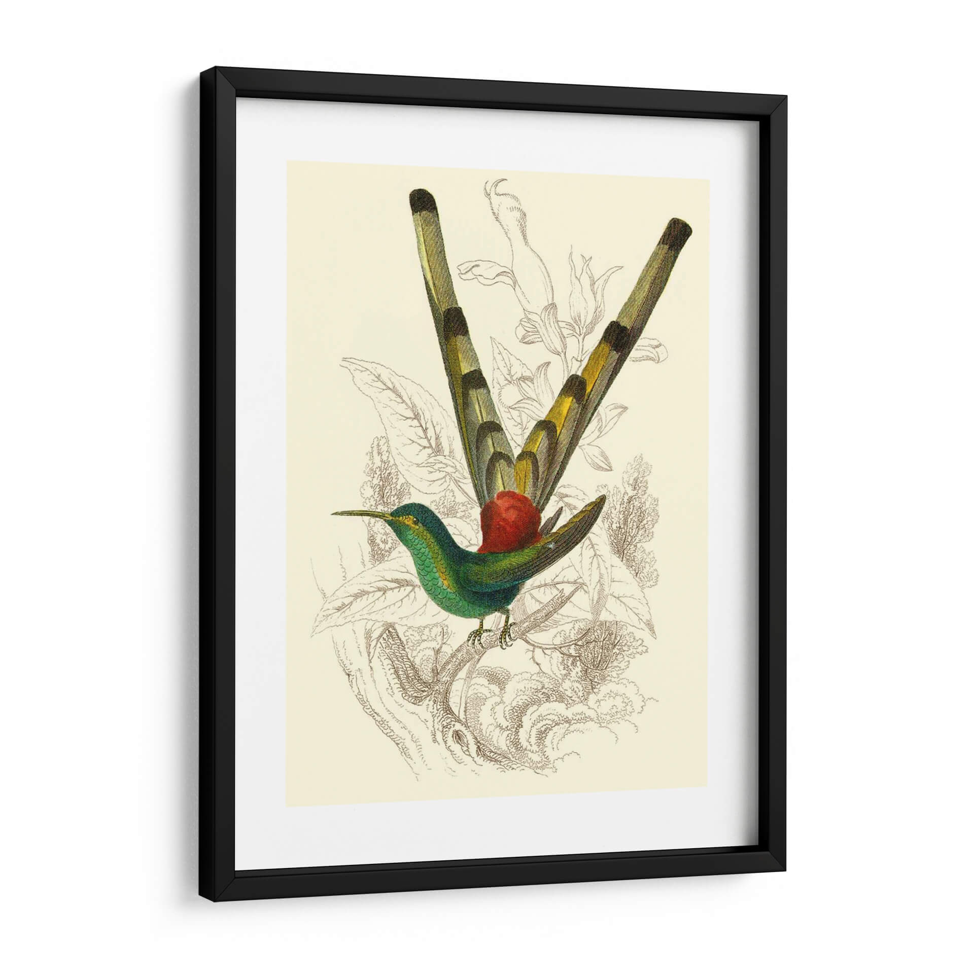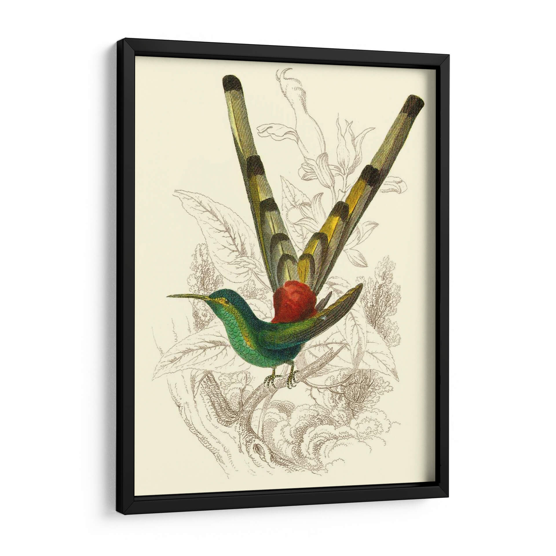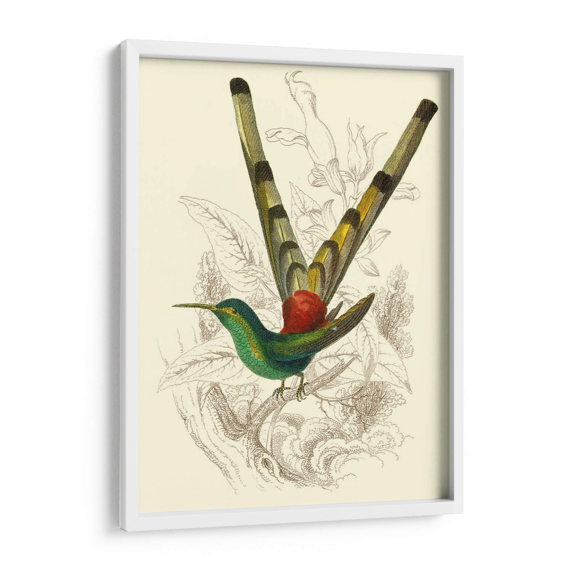 Embellece tu espacio con el cuadro decorativo "Jardine Hummingbird II", una obra maestra que captura la delicadeza y el vibrante espíritu de la naturaleza. Esta pieza, inspirada en ilustraciones científicas de antaño, presenta un colibrí exquisitamente detallado en tonos verde esmeralda y detalles amarillos, posado grácilmente sobre una rama. El fondo, con un suave tono crema, está adornado con delicados bocetos botánicos en tonos sepia, que aportan profundidad y un toque vintage sin robar protagonismo al ave central. La composición equilibra la vivacidad del colibrí con la serenidad de su entorno, creando una atmósfera de calma y admiración. Ideal para añadir un toque de elegancia naturalista a salones, dormitorios o estudios, este cuadro decorativo es perfecto para amantes de la ornitología, la botánica o simplemente para quienes buscan una pieza de arte que evoque la belleza sutil del mundo natural. Su estilo clásico con un toque contemporáneo lo hace versátil para integrarse en diversas decoraciones, desde las más tradicionales hasta las modernas.