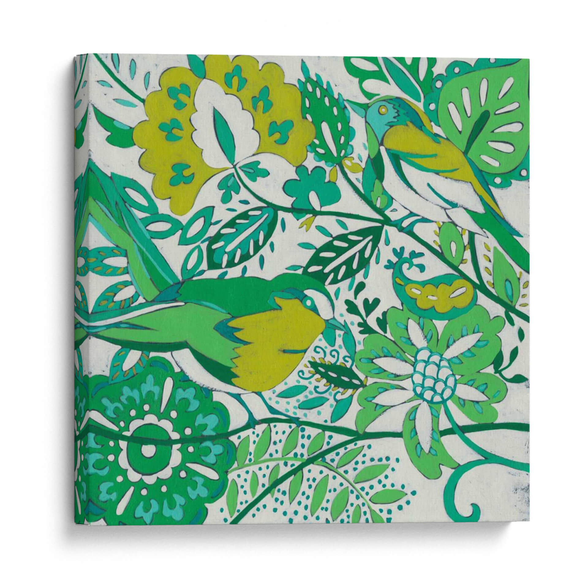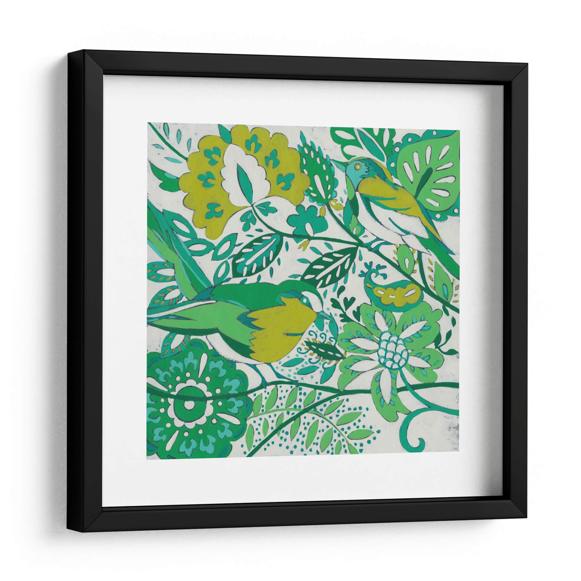 uevojaros posados entre exuberantes flores y follaje, con una paleta de colores que combina verdes intensos, amarillos c