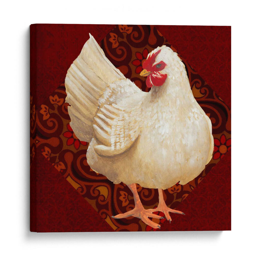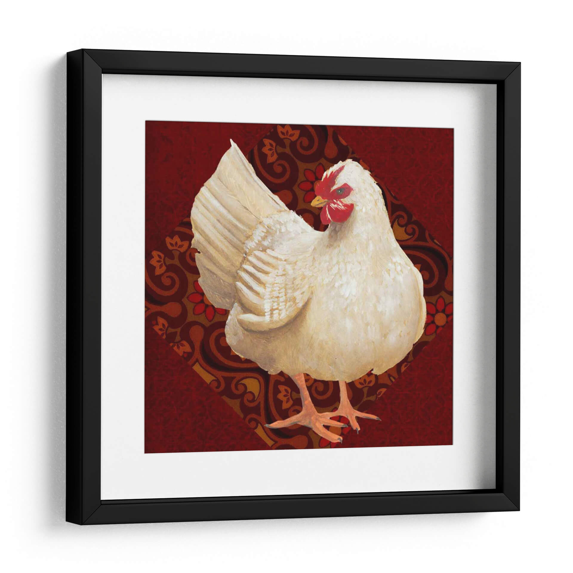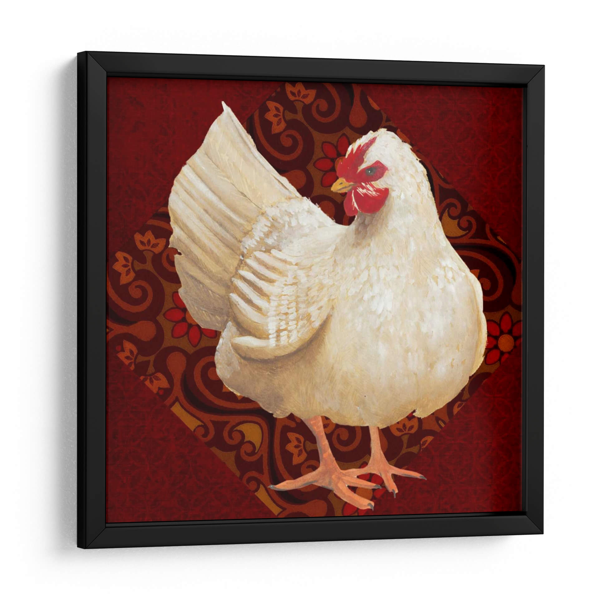 Adorna tu hogar con la encantadora obra "Patio Ave I" de Grace Popp, un cuadro decorativo que evoca la calidez y el encanto rústico. Esta pieza presenta una gallina blanca detallada, pintada con un realismo suave, posada sobre un fondo abstracto con patrones intrincados en tonos burdeos, dorados y ocres. La composición centra la atención en la figura de la ave, cuyos plumas están representadas con textura y profundidad, mientras que su cresta y pico carmesíes añaden un vibrante toque de color. El patrón de fondo, que recuerda a motivos florales y arabescos, aporta una sensación de sofisticación y tradición, creando un contraste visualmente atractivo con la sencillez de la gallina. "Patio Ave I" es ideal para añadir un acento de color y personalidad a cocinas, comedores o cualquier espacio que busque un toque campestre elegante. Su estilo mezcla el realismo con elementos decorativos, resultando en una obra versátil que complementa tanto decoraciones rústicas como contemporáneas. Permite que esta pieza de arte insufla vida y carácter a tus paredes, creando un punto focal acogedor y distintivo. Descubre la belleza de lo cotidiano reimaginada por el arte.
