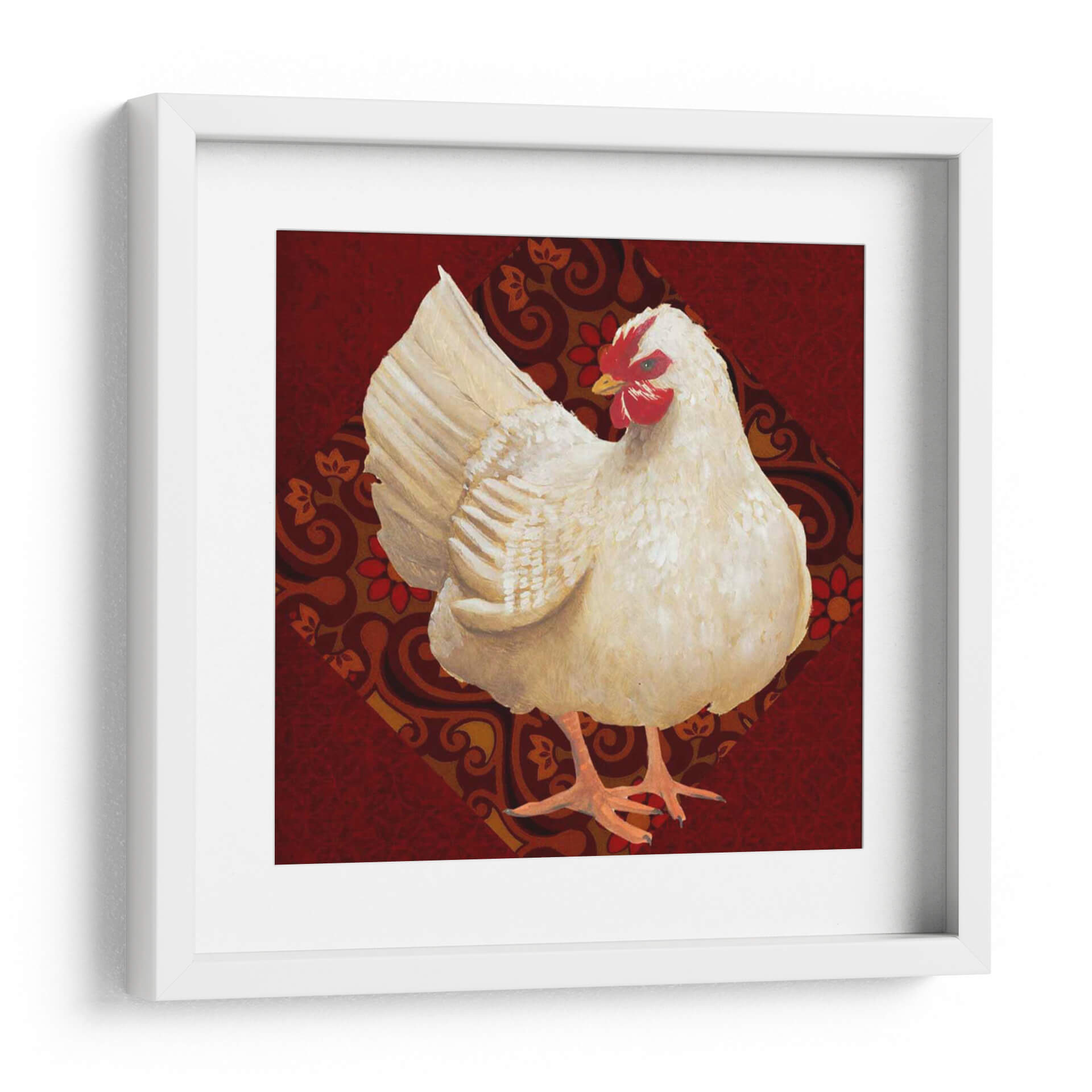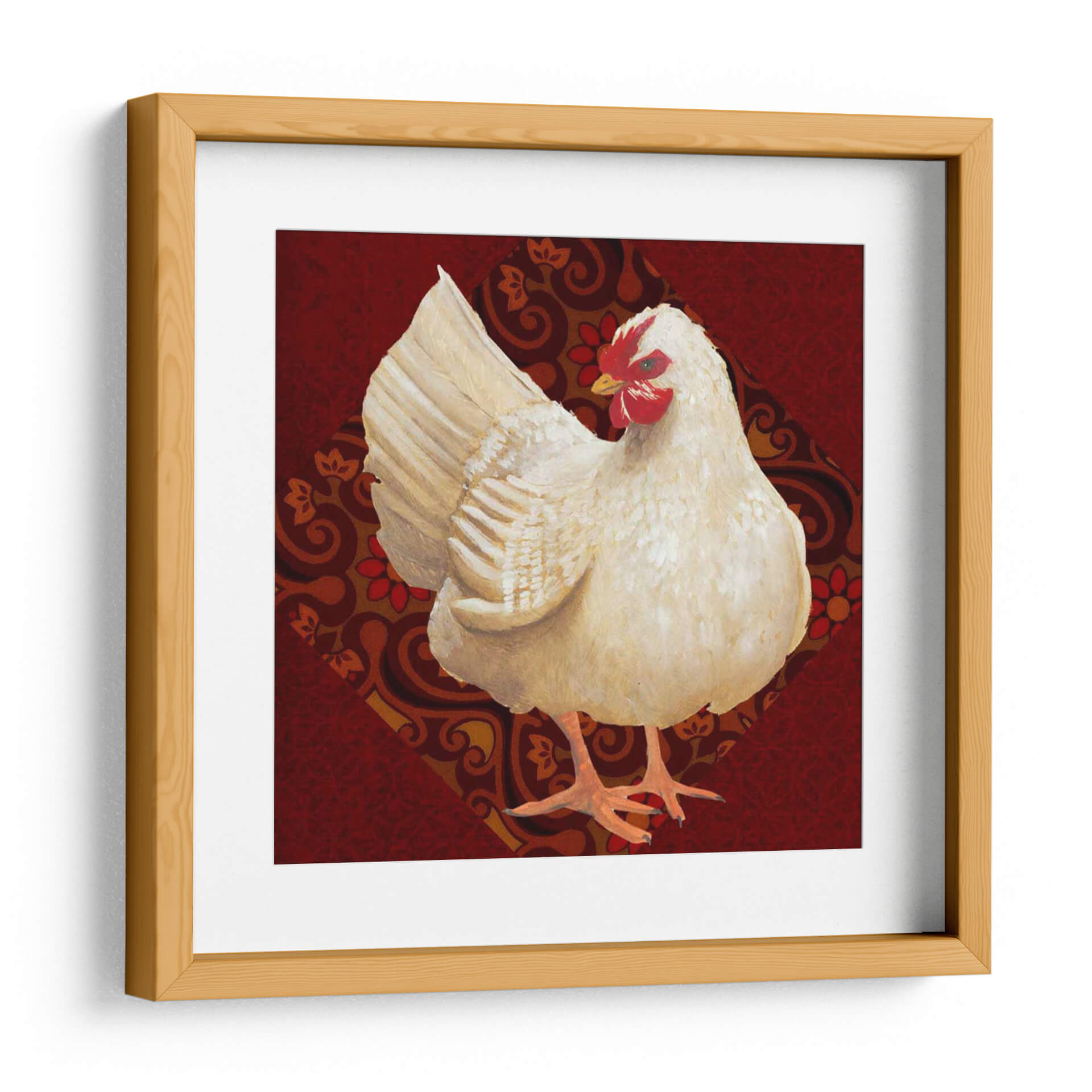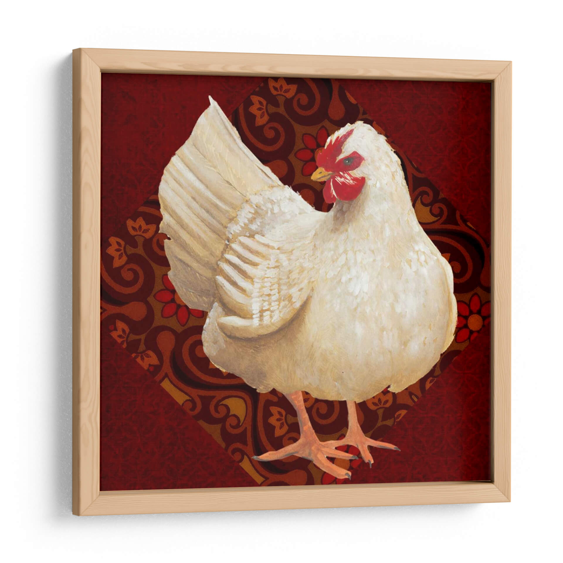 Adorna tu hogar con la encantadora obra "Patio Ave I" de Grace Popp, un cuadro decorativo que evoca la calidez y el encanto rústico. Esta pieza presenta una gallina blanca detallada, pintada con un realismo suave, posada sobre un fondo abstracto con patrones intrincados en tonos burdeos, dorados y ocres. La composición centra la atención en la figura de la ave, cuyos plumas están representadas con textura y profundidad, mientras que su cresta y pico carmesíes añaden un vibrante toque de color. El patrón de fondo, que recuerda a motivos florales y arabescos, aporta una sensación de sofisticación y tradición, creando un contraste visualmente atractivo con la sencillez de la gallina. "Patio Ave I" es ideal para añadir un acento de color y personalidad a cocinas, comedores o cualquier espacio que busque un toque campestre elegante. Su estilo mezcla el realismo con elementos decorativos, resultando en una obra versátil que complementa tanto decoraciones rústicas como contemporáneas. Permite que esta pieza de arte insufla vida y carácter a tus paredes, creando un punto focal acogedor y distintivo. Descubre la belleza de lo cotidiano reimaginada por el arte.