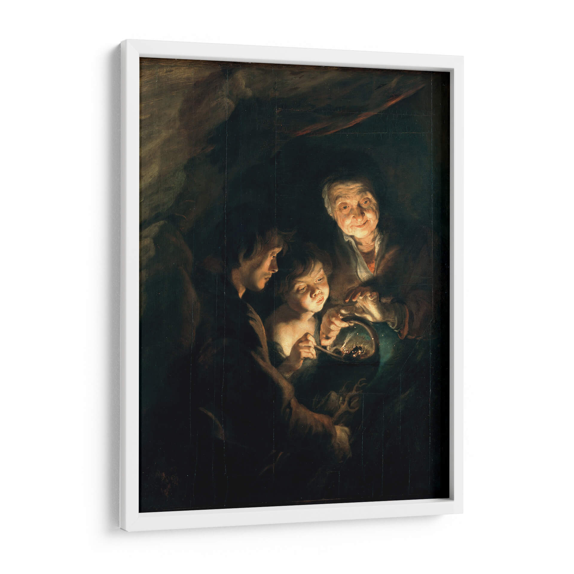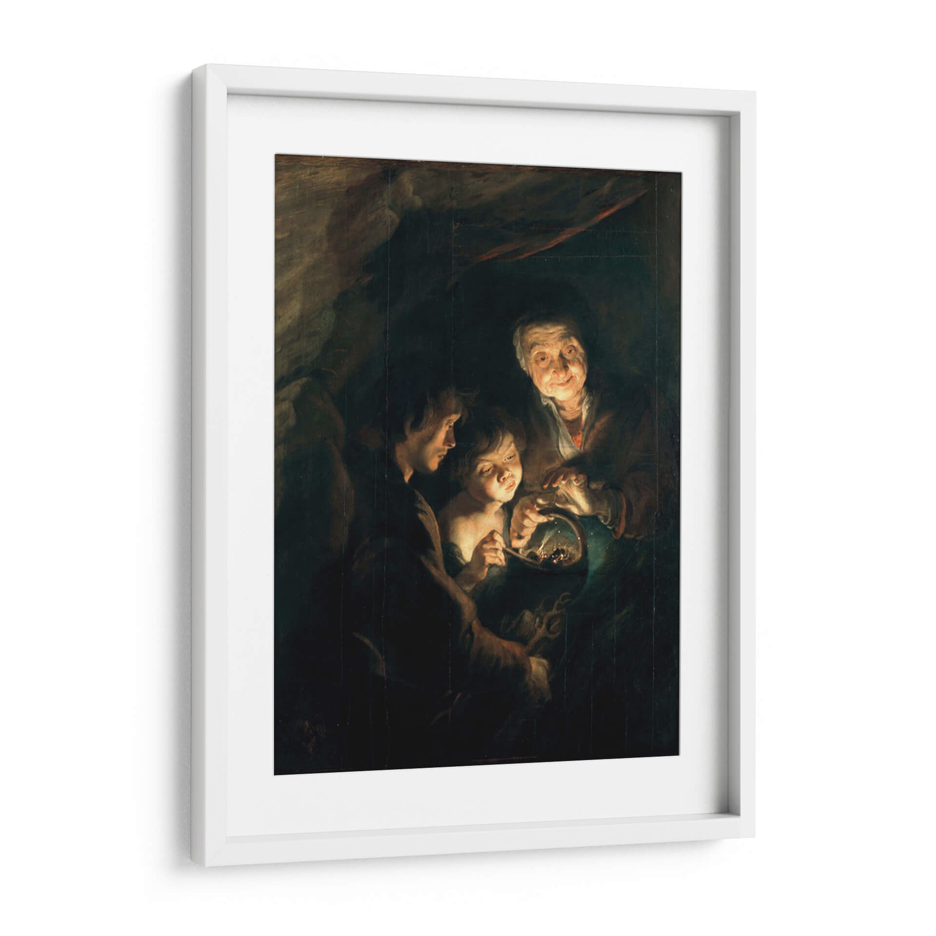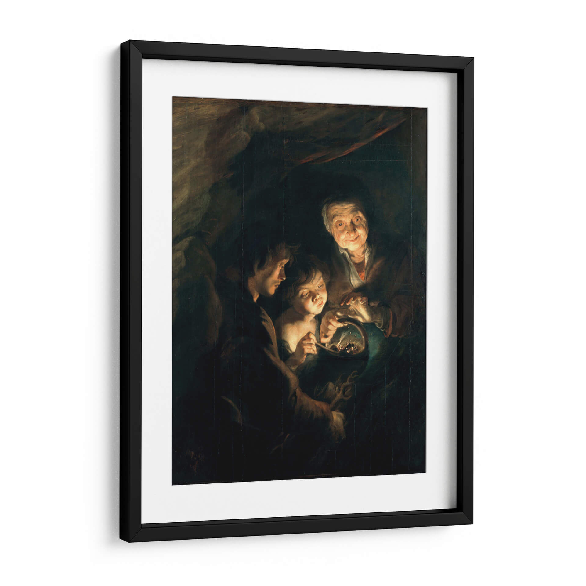 Sumérgete en la emotiva escena de 'Anciana con una cesta de carbón' de Peter Paul Rubens, una obra maestra que captura un momento íntimo y conmovedor. Este cuadro decorativo, con su característico claroscuro barroco, ilumina sutilmente los rostros de tres figuras reunidas alrededor de un pequeño cesto, creando una atmósfera de calidez y conexión humana a pesar de la penumbra circundante. La paleta de colores oscuros, dominada por tonos tierra y ocres, se ve contrastada por los puntos de luz que resaltan las expresiones de asombro y concentración en los rostros del niño y la joven, y la sonrisa bondadosa de la anciana. El estilo realista y la composición centrada invitan a la contemplación, haciendo de esta pieza un punto focal ideal para espacios que buscan evocar sentimientos de nostalgia, resiliencia y la belleza de los momentos cotidianos. Este impresionante cuadro decorativo es perfecto para añadir profundidad y carácter a salones, estudios o cualquier rincón de tu hogar donde desees inspirar calidez y reflexión. Un clásico que trasciende el tiempo, ideal para amantes del arte y decoradores que aprecian la maestría en la representación de la emoción humana.