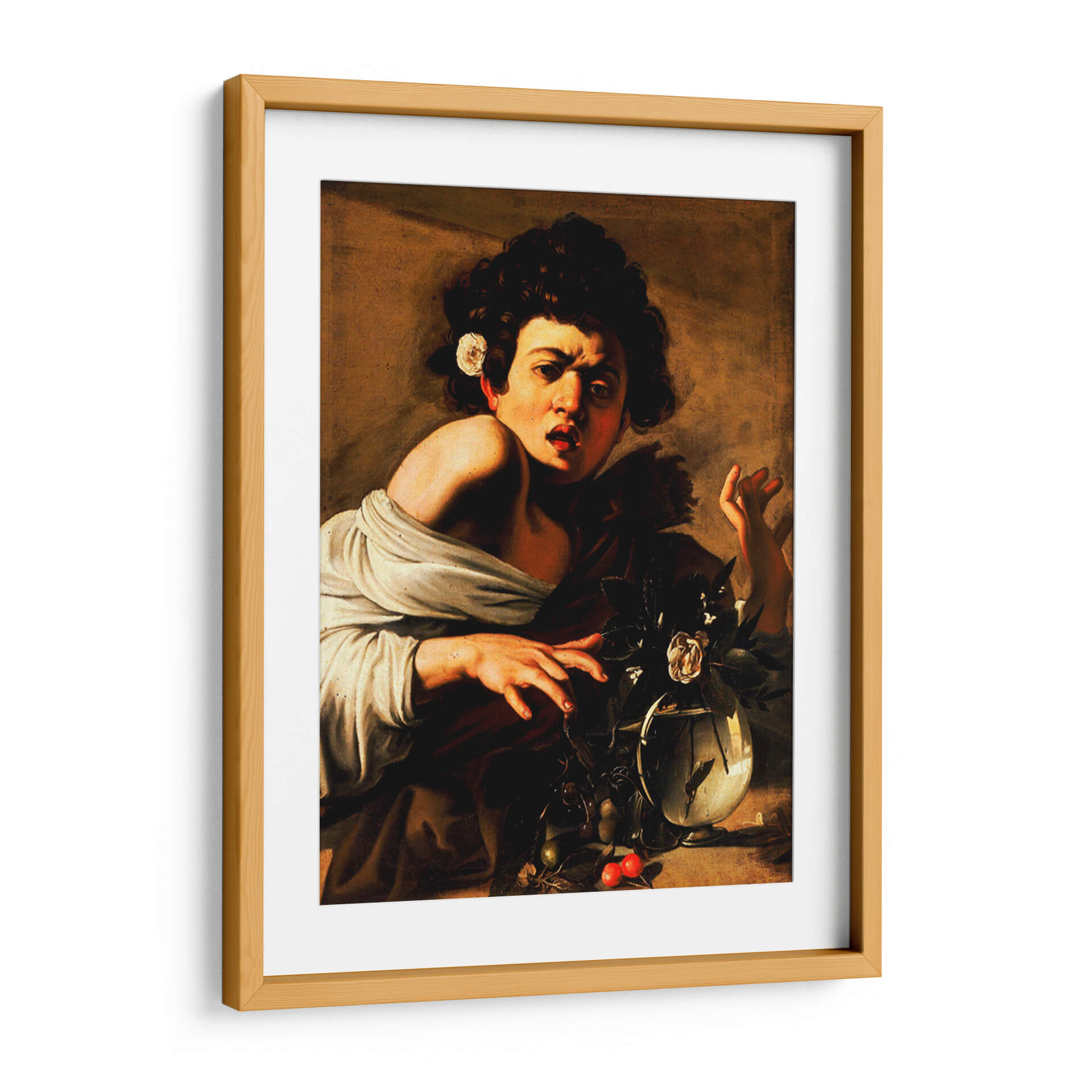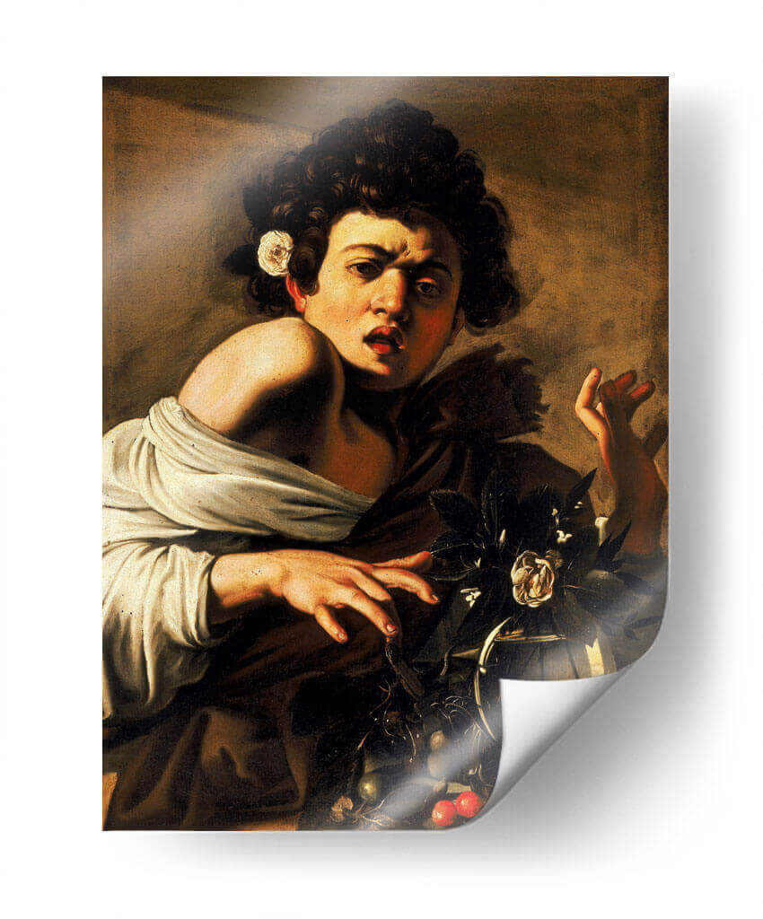 Sumérgete en la intensidad dramática del "Chico mordido por una lagartija" de Caravaggio, una obra maestra del Barroco que captura un momento de sorpresa y vulnerabilidad. Este cuadro decorativo presenta a un joven con una expresión de asombro y dolor, su piel pálida contrastando vívidamente con el fondo oscuro y los ricos tonos tierra. La composición, característica del tenebrismo de Caravaggio, utiliza el claroscuro para resaltar la figura central y crear una atmósfera de profunda emoción y realismo crudo. La delicada flor blanca en su cabello y la naturaleza muerta con frutas y una flor en un jarrón añaden elementos simbólicos y de belleza efímera que invitan a la reflexión. Ideal para quienes buscan arte con carácter y profundidad histórica, este cuadro transformará cualquier espacio, desde una sala de estar sofisticada hasta un estudio personal, aportando un toque de genialidad artística y un punto de conversación ineludible. Su impacto visual y narrativo lo convierten en una adición poderosa para cualquier colección de arte decorativo.