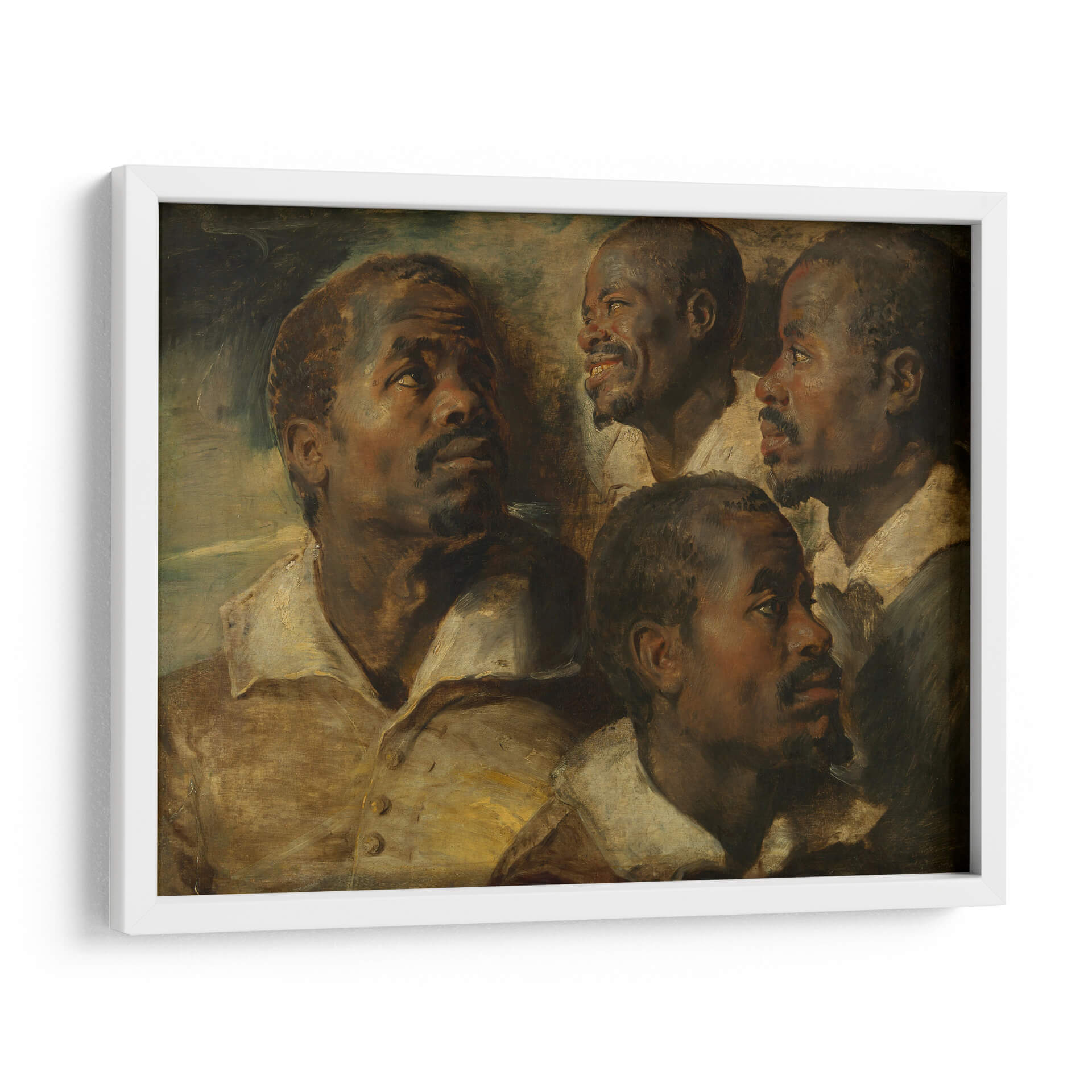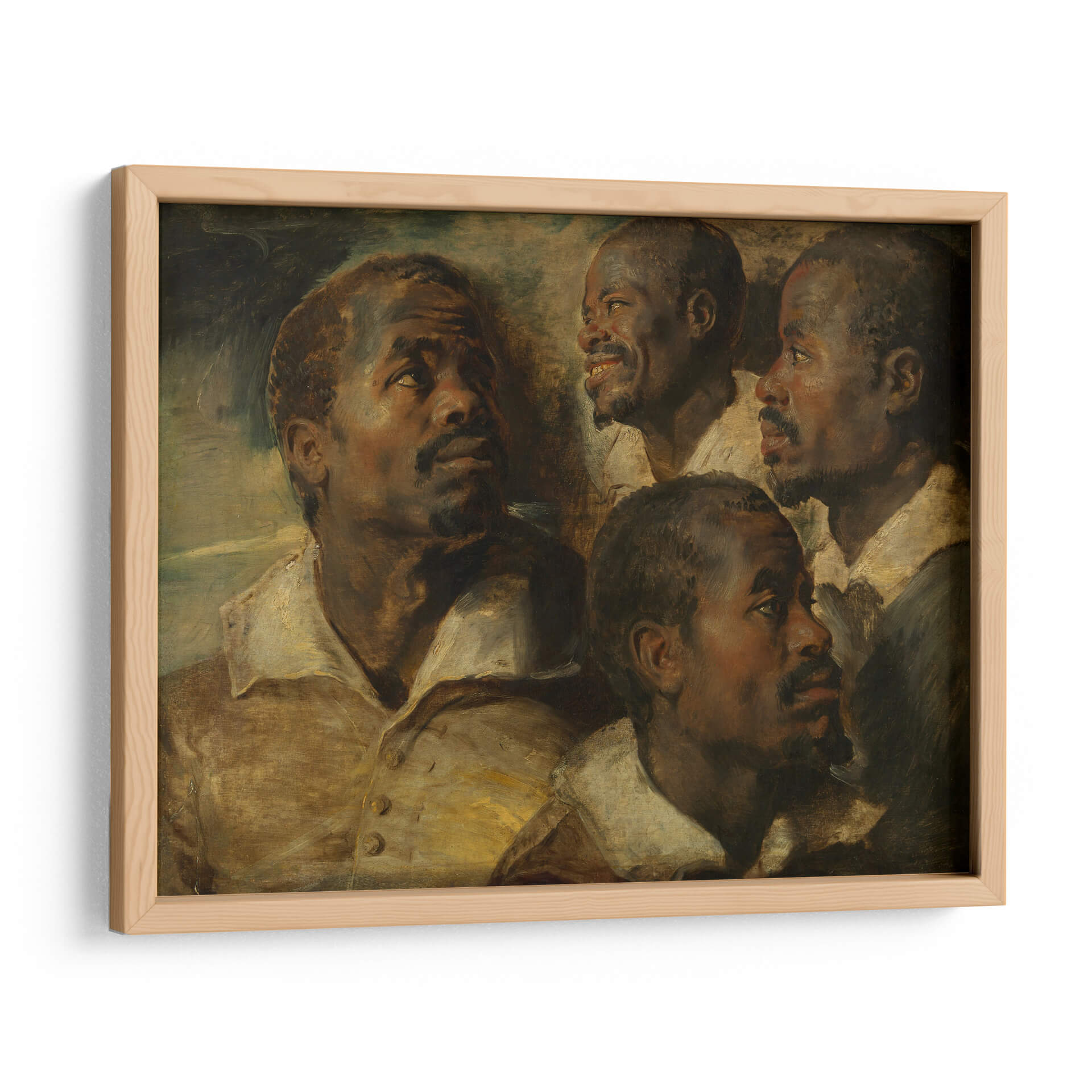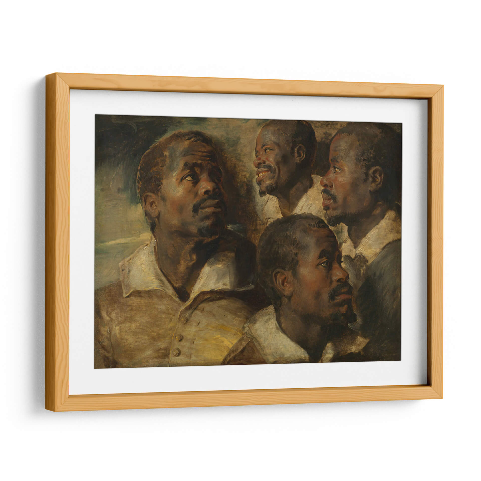 Sumérgete en la profundidad expresiva de "Cuatro estudios de una cabeza de un moro", una obra maestra que captura la intensidad y la humanidad a través de la maestría de Peter Paul Rubens. Este cuadro decorativo presenta un estudio detallado de rostros masculinos, cada uno con una expresión única que invita a la contemplación. La paleta de colores cálidos, dominada por tonos tierra y dorados, junto con un juego de luces y sombras dramático, confiere a la pieza una atmósfera rica y envolvente. El estilo barroco se manifiesta en la pincelada suelta y la composición dinámica, creando una sensación de movimiento y vida. Ideal para añadir un toque de clasicismo y profundidad a tu sala de estar, estudio u oficina, esta obra trasciende el tiempo, ofreciendo una conexión emocional y un punto focal de gran carácter. Es una pieza que inspira diálogo y aprecio por el arte clásico, aportando elegancia y sofisticación a cualquier espacio moderno o tradicional.