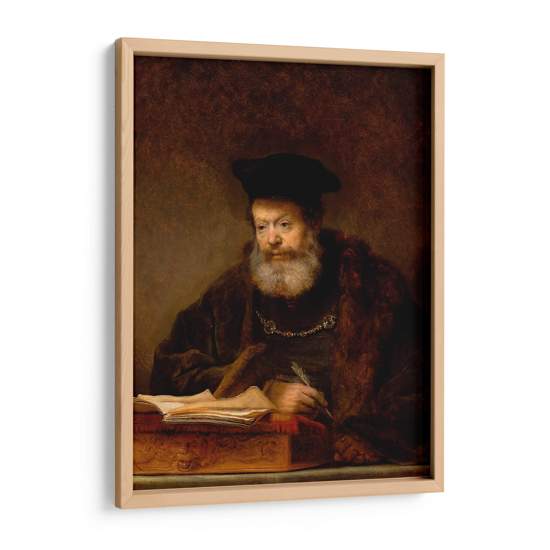 Sumérjase en la profundidad intelectual y la atmósfera sombría de "Erudito al atril", una obra maestra que evoca la esencia del estudio y la contemplación. Este cuadro decorativo presenta un retrato detallado de un hombre sabio, ataviado con un elegante sombrero y una lujosa capa de piel, inmerso en la lectura de un libro abierto ante él. La paleta de colores cálidos y terrosos, dominada por marrones profundos y ocres, crea un ambiente íntimo y reflexivo, típico del estilo barroco de Rembrandt. La iluminación sutil, que resalta el rostro del erudito y el brillo del pergamino, añade un toque de realismo y dramatismo. La composición, centrada en la figura y sus manos, invita a la meditación sobre el conocimiento y la sabiduría. Ideal para espacios que buscan transmitir serenidad, intelecto y un toque de historia, como una biblioteca personal, un estudio o un rincón de lectura acogedor. Este cuadro decorativo es perfecto para aquellos que aprecian el arte clásico y buscan añadir una pieza con carácter y profundidad a su decoración.