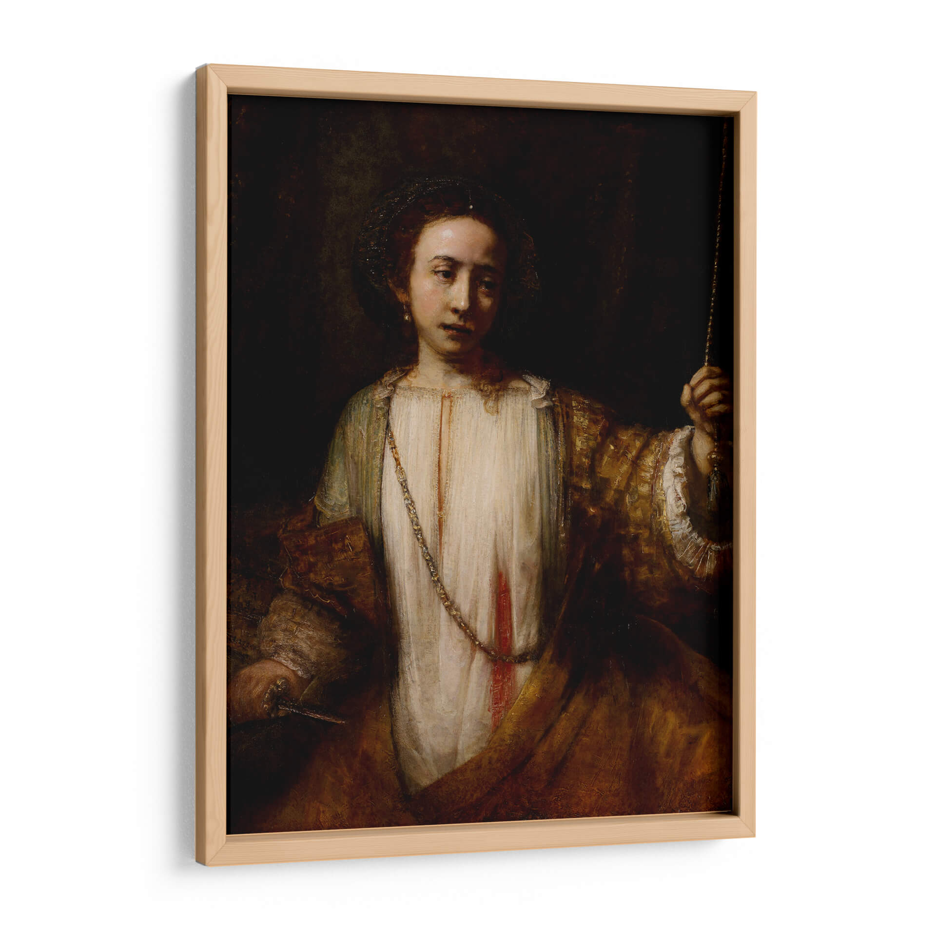 Sumérgete en la intensidad dramática de "Lucrecia" de Rembrandt, una obra maestra del Barroco que captura un momento de profunda introspección y determinación. Este cuadro decorativo reproduce la icónica figura de Lucrecia, representada con una luz tenue que resalta su rostro expresivo y su vestimenta ricamente detallada, evocando una atmósfera de solemnidad y coraje. La paleta de colores cálidos y oscuros, característica del genial pintor, crea un ambiente íntimo y poderoso, invitando a la contemplación de la historia y la emoción que la obra encierra. "Lucrecia" es más que una simple imagen; es una pieza que añade profundidad y carácter a cualquier espacio, ideal para salones, estudios o cualquier lugar donde se desee un toque de arte clásico y narrativo. Su composición centrada y la mirada directa de la figura la convierten en un punto focal cautivador que dialoga con el espectador. Añade a tu decoración un fragmento de la historia del arte, una obra que inspira respeto y admira la fuerza del espíritu humano.