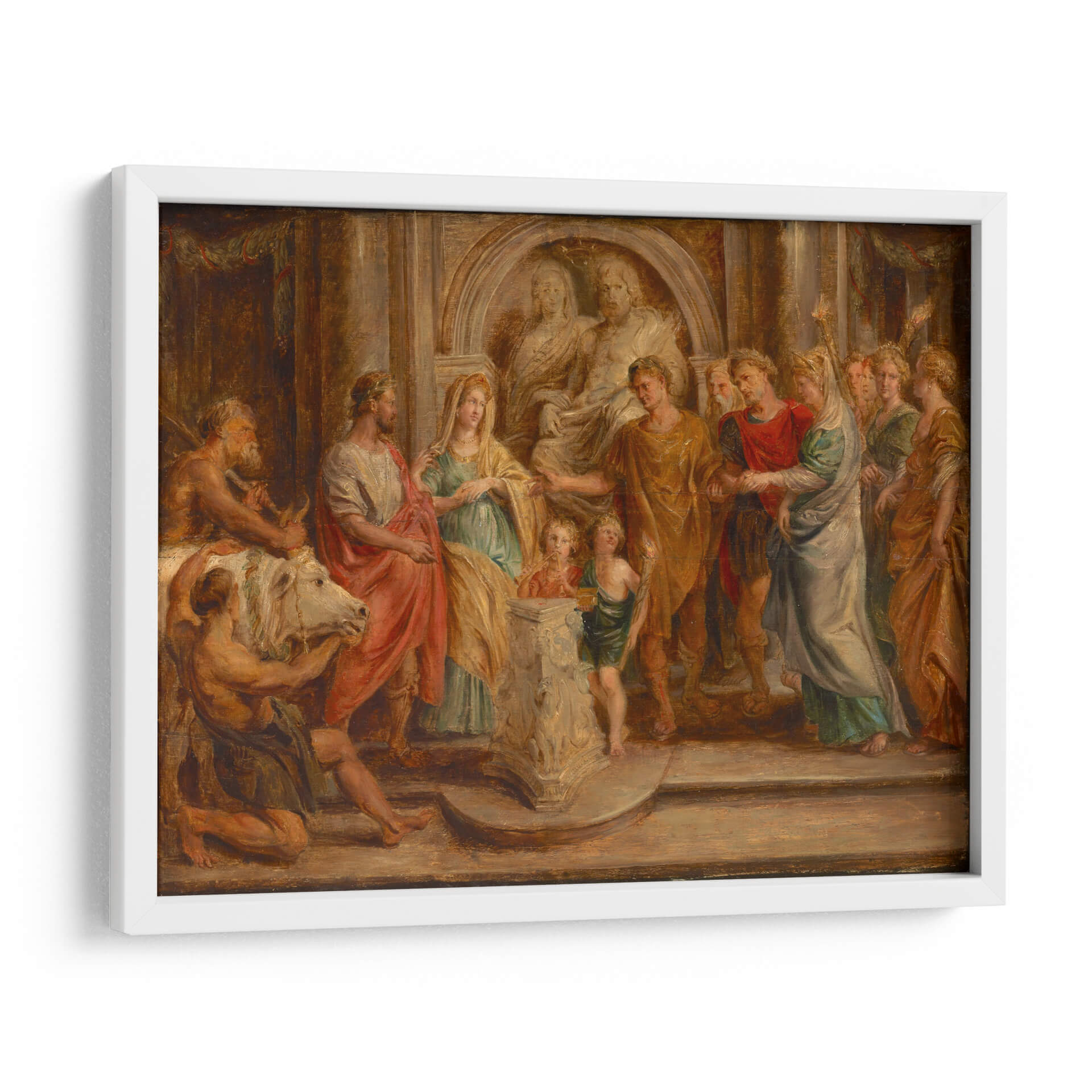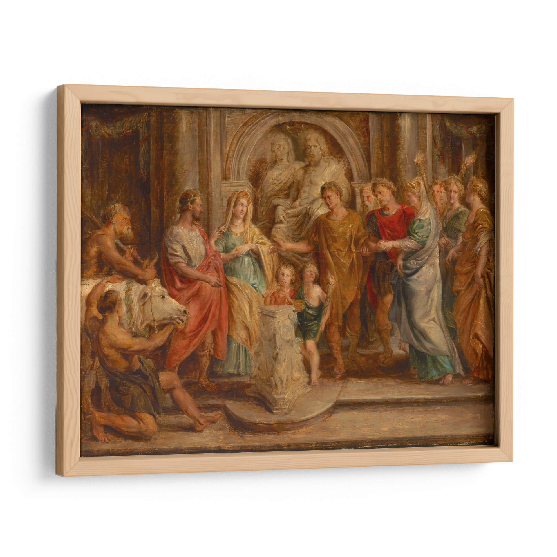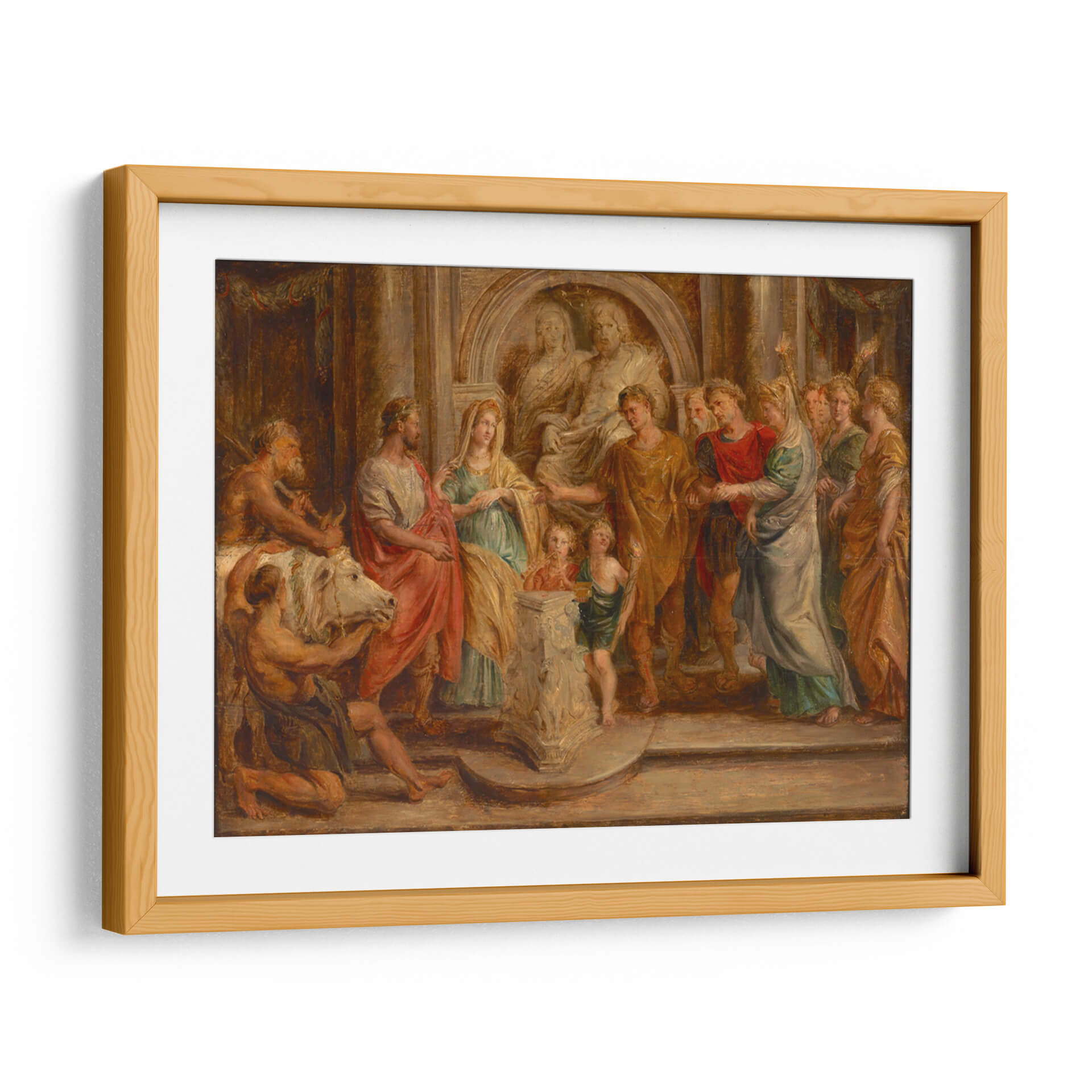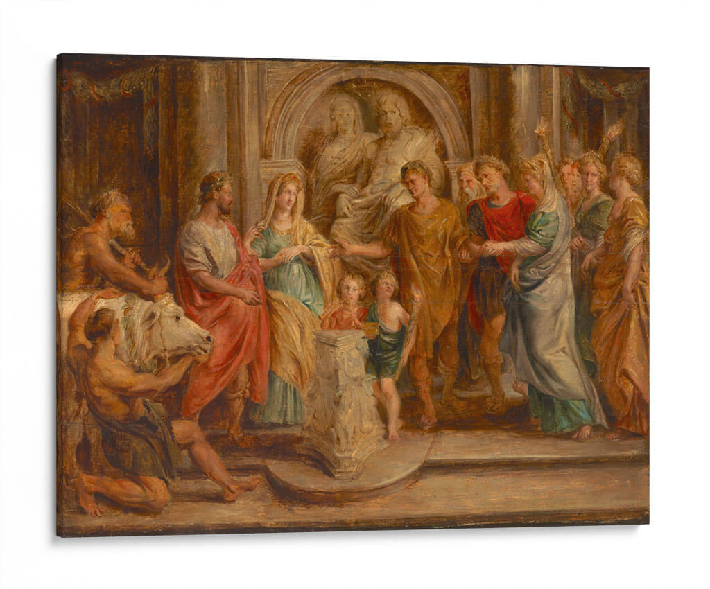Sumérgete en la magnificencia de "Matrimonio de Constantino", una obra maestra del renombrado artista Peter Paul Rubens, capturada aquí como una impresionante pieza de arte decorativo de pared. Esta pintura evoca una rica narrativa histórica, presentando una escena dinámica y emotiva con figuras vestidas con túnicas de la época, dispuestas en una composición teatral que dirige la mirada del espectador a través de la narrativa. Los colores cálidos y terrosos predominan, con toques de rojo vibrante y verde azulado que añaden profundidad y contraste, creando una atmósfera de solemnidad y celebración. El juego de luces y sombras realza el dramatismo de la escena, destacando las expresiones y gestos de los personajes. El estilo barroco de Rubens se manifiesta en la abundancia de detalles, la fluidez de las telas y la energía palpable de la composición. Este cuadro decorativo es ideal para añadir un punto focal de interés y sofisticación a salones, comedores o estudios, transportando a quienes lo contemplen a una época de gran esplendor y significado histórico. Su presencia aportará elegancia clásica y un toque de drama a cualquier espacio, convirtiéndose en una pieza central de conversación y admiración.