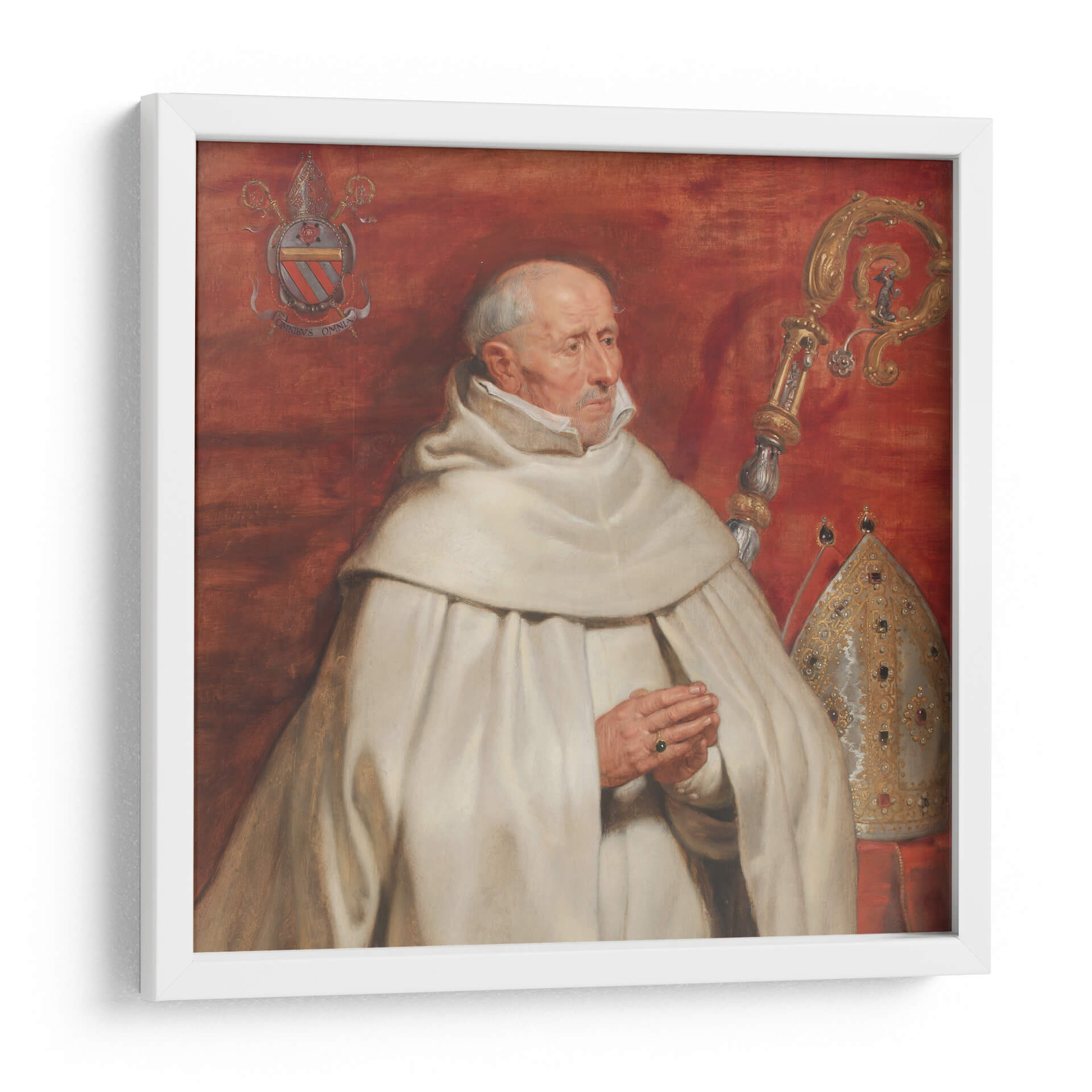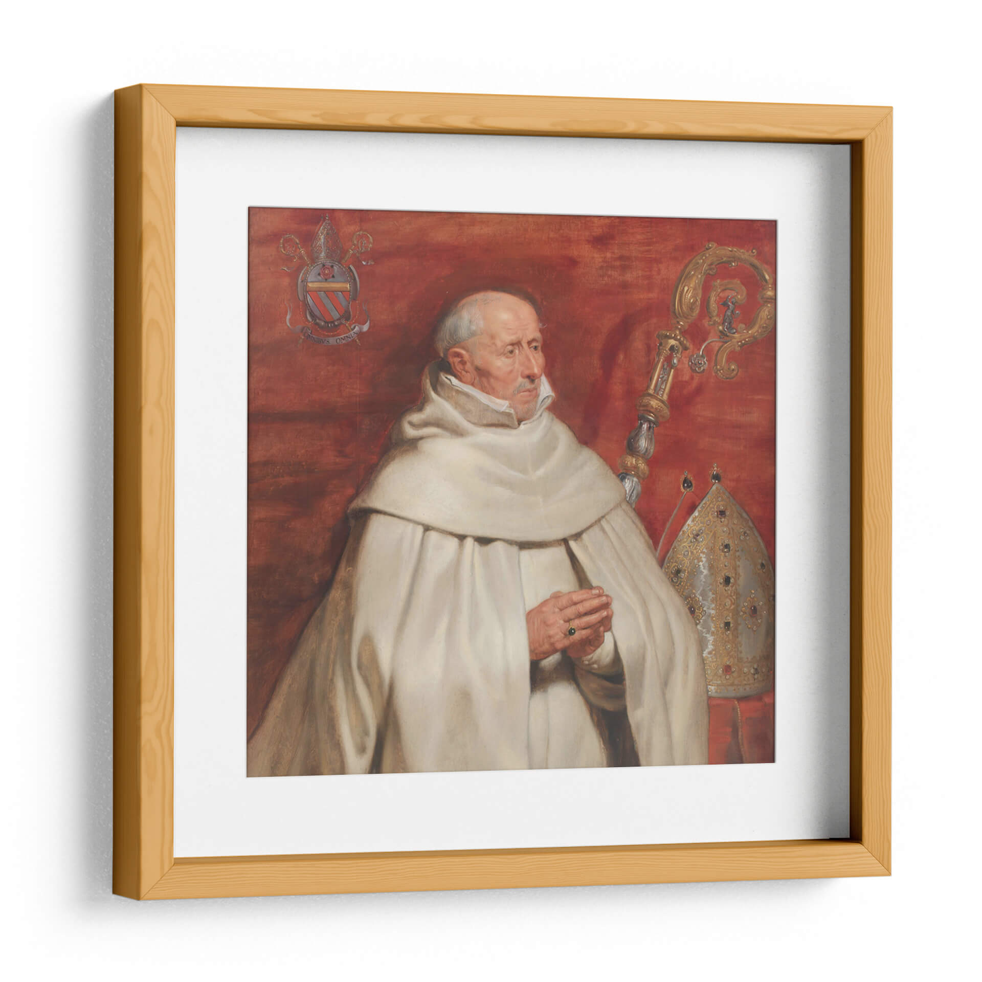 Este cautivador cuadro decorativo es un retrato magistral del Abad Matthaeus Yrsselius, obra del renombrado artista Peter Paul Rubens. La pieza se sumerge en la solemnidad y la devoción a través de su detallada representación. El personaje principal viste un hábito monacal blanco de amplios pliegues, contrastando vivamente con el profundo fondo rojo que envuelve la escena, aportando una sensación de calidez y autoridad. La expresión del abad, con las manos entrelazadas en oración y una mirada introspectiva, transmite una profunda espiritualidad y serenidad. A su lado, elementos simbólicos como un báculo episcopal ricamente ornamentado y una mitra, acentúan su alta investidura y su papel eclesiástico. La paleta de colores, dominada por los rojos intensos y los blancos puros, junto con toques dorados en los atributos, crea una atmósfera rica y atemporal. Este retrato clásico es ideal para espacios que buscan evocar reflexión, historia y elegancia, como estudios, bibliotecas o salones de estilo tradicional, aportando un toque de sofisticación y profundidad cultural a cualquier ambiente. Una pieza que invita a la contemplación y al aprecio por el arte histórico y religioso.