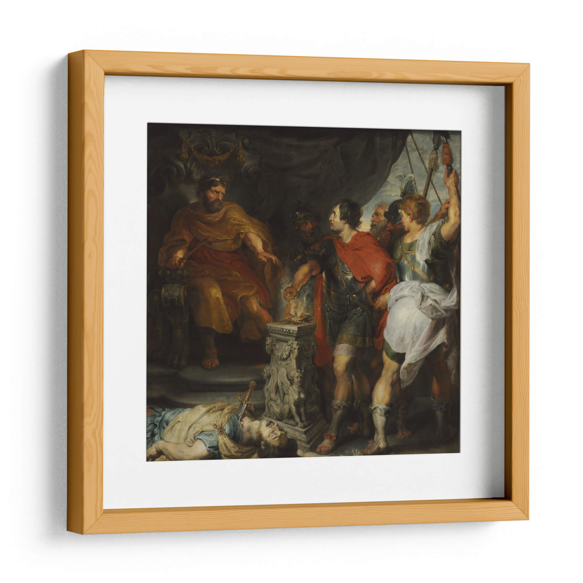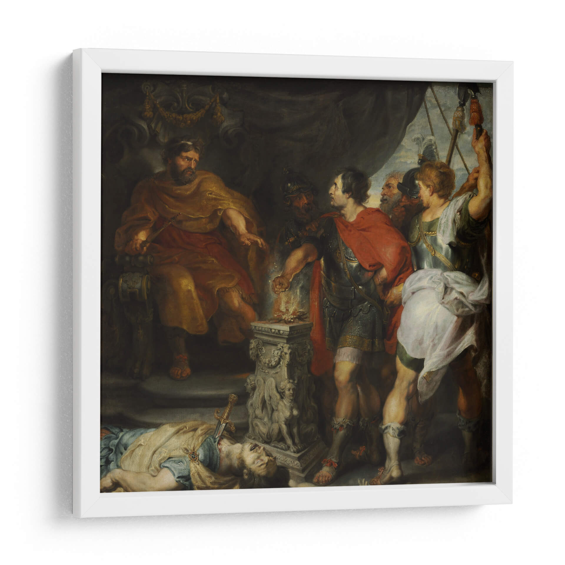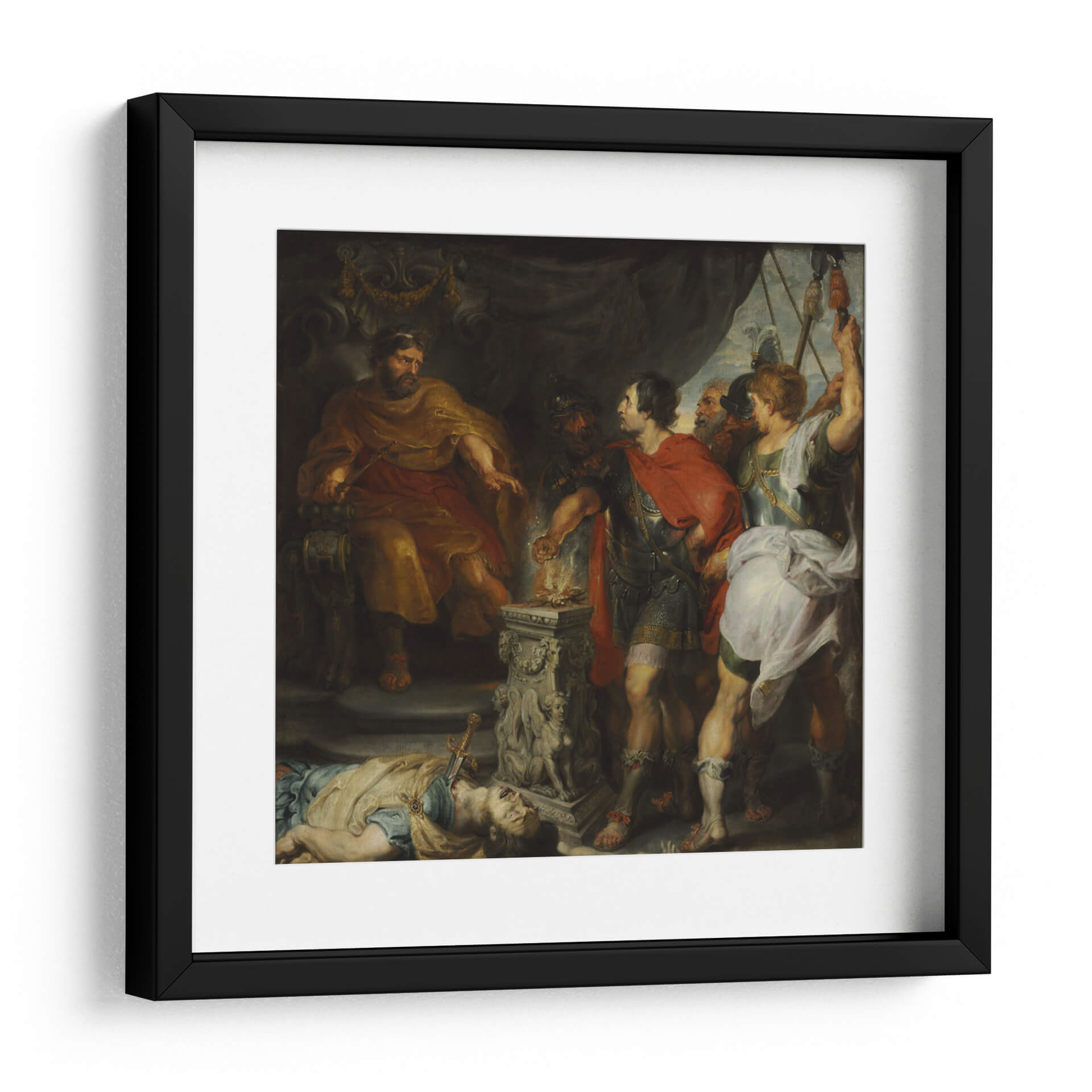 Sumérgete en la intensidad dramática de 'Mucio Escévola ante Lars Porsena', una obra maestra que captura un momento pivotal de valentía y sacrificio. Esta impactante pieza visual presenta a Mucio Escévola, el joven romano, realizando un acto de audacia suprema al introducir su mano en el fuego frente al rey etrusco Lars Porsena. La composición, rica en detalles y dinamismo, típica del estilo barroco de Peter Paul Rubens, se caracteriza por sus figuras musculares, expresiones emotivas y un juego de luces y sombras que acentúa el dramatismo de la escena. Los colores cálidos, dominados por ocres, rojos intensos y dorados, contrastan con las sombras profundas, creando una atmósfera de tensión y heroísmo. El manejo de la tela, con drapeados fluidos y armaduras relucientes, añade una textura visual cautivadora. Este cuadro decorativo es ideal para espacios que buscan un toque de historia, fuerza y deliberación. Ya sea en un estudio, una biblioteca o una sala de estar formal, esta obra infunde carácter y conversación, invitando a la reflexión sobre el coraje y la determinación inquebrantable. Una elección excepcional para quienes aprecian el arte clásico y las narrativas poderosas.