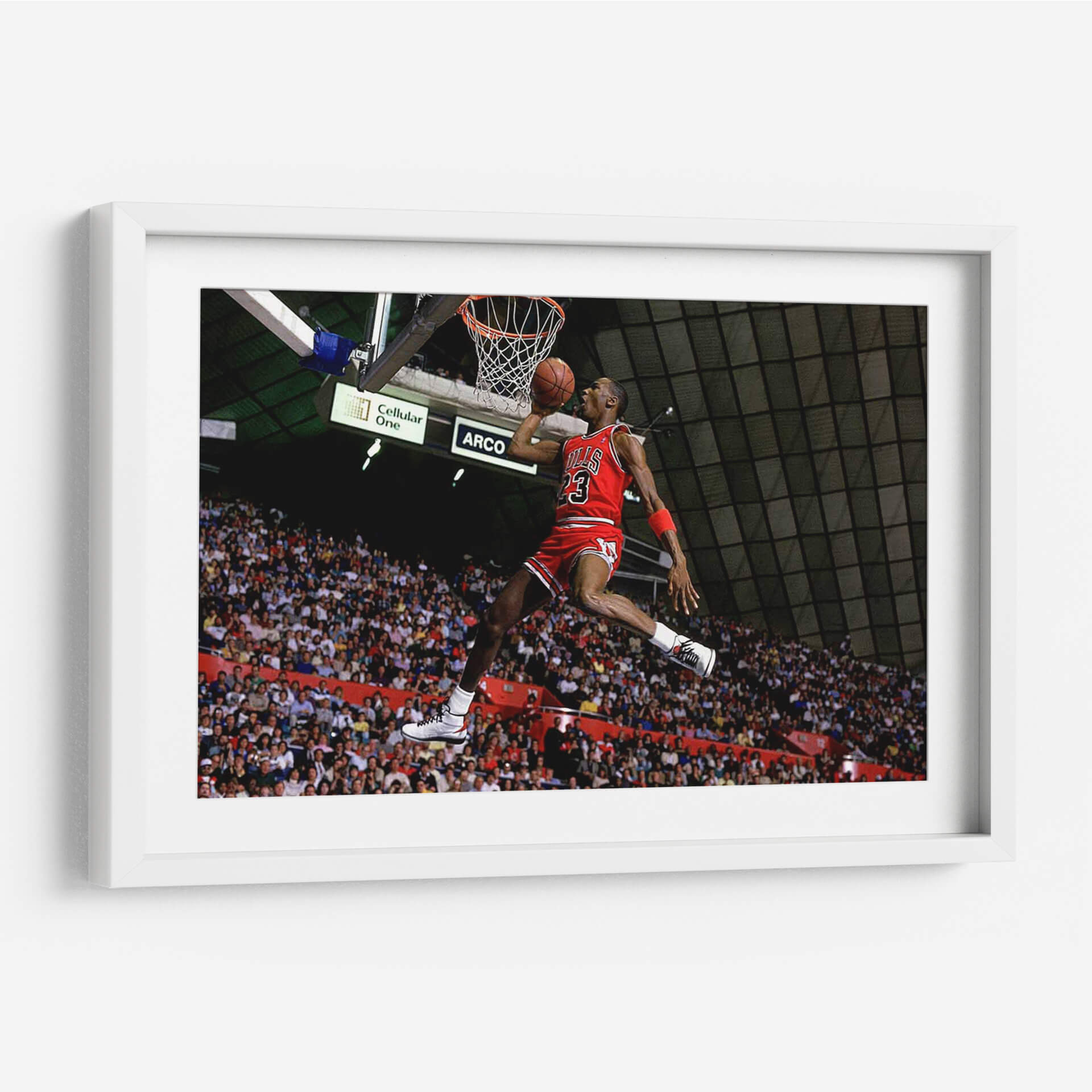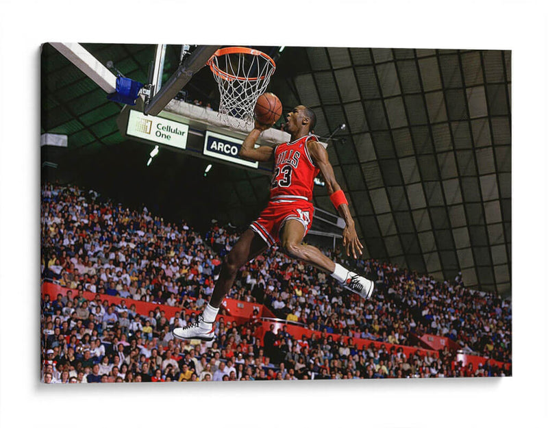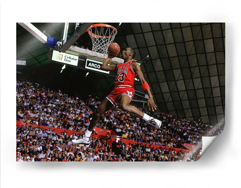 Captura la icónica energía del deporte con este impactante cuadro decorativo del legendario "1987 Slam Dunk Michael Jordan". Esta obra visualmente dinámica inmortaliza uno de los momentos más emocionantes del baloncesto, mostrando al jugador en pleno vuelo hacia la canasta, con la determinación y habilidad que lo definieron. La composición se centra en la figura atlética, destacando su movimiento y concentración, mientras la multitud vibrante en el fondo añade una atmósfera de expectación y celebración. La paleta de colores, dominada por los rojos intensos del uniforme, los tonos tierra del balón y los verdes y grises del pabellón, crea un contraste visual potente que atrae la mirada. Este cuadro es perfecto para revivir la gloria deportiva y añadir un toque de inspiración y dinamismo a cualquier espacio, ya sea una sala de estar moderna, una oficina o una sala de juegos. Ideal para los amantes del baloncesto y del arte que aprecian los momentos históricos y las figuras icónicas. Transforma tu pared en un homenaje a la leyenda.
