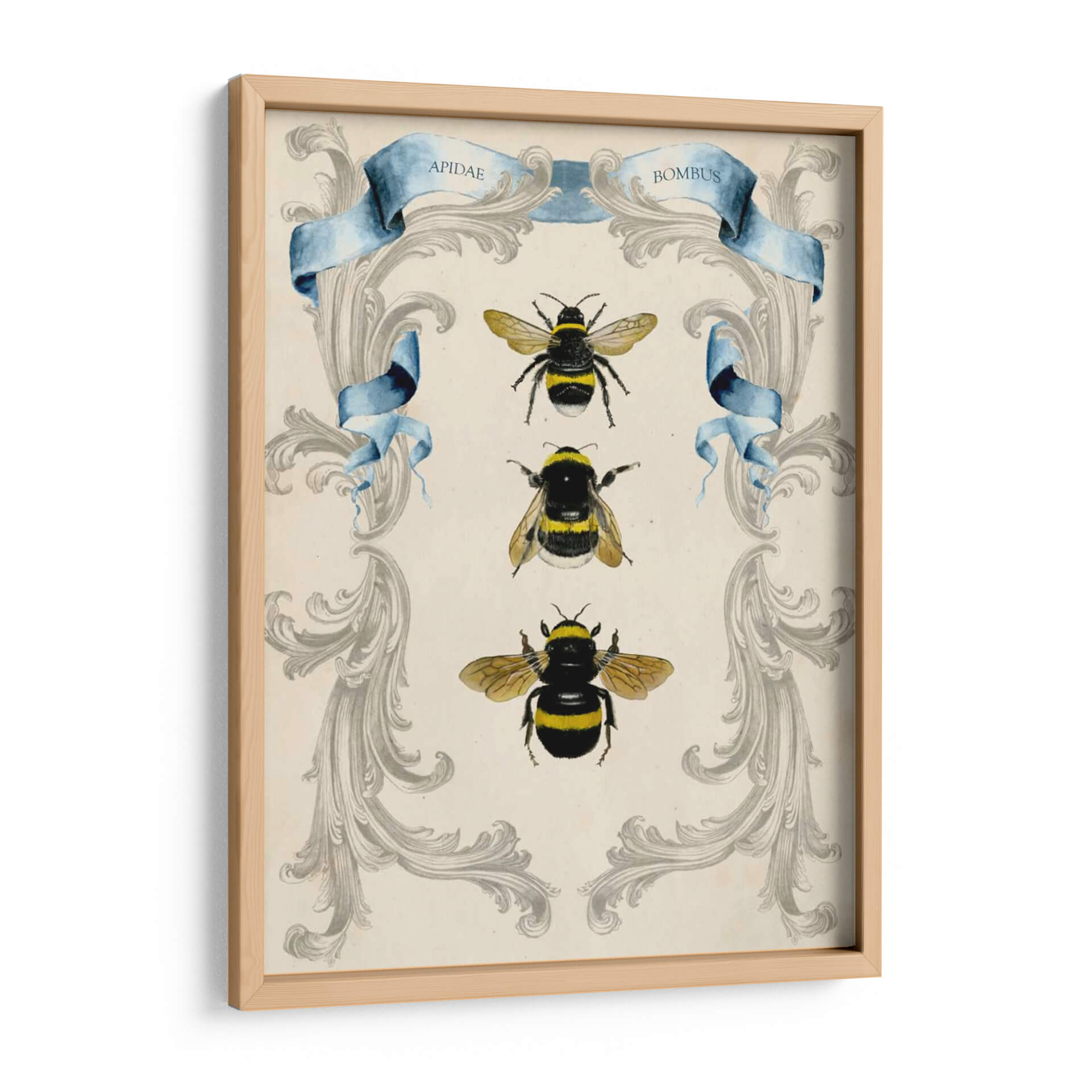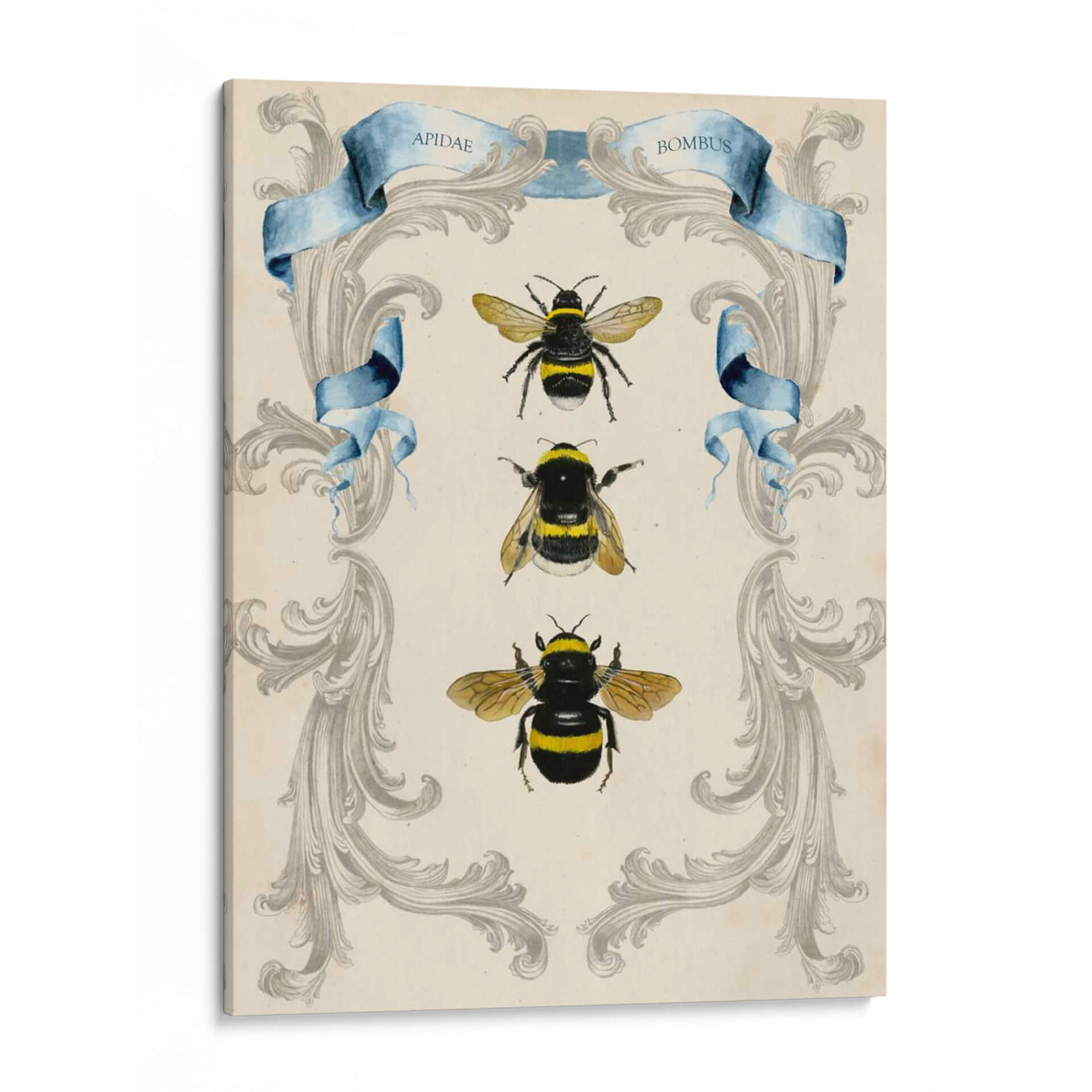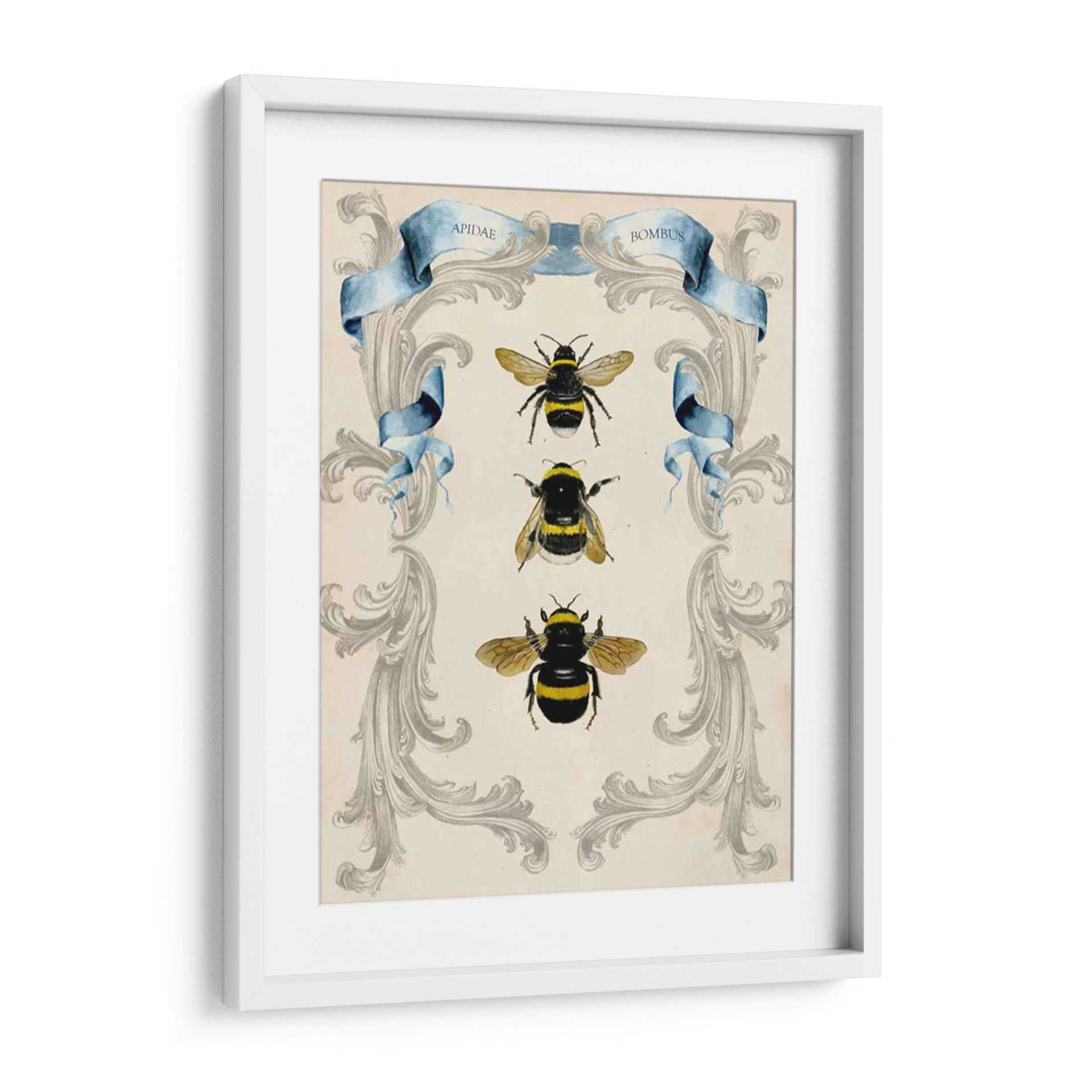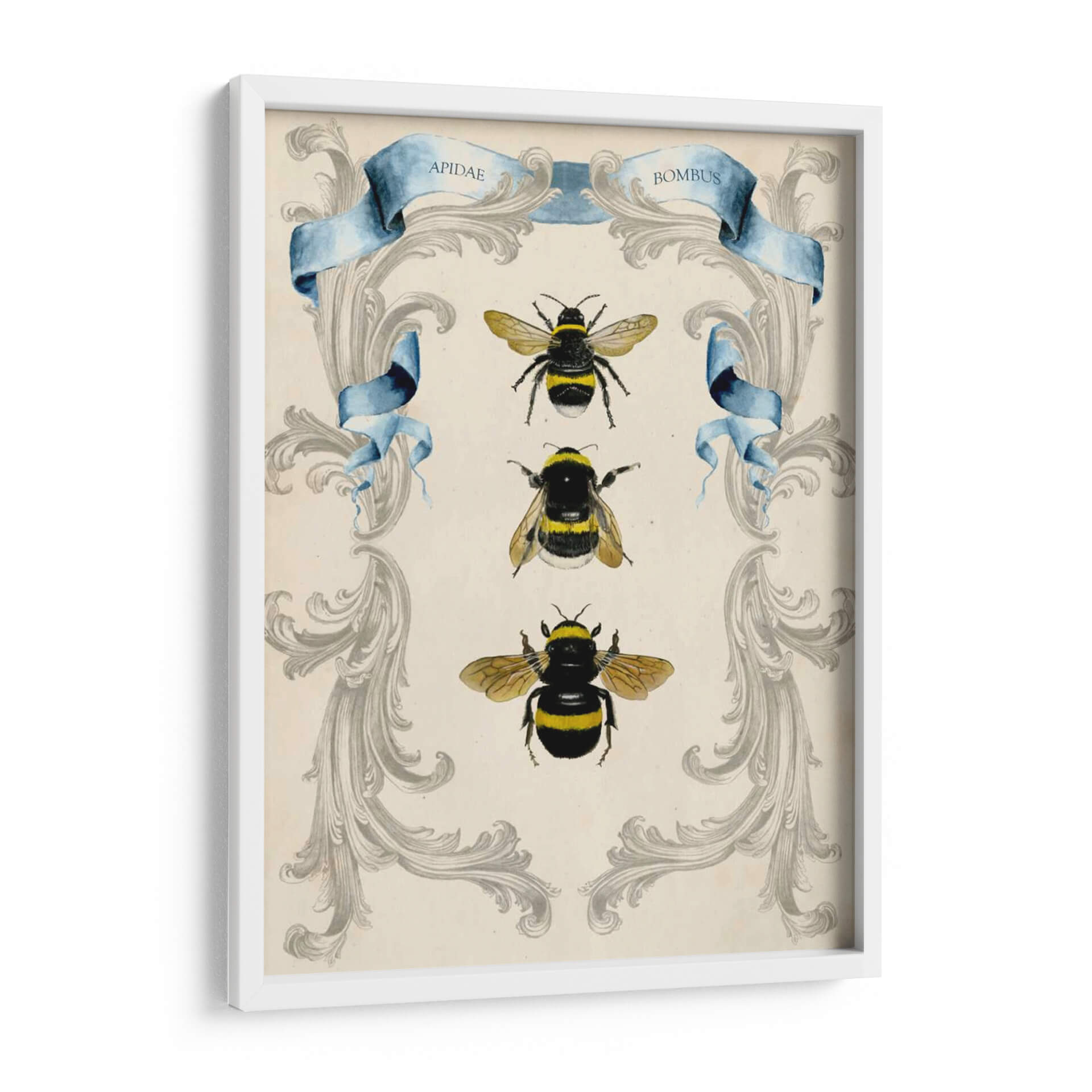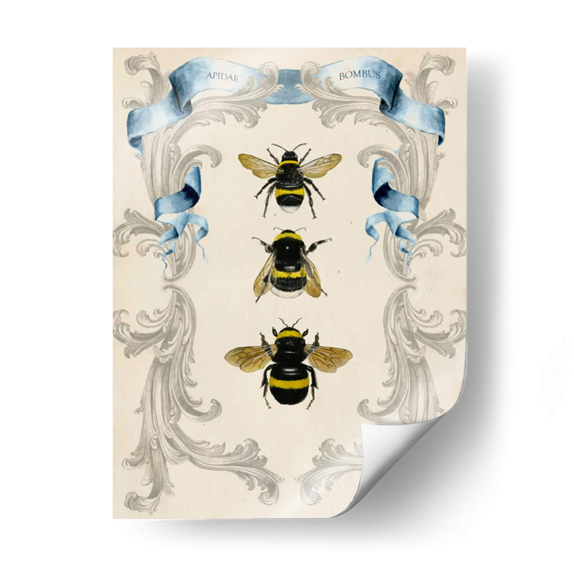 Sumérgete en la fascinante belleza del mundo natural con este cautivador cuadro decorativo de abejas, una obra maestra de Naomi McCavitt. La pieza presenta una delicada filigrana en tonos grises sobre un fondo de pergamino, enmarcando elegantemente tres ilustraciones detalladas de abejas en diferentes poses. Los vibrantes acentos amarillos y negros de las abejas contrastan sutilmente con la serena paleta de colores, creando un equilibrio visual armonioso. La inclusión de cintas de acuarela azul con inscripciones latinas añade un toque de clasicismo y conocimiento científico, evocando un sentido de la historia natural y la taxonomía. Este cuadro decorativo es perfecto para aquellos que aprecian la intrincada perfección de la naturaleza y buscan infundir a su hogar u oficina una sensación de orden, curiosidad y conexión con el medio ambiente. Su estilo, que combina elementos de ilustración científica vintage con un diseño decorativo moderno, lo convierte en una pieza versátil, ideal para espacios que buscan un toque de sofisticación, interés visual y un guiño a la importancia de estos polinizadores esenciales. Añade un toque de elegancia natural a tu decoración con esta pieza única.