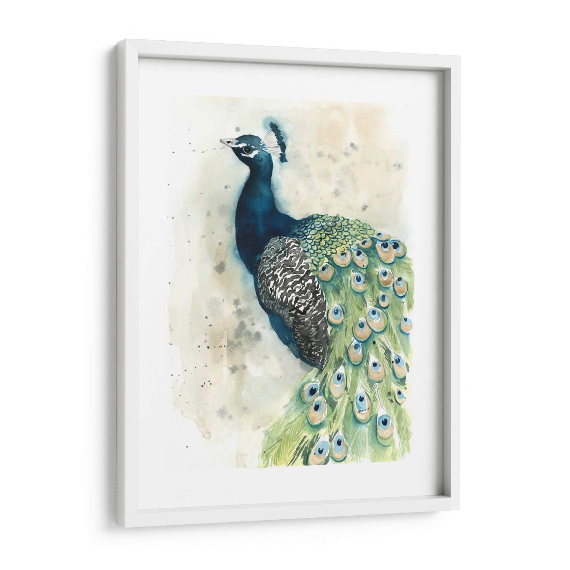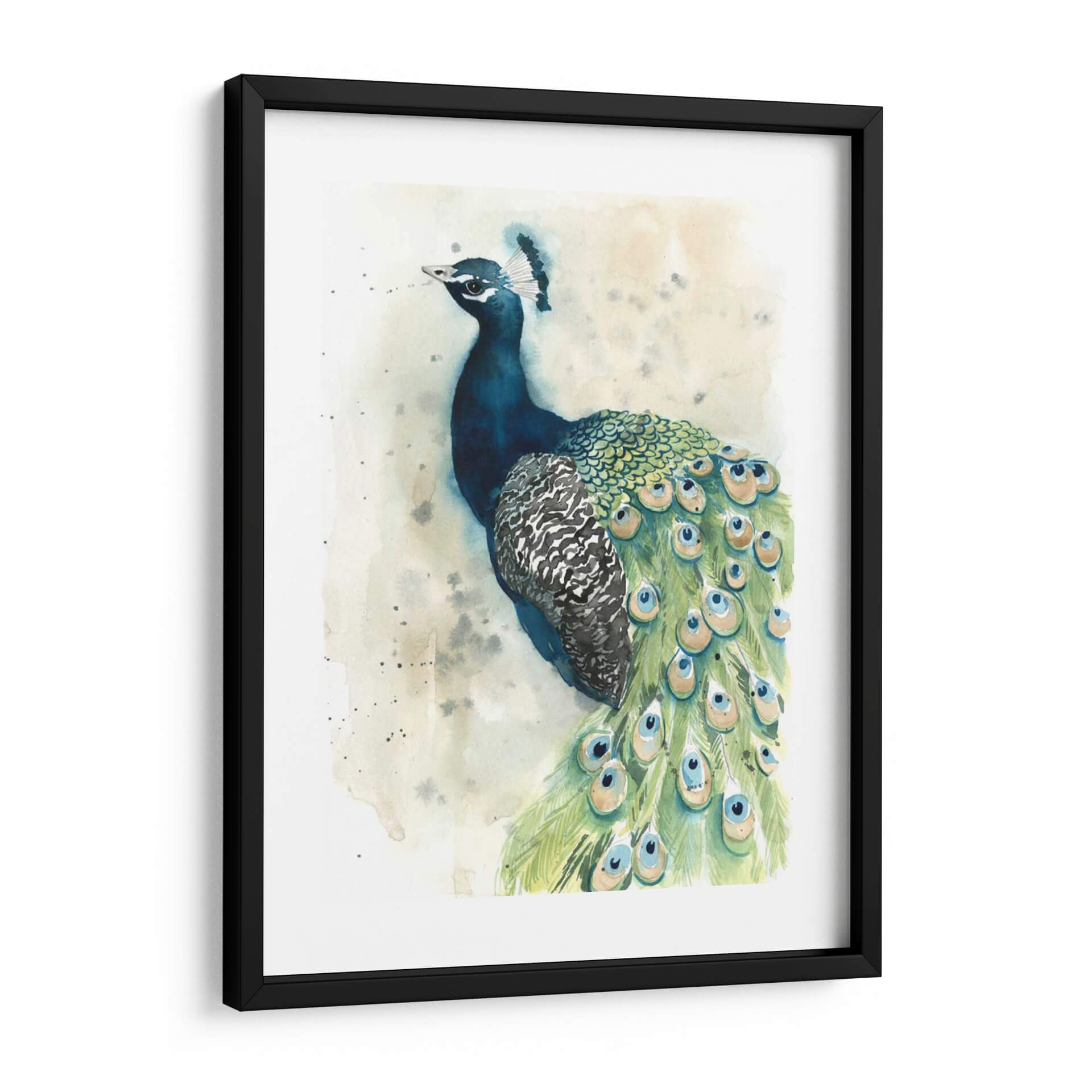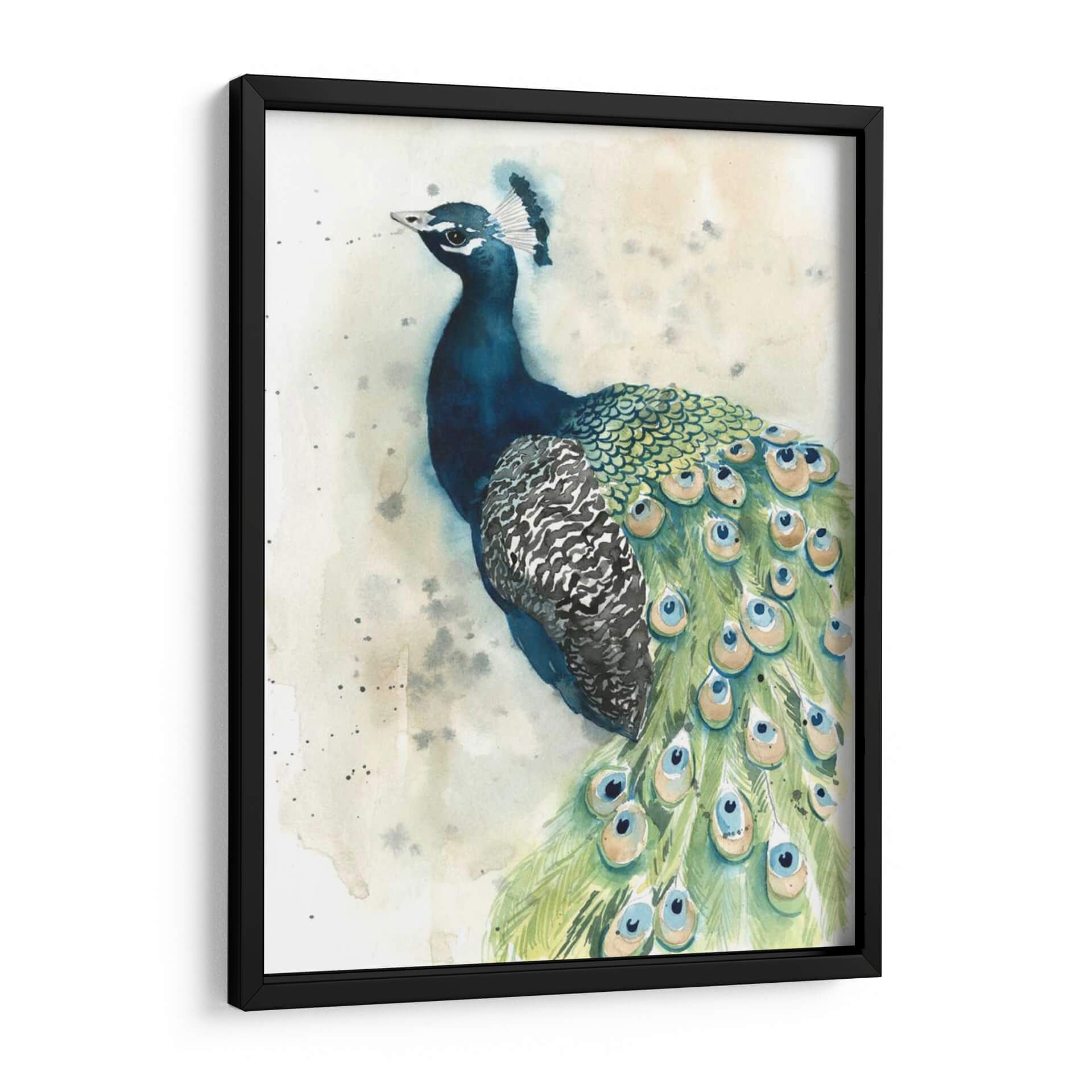 Aporta un toque de elegancia y color a tu hogar con "Acuarela Peacock Retrato II", una obra maestra de Grace Popp que captura la majestuosidad de un pavo real en acuarela. Esta pieza, que destaca por su detallado retrato del ave y el despliegue de su suntuoso abanico de plumas, es una explosión de tonos verdes, azules y ocres, con sutiles toques de negro y blanco que aportan profundidad y contraste. La técnica de acuarela confiere a la obra una ligereza y fluidez únicas, creando un ambiente etéreo y sereno. Los detalles intrincados de cada pluma, con sus característicos "ojos", se fusionan con un fondo texturizado y salpicado, que evoca la naturaleza y el arte abstracto. Este cuadro decorativo es ideal para añadir un punto focal vibrante a cualquier habitación, desde salones modernos hasta dormitorios que buscan un toque de sofisticación natural. Su estilo figurativo con toques abstractos lo hace versátil, complementando tanto decoraciones contemporáneas como clásicas. "Acuarela Peacock Retrato II" no es solo una imagen, es una invitación a la contemplación de la belleza natural y el arte con una ejecución delicada y expresiva, perfecta para quienes aprecian la fauna y el arte contemporáneo.
