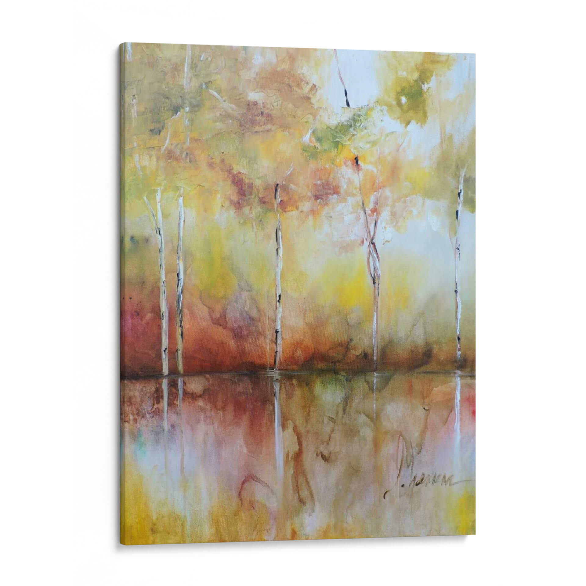 Sumérgete en la serenidad y el color con "Alazanas II", una obra maestra de Leticia Herrera que captura la esencia de un paisaje otoñal reflejado en aguas tranquilas. Esta pieza evoca una atmósfera de calma y reflexión, ideal para transformar cualquier espacio en un santuario de paz y belleza. La paleta de colores, dominada por cálidos tonos tierra, ocres, amarillos dorados y toques de rojo profundo, se mezcla con pinceladas sueltas y emotivas que dan vida a los troncos esbeltos de los árboles y al agua serena que los rodea. La técnica impresionista y el juego de luces y sombras crean una profundidad visual cautivadora, invitando al espectador a perderse en sus matices. "Alazanas II" es más que un simple cuadro decorativo; es una ventana a un momento de paz natural, perfecta para añadir un toque de sofisticación y calidez a tu sala de estar, dormitorio u oficina. Su estilo versátil permite que se integre armoniosamente en decoraciones contemporáneas, rústicas o bohemias, convirtiéndose en un punto focal que inspira tranquilidad y conexión con la naturaleza. Añade esta obra de arte única a tu colección y deja que su belleza atemporal enriquezca tu hogar, creando un ambiente acogedor y lleno de arte.