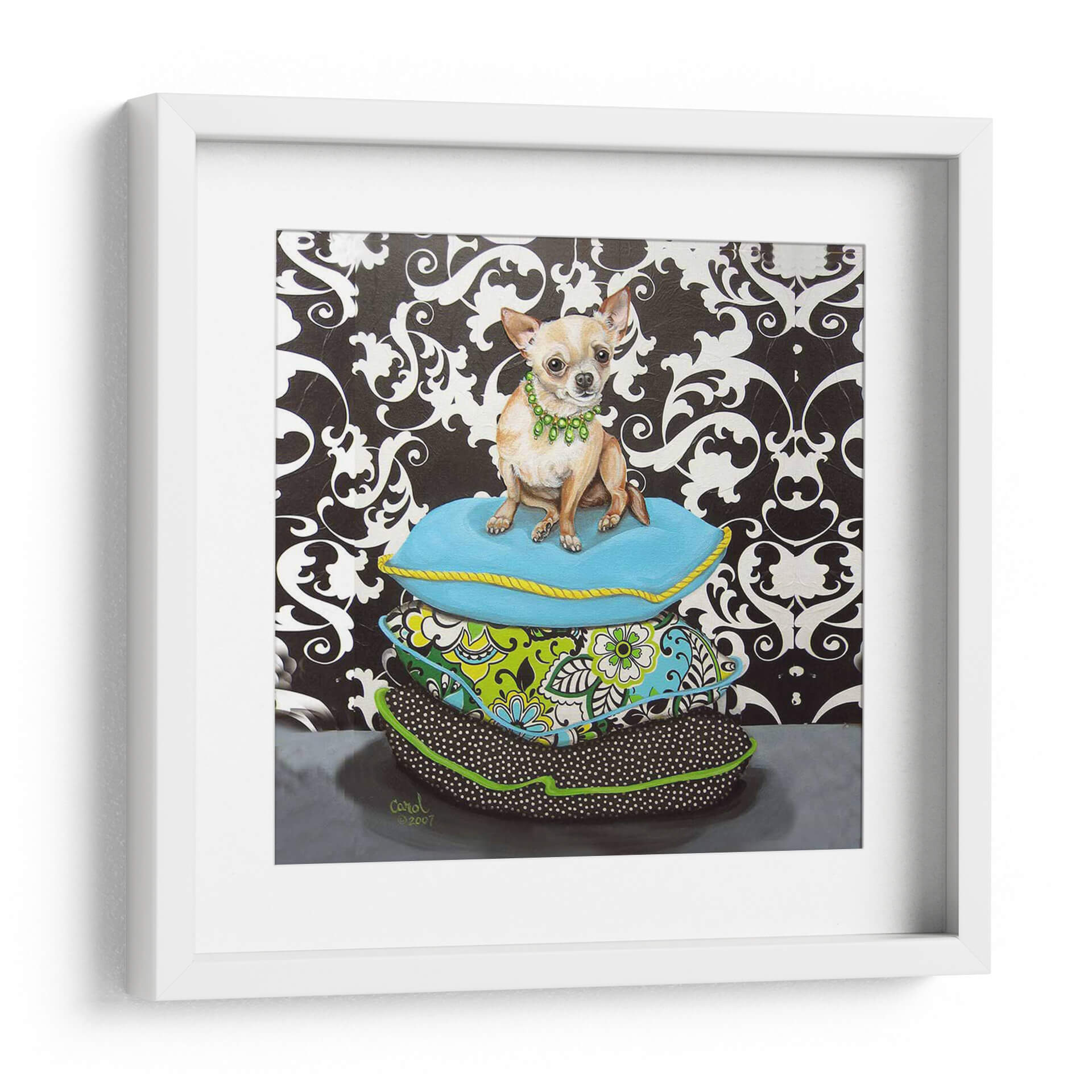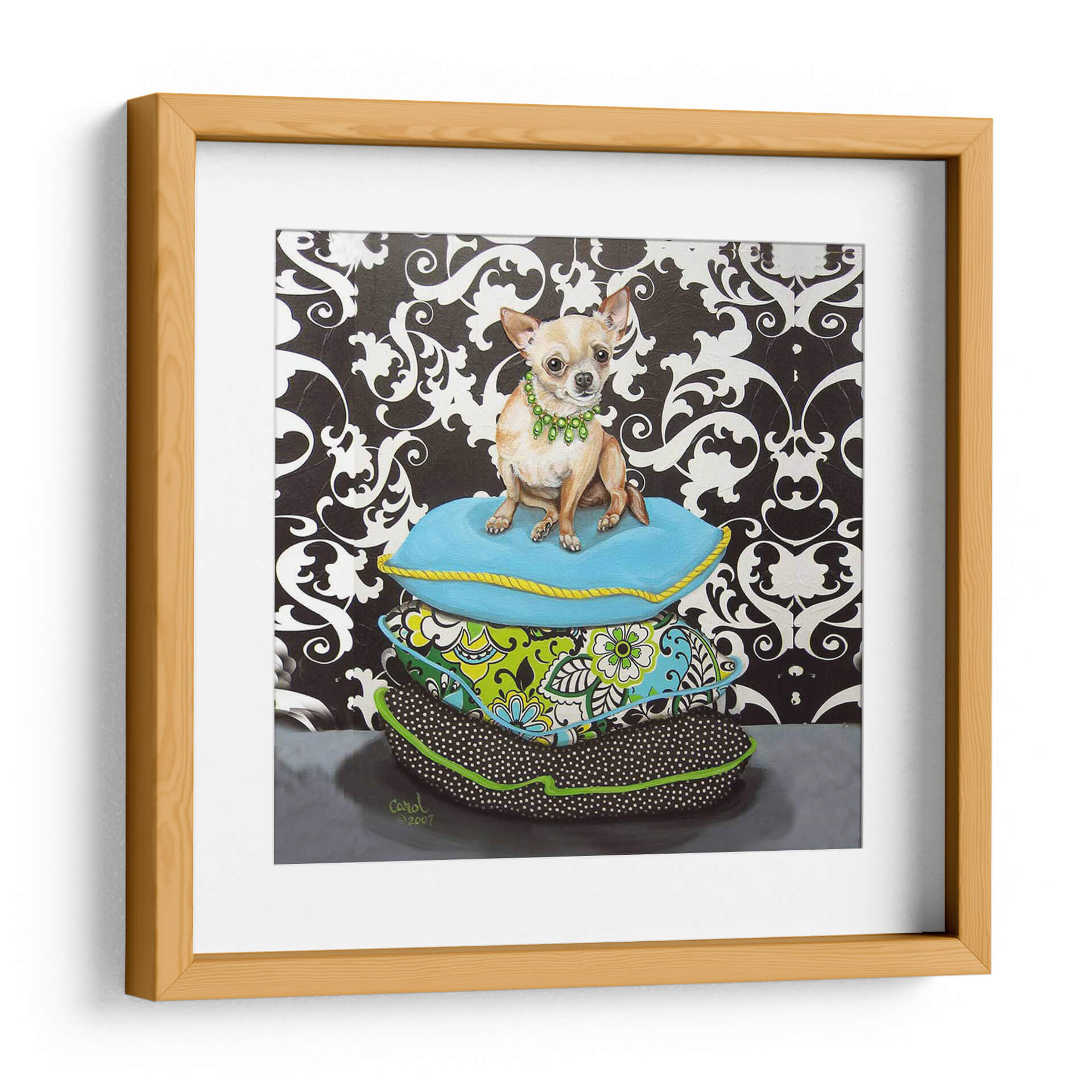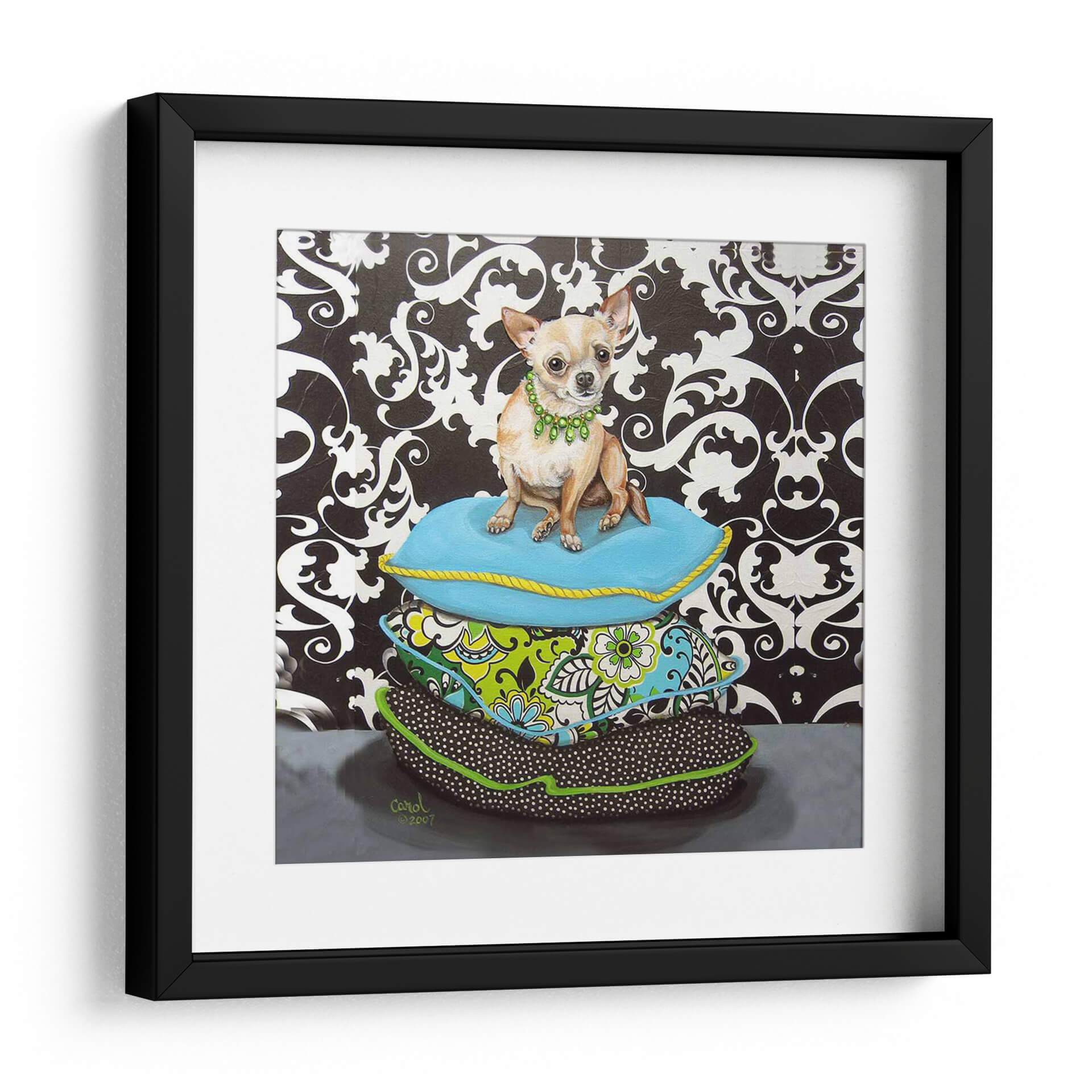 Inmortaliza el encanto y la personalidad única de tu compañero canino con "Almohadas De Chihuahua I", una obra de arte vibrante y llena de carácter de Nina Ramos. Este cautivador cuadro decorativo presenta a un adorable chihuahua sentado con gracia sobre una pila de cojines de colores. La atención al detalle en la textura del pelaje del perro, junto con el brillo de su collar de cuentas, añade una dimensión de realismo juguetón. El fondo contrasta con un elegante patrón damasco en blanco y negro, creando un telón de fondo sofisticado que realza la figura central. La paleta de colores, dominada por el azul vibrante de los cojines, el verde esmeralda del collar y los patrones intrincados en tonos azules y verdes, aporta un toque de vitalidad y estilo. Esta pieza es ideal para los amantes de los perros y aquellos que aprecian el arte con un toque de humor y elegancia. "Almohadas De Chihuahua I" es perfecta para añadir un acento de color y personalidad a cualquier sala de estar, dormitorio o estudio, convirtiéndose en un punto focal que sin duda generará conversación. Su estilo único lo hace adecuado para una decoración contemporánea, ecléctica o incluso clásica, aportando un elemento inesperado y encantador a tu espacio.