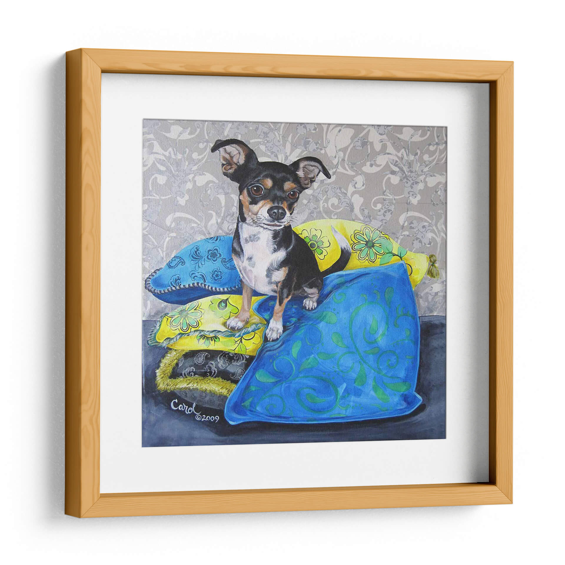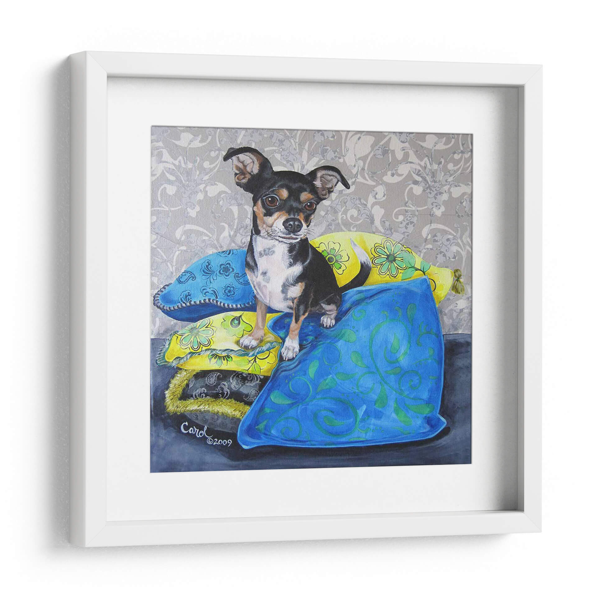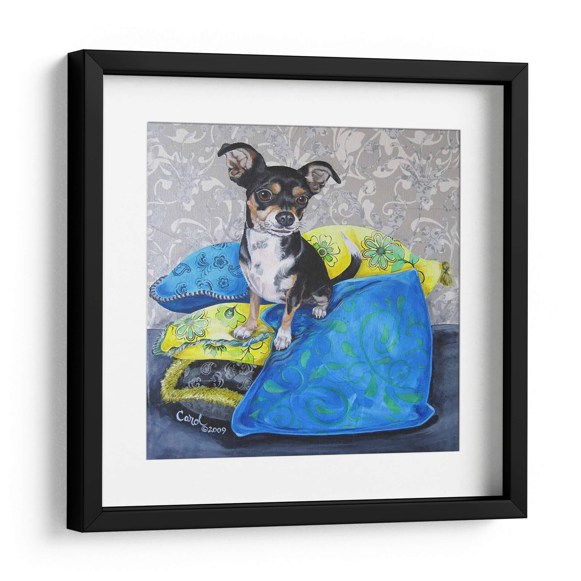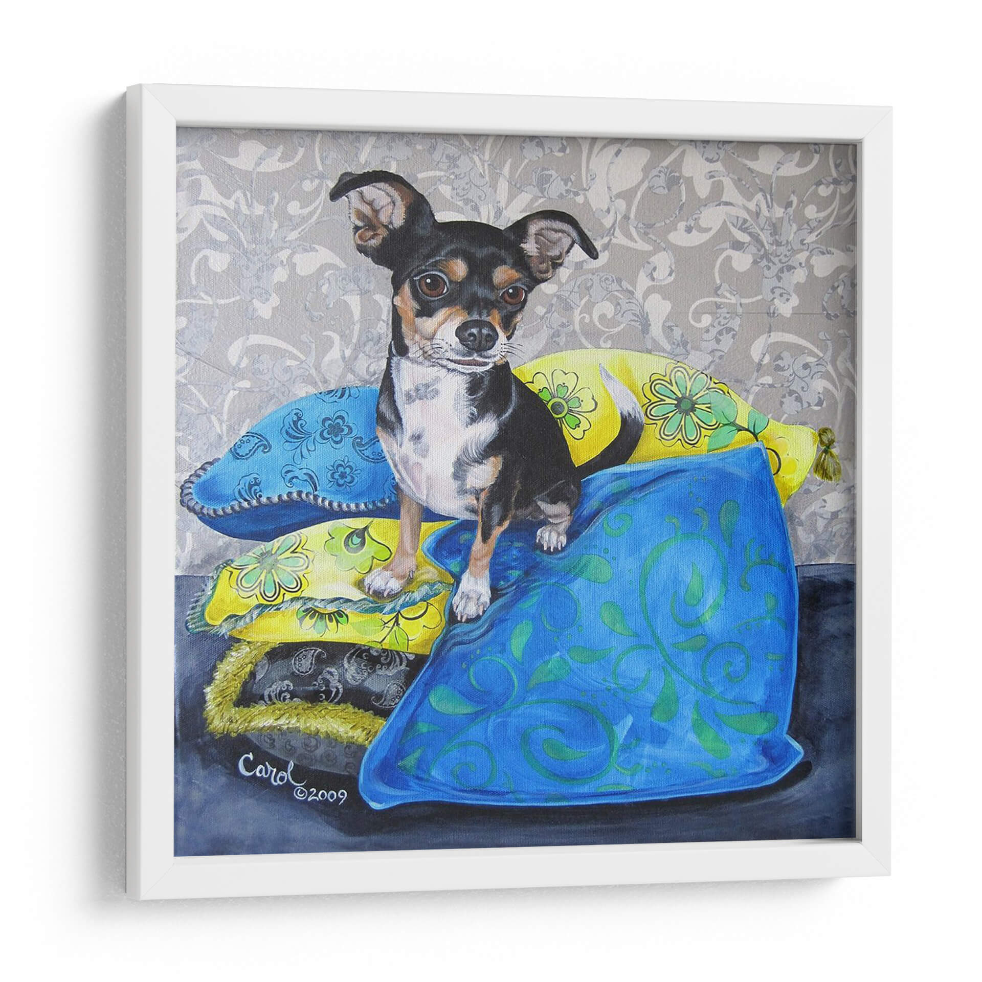 Captura la esencia juguetona y el encanto inconfundible de "Almohadas De Chihuahua Ii", una obra de arte de Nina Ramos que celebra la lealtad y el espíritu vivaz de las mascotas. Esta pieza presenta a un adorable Chihuahua sentado con gracia sobre una pila de cojines coloridos, cada uno adornado con patrones intrincados y vibrantes. La paleta de colores se centra en azules profundos y amarillos alegres, contrastando con el fondo de damasco gris, creando una atmósfera acogedora y llena de personalidad. La técnica pictórica detallada resalta la textura de los cojines y la expresión expresiva del perro, invitando al espectador a una conexión emocional. Ideal para amantes de los animales y aquellos que buscan añadir un toque de calidez y color a su hogar u oficina, este cuadro decorativo es perfecto para espacios que buscan un punto focal encantador. Su estilo figurativo con toques decorativos lo hace versátil para salones, dormitorios o incluso estudios. Añade un aire de sofisticación desenfadada a tu decoración con esta pieza única que evoca alegría y confort, convirtiéndose en un tema de conversación instantáneo y un reflejo del amor por nuestros compañeros caninos. Una obra que trasciende la mera decoración para convertirse en una expresión de afecto y estilo.