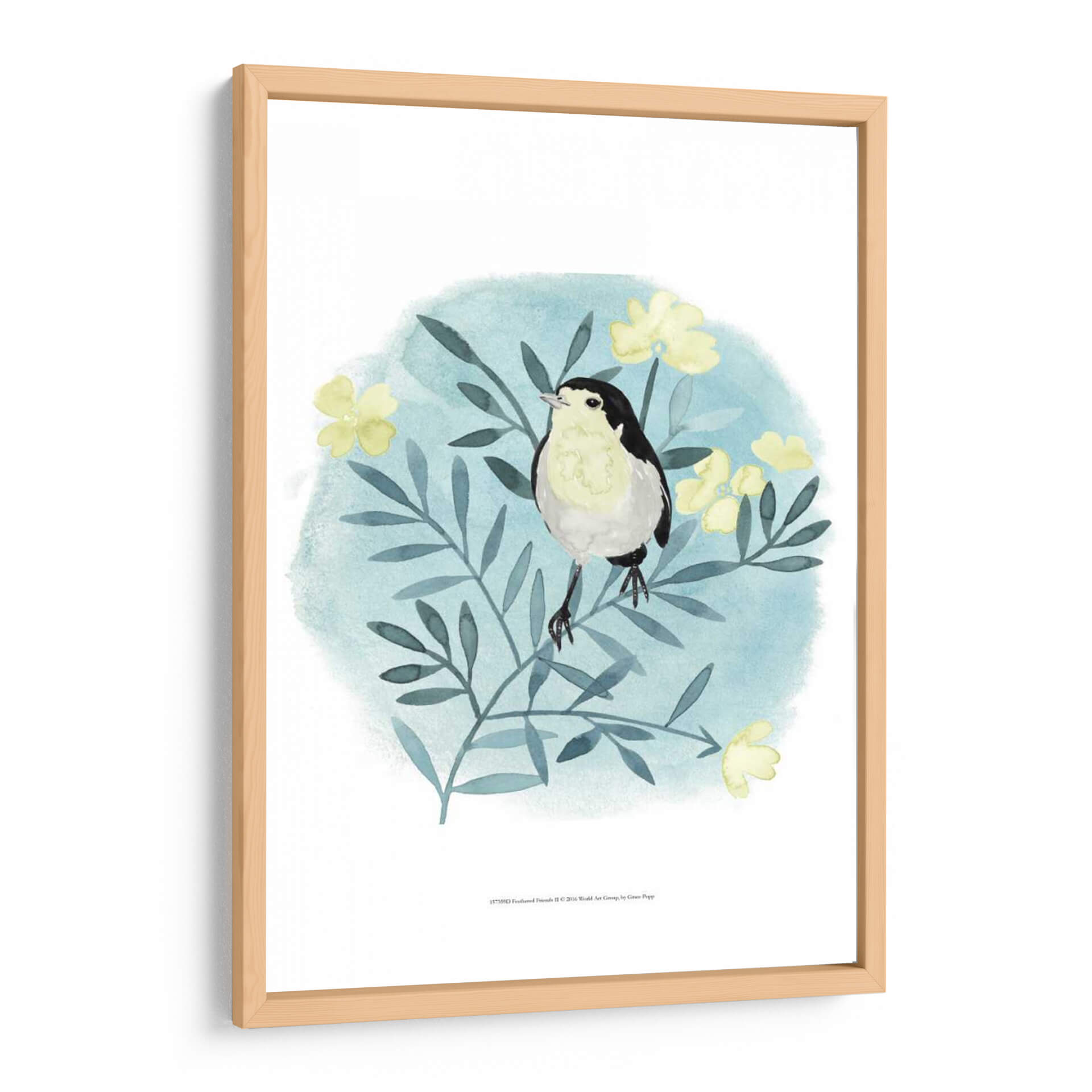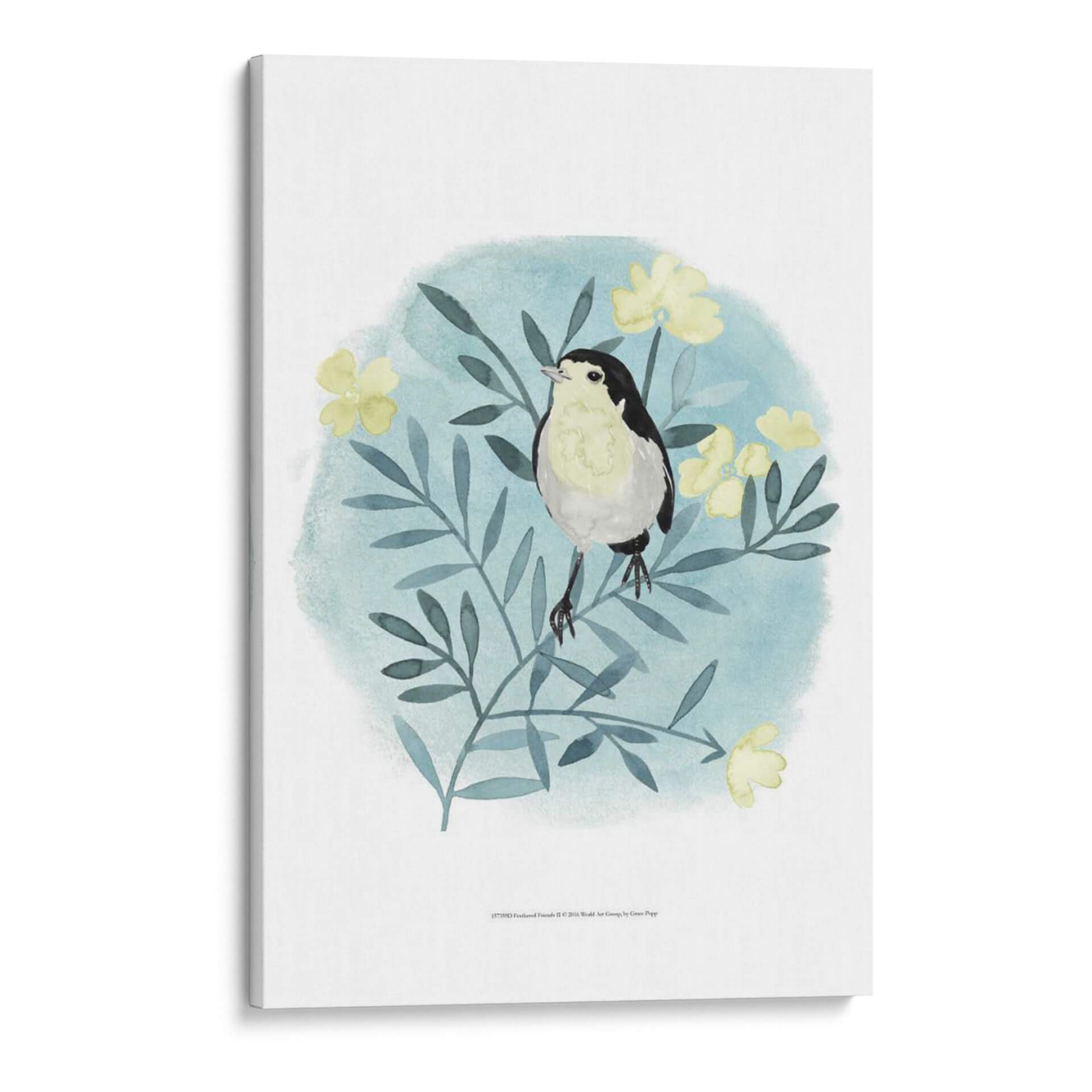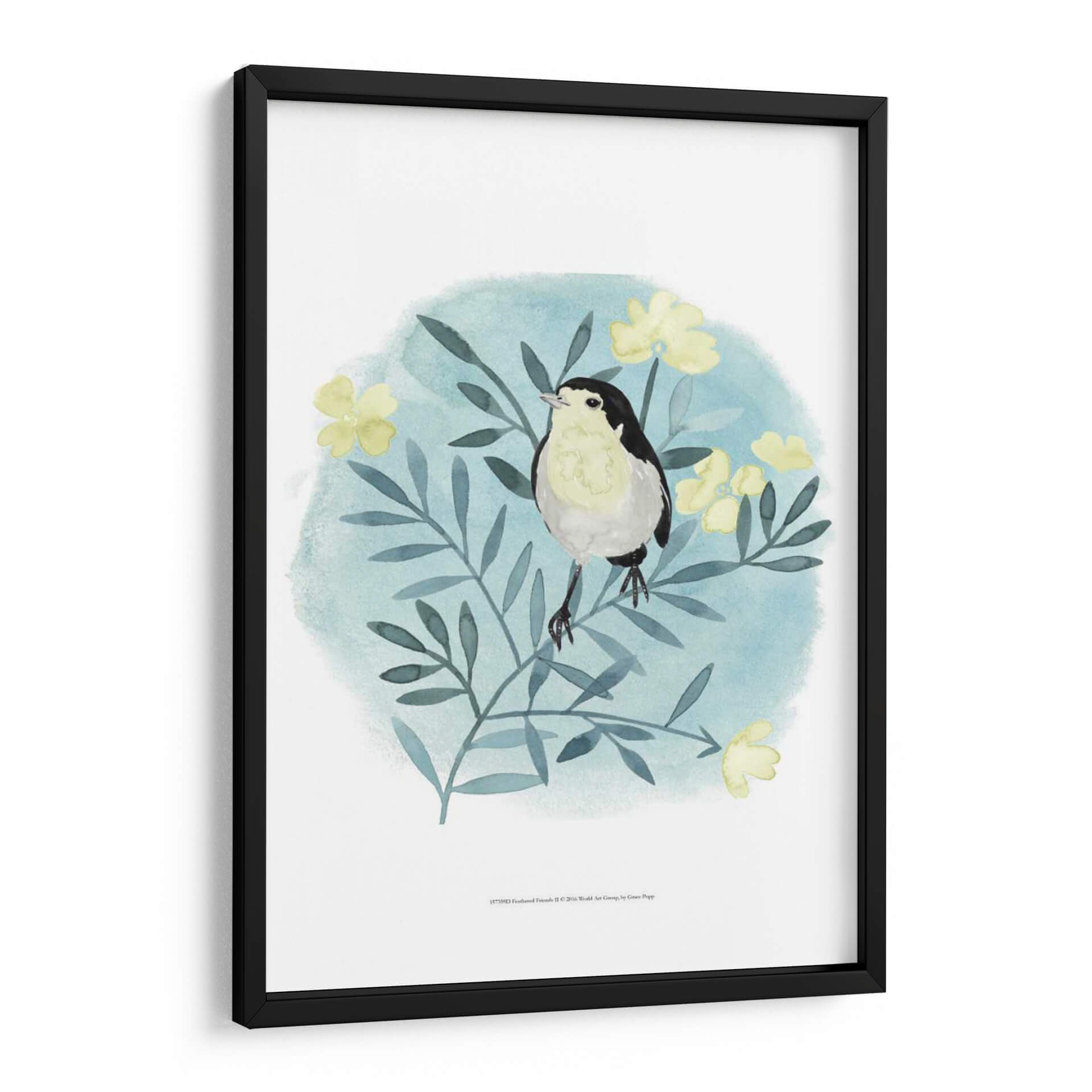 Transforma tu espacio con el encantador cuadro decorativo "Amigos Con Plumas II" de Grace Popp. Esta obra captura la delicadeza de la naturaleza a través de la representación de un pájaro posado en una rama florida, todo ello enmarcado en un suave y etéreo fondo acuarelado en tonos celestes y verdes azulados. La paleta de colores, dominada por los pasteles y acentos de amarillo vibrante en las flores, aporta una sensación de calma y serenidad, ideal para crear un rincón de paz en tu hogar o estudio. El estilo artístico, que combina la ilustración botánica con toques de acuarela suelta, otorga a la pieza una cualidad única y contemporánea. Este cuadro decorativo es perfecto para aquellos que buscan añadir un elemento de dulzura y conexión con la vida silvestre a su decoración, convirtiéndose en un punto focal sutil pero cautivador. Imagina la tranquilidad que "Amigos Con Plumas II" puede infundir en tu dormitorio, sala de estar o incluso en un espacio de trabajo, invitando a la reflexión y al disfrute de la belleza natural. Es una pieza que evoca ternura y la simple alegría de los momentos cotidianos.
