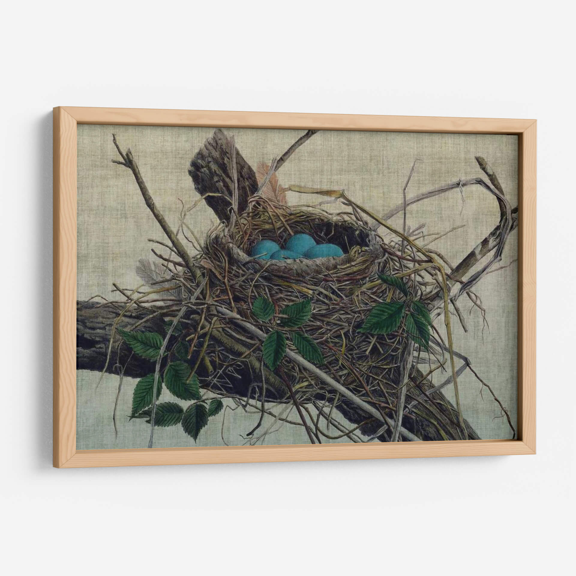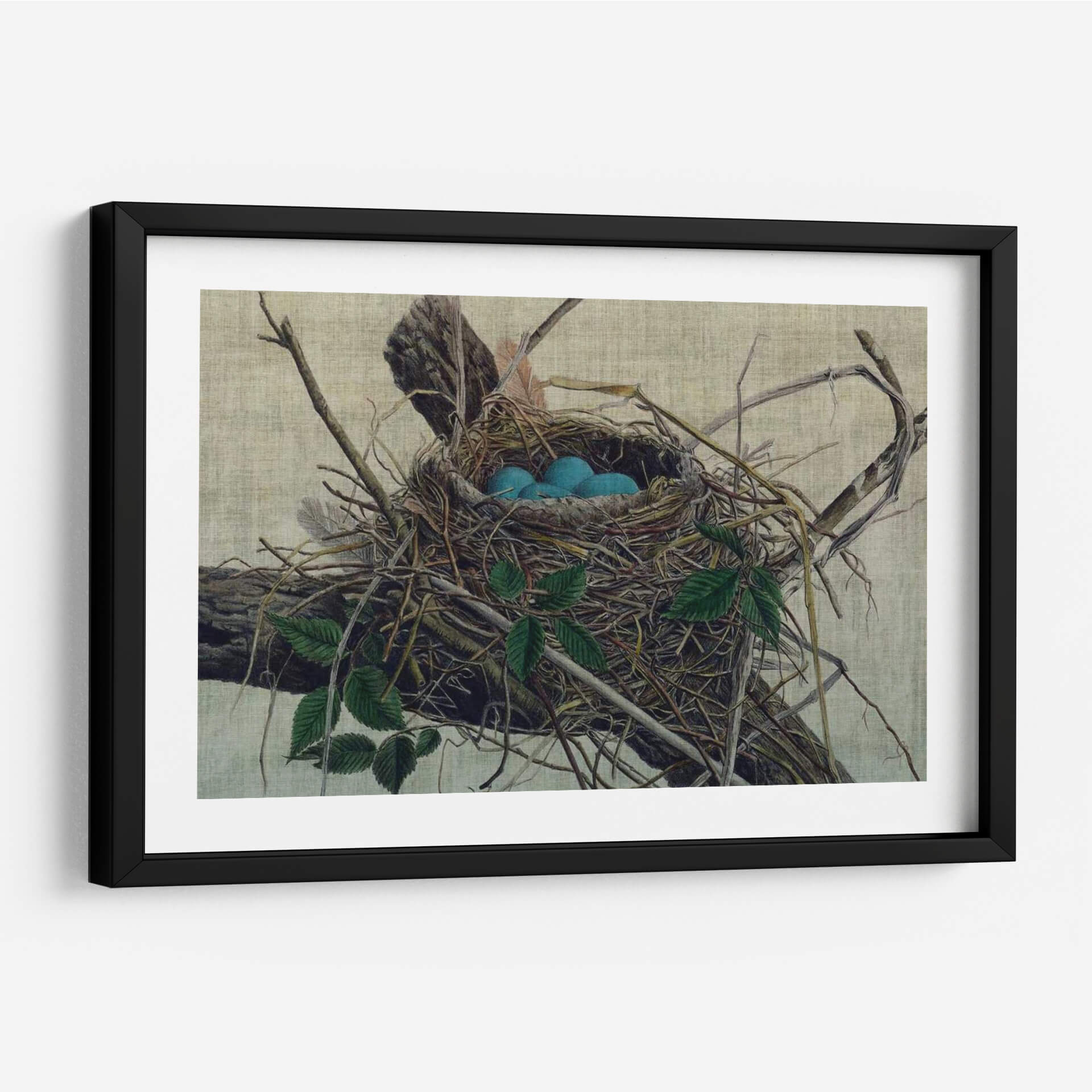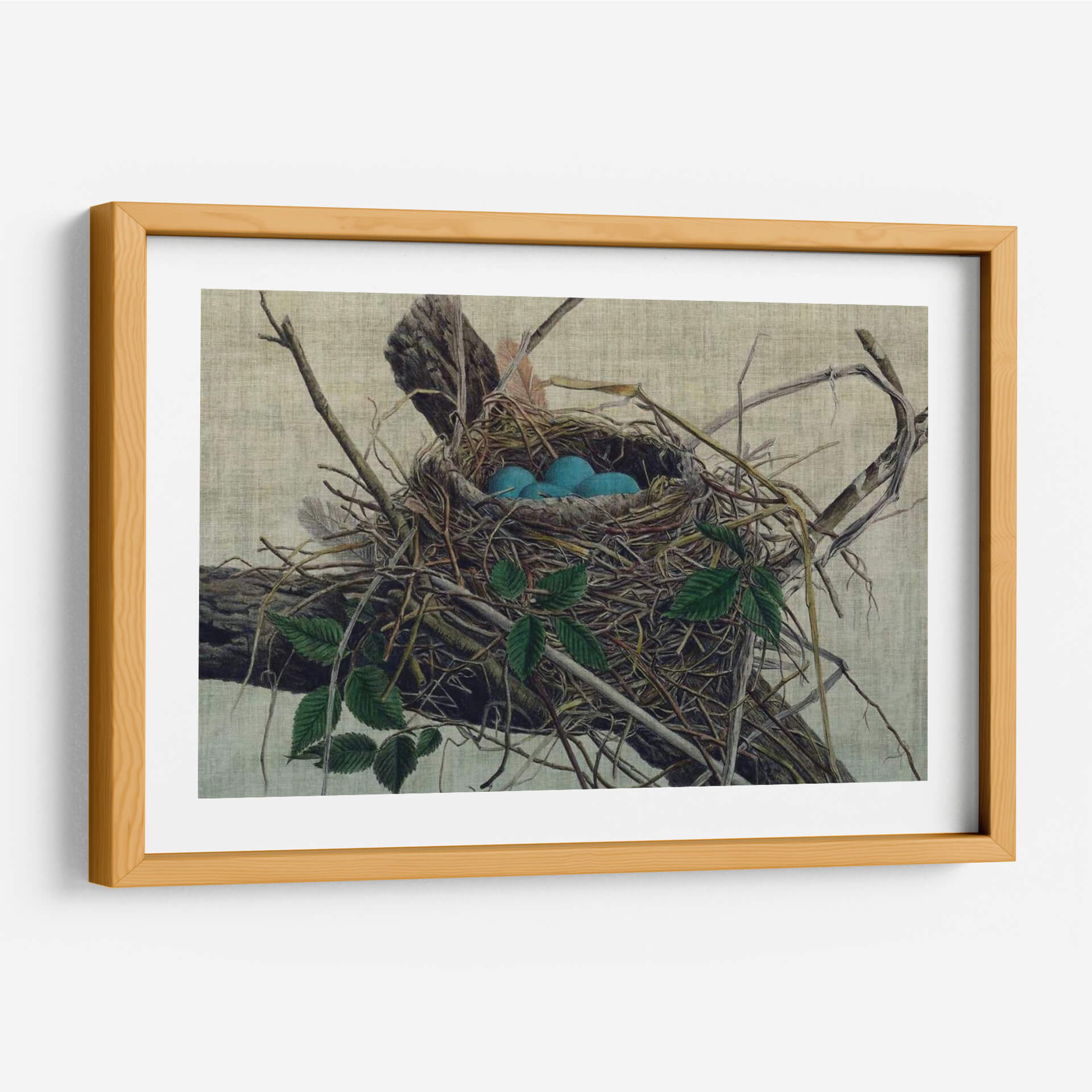 Sumérgete en la delicadeza y la promesa de la vida con "Anidando II", una obra maestra del artista John Butler. Este cuadro decorativo captura la esencia de un nido de pájaro intrincadamente tejido, anidado entre ramas robustas y hojas verdes vibrantes. En su centro, cinco huevos de un azul intenso descansan, evocando una sensación de calma, protección y el milagro de la naturaleza. La paleta de colores terrosos, con sutiles toques de verde y el contraste del azul cerúleo de los huevos, crea una atmósfera serena y acogedora. El detalle minucioso en la textura de las ramas y el plumaje añade una profundidad realista a la pieza, invitando al espectador a contemplar la belleza en los pequeños detalles del mundo natural. Este cuadro es ideal para espacios que buscan infundir tranquilidad y una conexión con la naturaleza, como un dormitorio, una sala de estar o un rincón de lectura. "Anidando II" no es solo una decoración de pared, es una ventana a la serenidad y al ciclo eterno de la vida, perfecta para quienes aprecian el arte figurativo con un toque de realismo mágico y un profundo sentido de renovación.