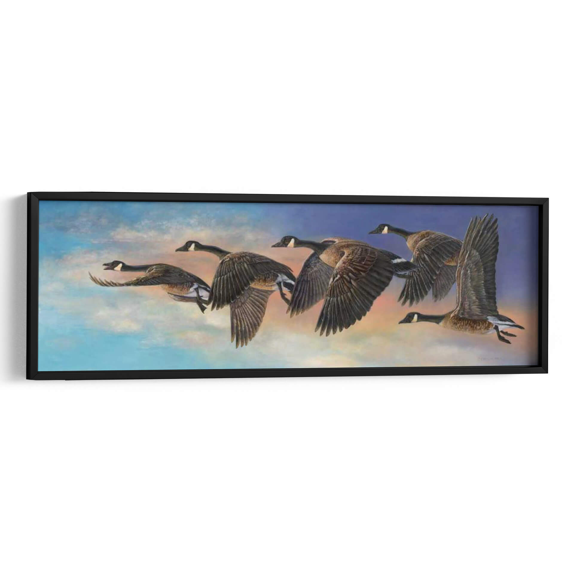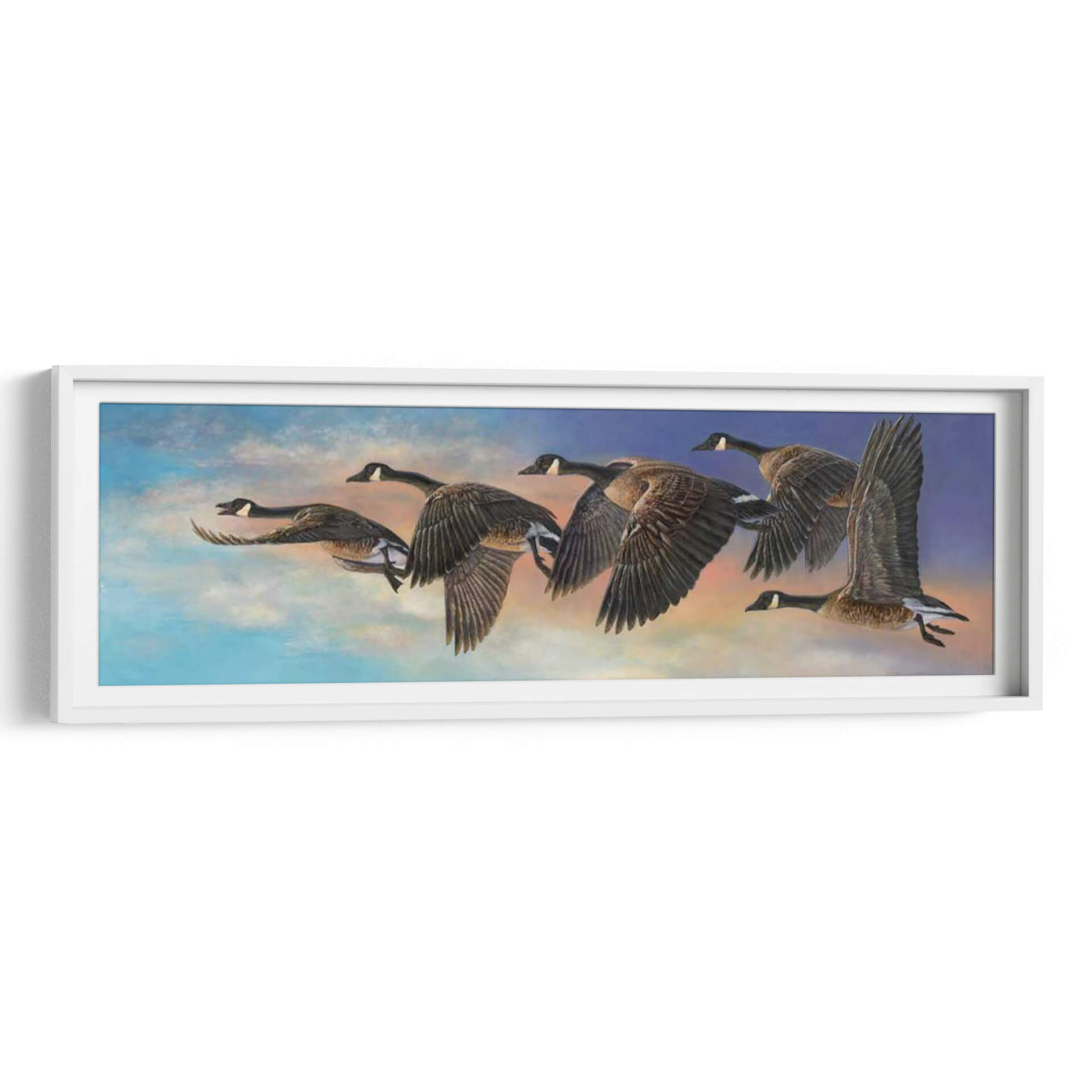 Captura la esencia del movimiento y la libertad con 'Ascenso', una obra de arte cautivadora de Carolyn Mock. Este cuadro decorativo presenta una bandada de gansos en pleno vuelo, silueteados contra un cielo vibrante que transita del azul intenso a tonos cálidos de amanecer o atardecer. La detallada representación de las aves, con sus alas desplegadas y cuerpos aerodinámicos, evoca una sensación de dinamismo y propósito. La paleta de colores, rica y evocadora, combina azules celestes, naranjas y toques de rosa, creando una atmósfera etérea y llena de vida. El estilo realista y la composición magistral guían la mirada a través de la formación de vuelo, transmitiendo la fuerza y la armonía de la naturaleza. 'Ascenso' es ideal para añadir un toque de elegancia natural y un recordatorio inspirador de la migración y la conexión en cualquier espacio. Este cuadro decorativo es perfecto para salones modernos, estudios o comedores, aportando una dimensión de serenidad y admiración por el mundo natural. Descubre la belleza del viaje y la resiliencia con esta pieza única.