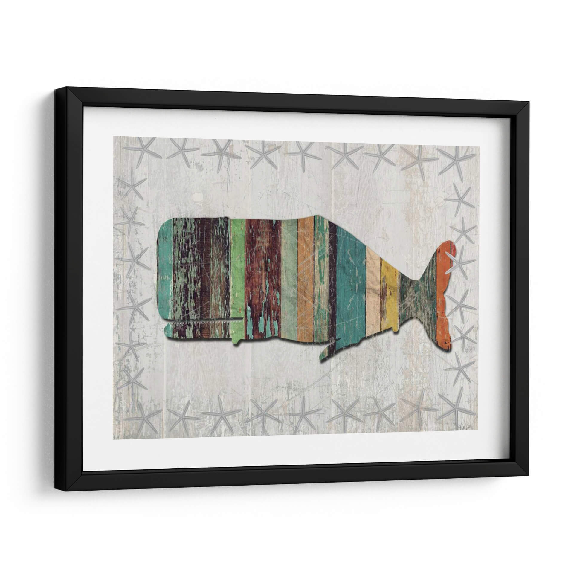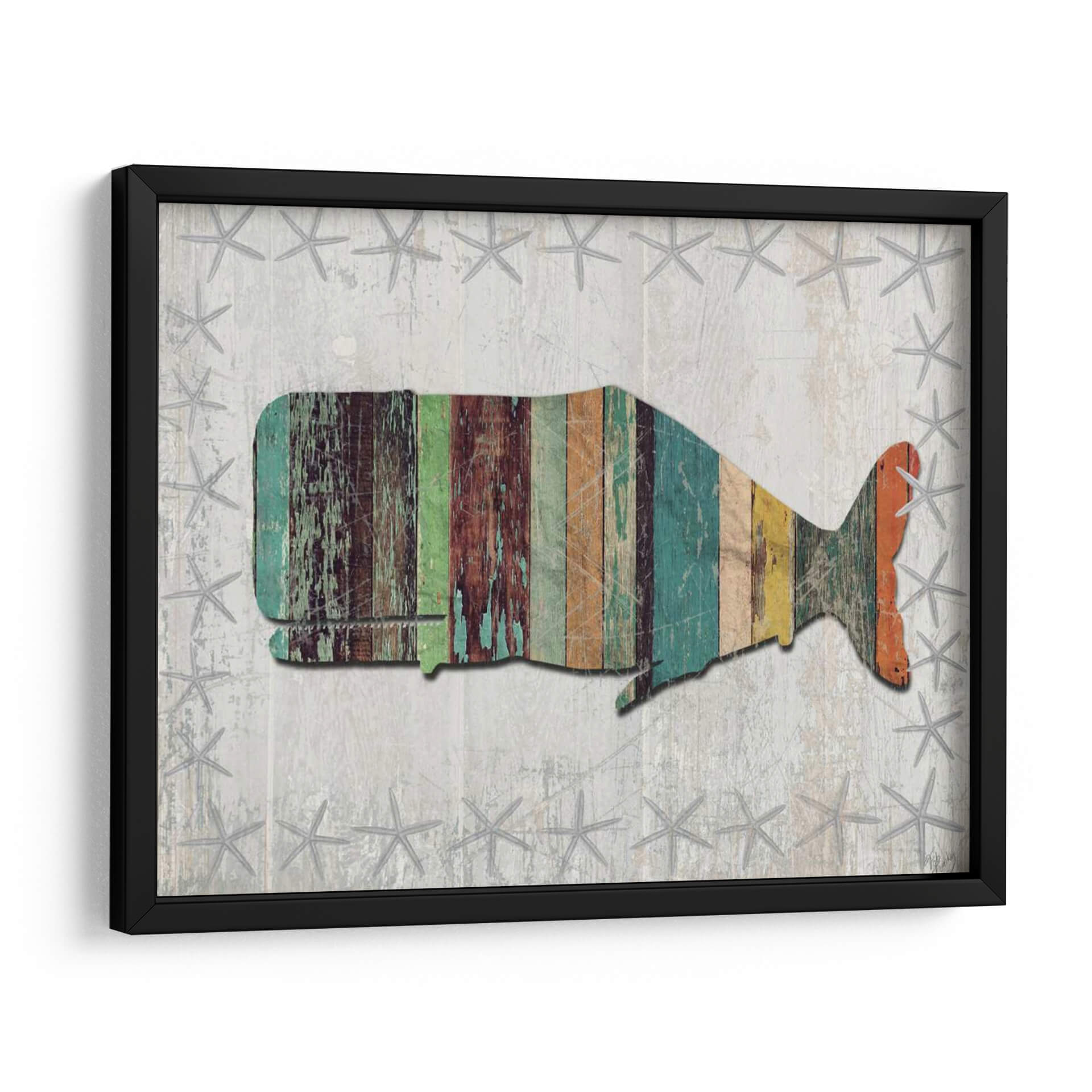 Sumérgete en la serenidad costera con este cautivador cuadro decorativo de ballena, una pieza que evoca la majestuosidad del océano y el encanto rústico de la madera desgastada. La obra presenta una estilizada silueta de ballena, compuesta por vibrantes tablones de madera en tonos turquesa, verdes, marrones y naranjas, cada uno mostrando una textura y un desgaste que insinúan historias marinas. El fondo, con un acabado de textura de madera envejecida y salpicado de delicadas estrellas de mar grises, crea una atmósfera playera y relajante. Este cuadro decorativo es perfecto para añadir un toque de carácter y calidez a cualquier espacio, ya sea una sala de estar, un dormitorio o un baño con temática náutica. Su diseño único y su paleta de colores vibrante pero equilibrada lo convierten en un punto focal ideal para interiores costeros, rústicos o eclécticos, aportando una sensación de paz y conexión con la naturaleza marina. Transforma tu hogar en un refugio costero con esta obra de arte que celebra la belleza del mar y la artesanía. Ideal para quienes buscan decoración de pared con un toque de estilo vintage y un guiño al mundo marino.