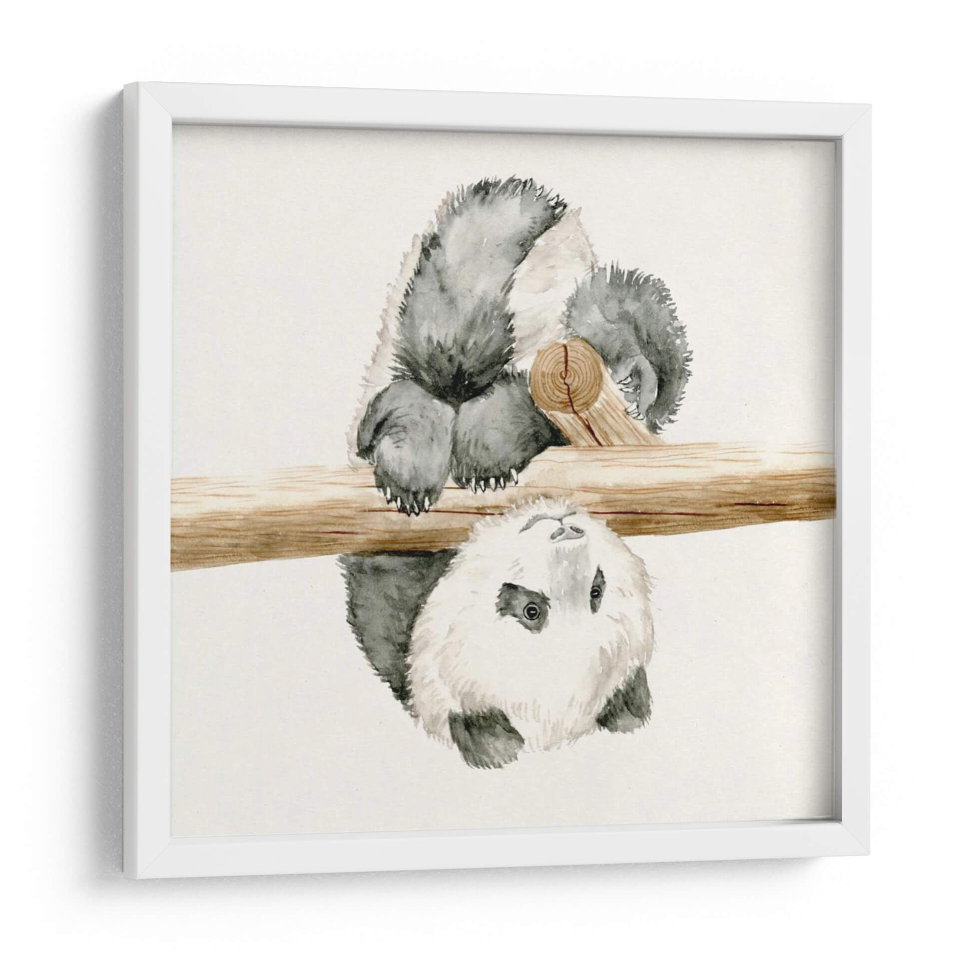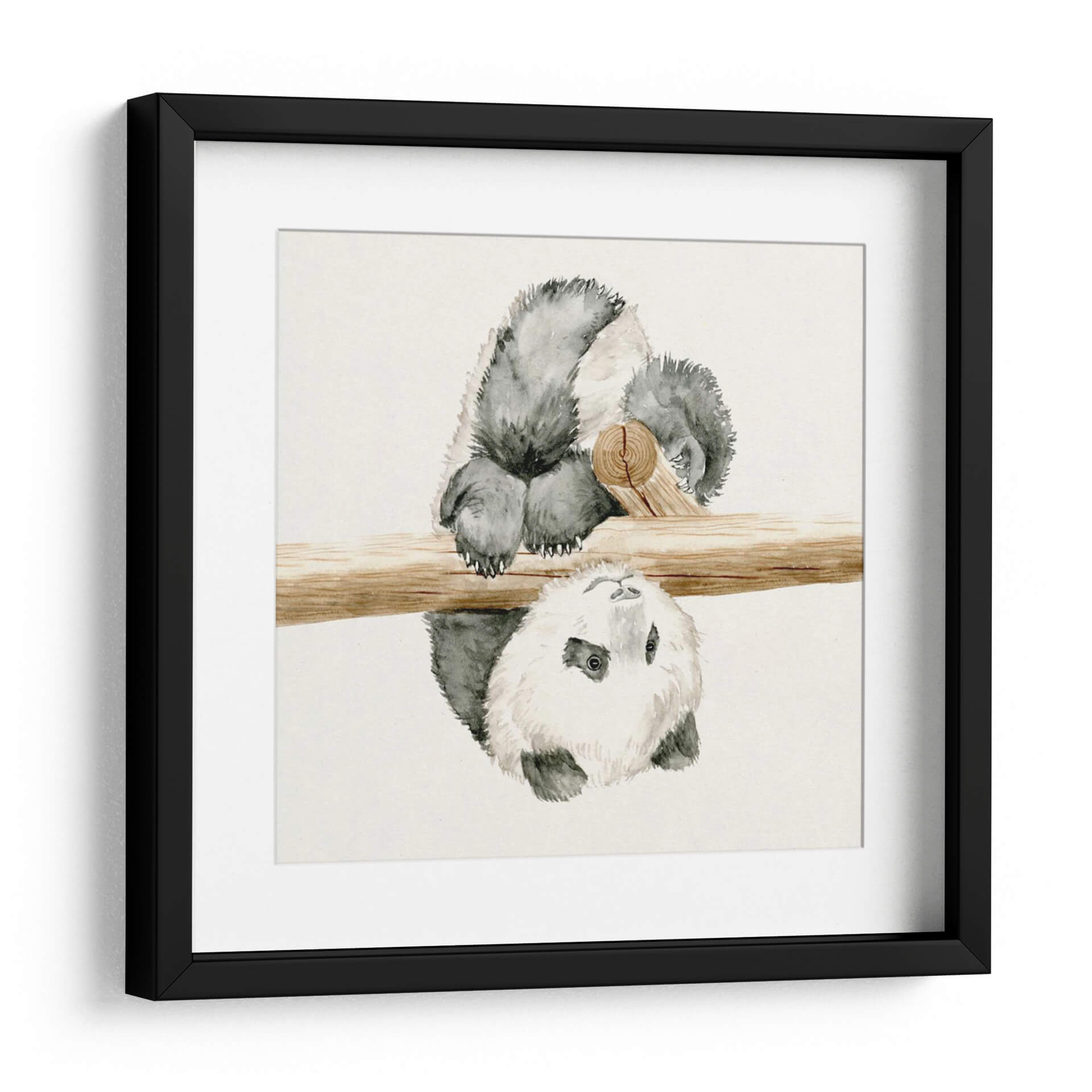 Aporta una dosis de ternura y encanto natural a tu hogar con este cautivador cuadro decorativo de un bebé panda. La obra, realizada con delicadeza en acuarela, captura a un tierno panda colgando de un tronco de madera, con su cabeza invertida y sus ojos curiosos mirando directamente al espectador. Los grises suaves y los tonos tierra del tronco crean una paleta de colores armoniosa y relajante, perfecta para añadir un toque de serenidad a cualquier espacio. El estilo realista pero con la fluidez de la acuarela, le otorga una profundidad emocional y una textura visual única. Ideal para decorar habitaciones infantiles, salas de estar modernas o incluso oficinas, este cuadro de panda evoca alegría, inocencia y una conexión con la naturaleza. Su composición centrada y el tema adorable lo convierten en una pieza de arte de pared que sin duda será un punto de conversación y una fuente de sonrisas. Añade un toque de dulzura y sofisticación a tu decoración con esta encantadora obra.