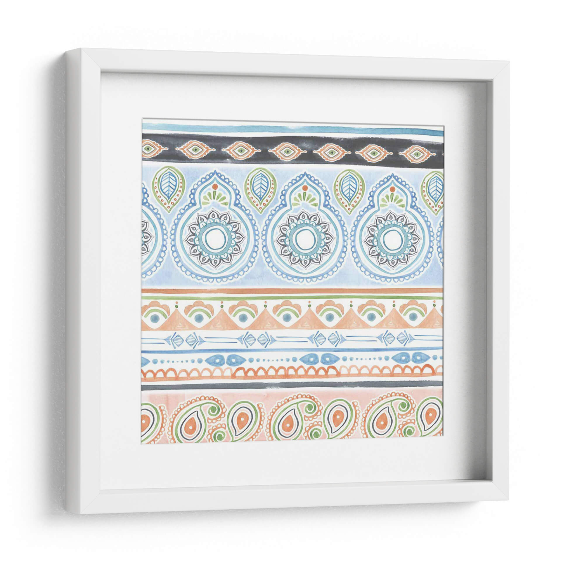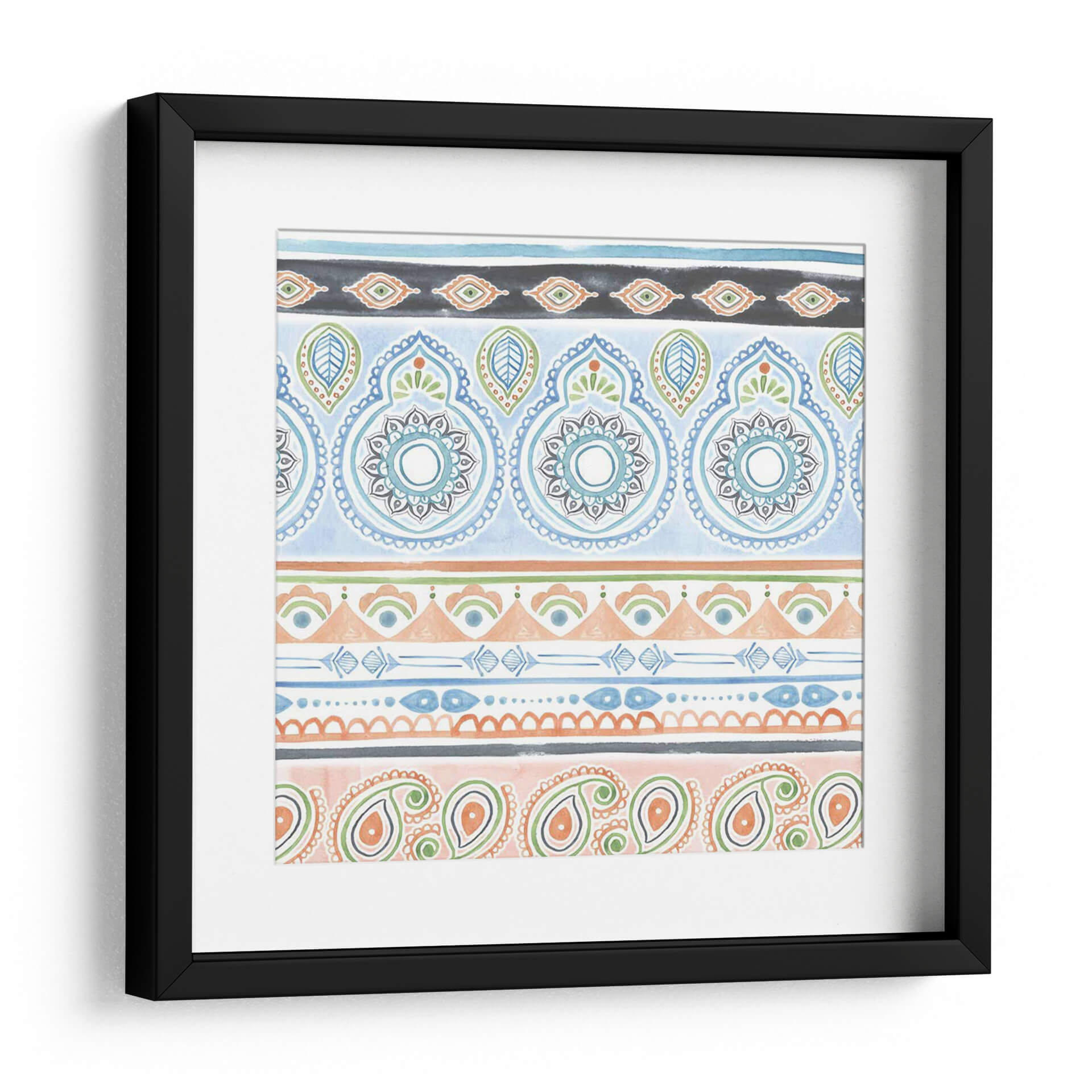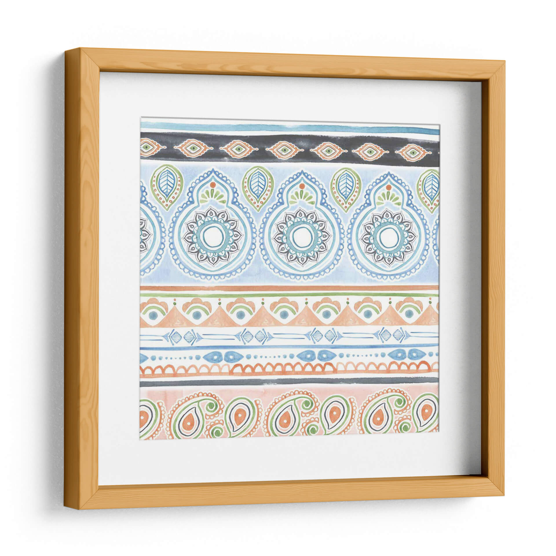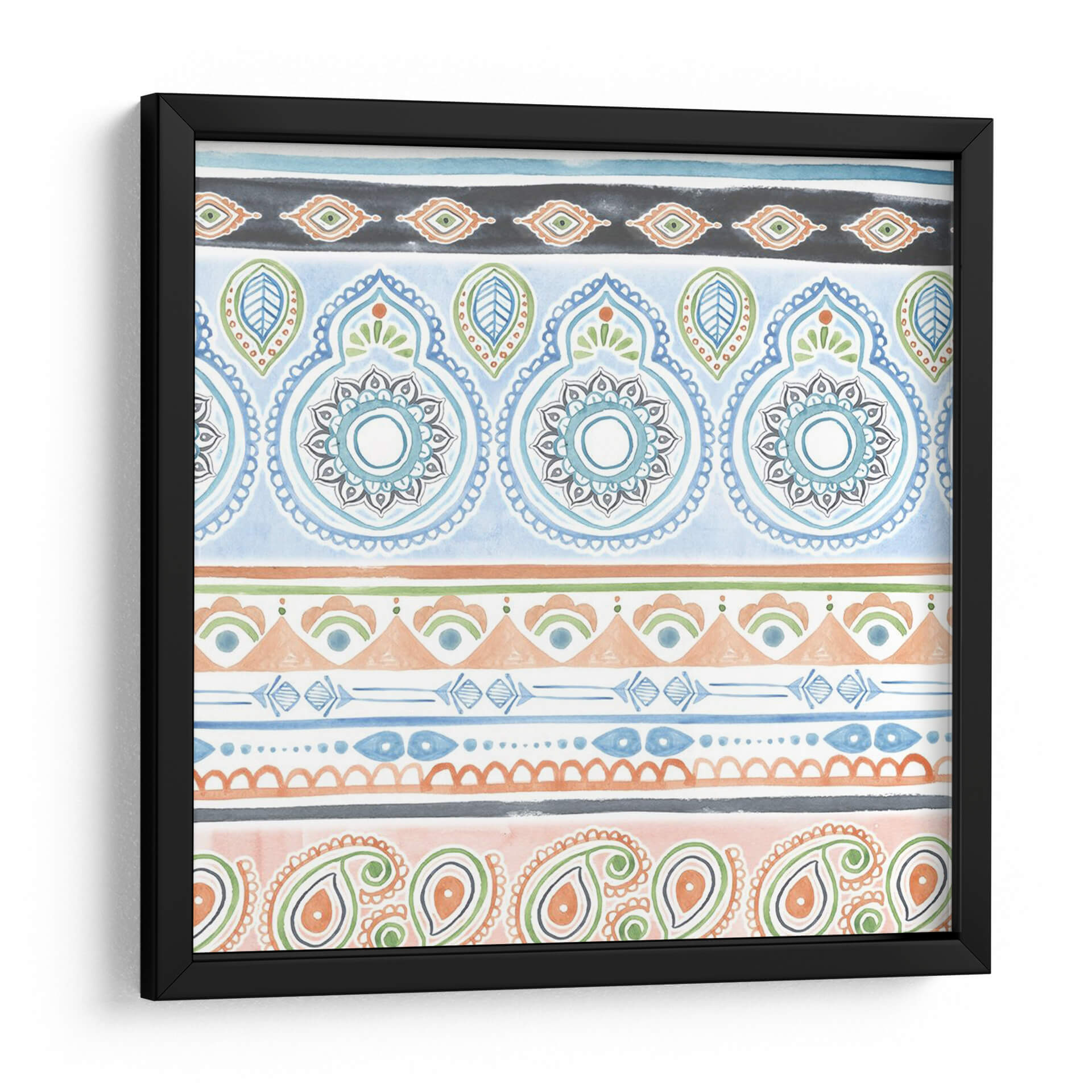 Sumérgete en la serenidad y el estilo bohemio con "Bisect Iv", una obra de arte contemporáneo de Melissa Wang. Este cuadro decorativo presenta un diseño tribal intrincado y repetitivo, evocando la riqueza cultural y la armonía de los textiles etíopes. La paleta de colores, dominada por suaves tonos de azul cielo, blanco roto, naranjas terrosos y acentos de verde salvia, crea una atmósfera de calma y sofisticación. Cada banda decorativa, desde los mandalas circulares en el centro hasta los motivos paisley en la parte inferior, está ejecutada con delicadeza acuarela, aportando una textura visual y una sensación de fluidez. "Bisect Iv" es perfecto para añadir un toque de color suave y un aire de tranquilidad a tu sala de estar, dormitorio o incluso a un espacio de oficina que busque un ambiente relajado. Este arte de pared es una invitación a la contemplación, fusionando patrones geométricos y orgánicos para crear una pieza única que atraerá miradas y generará conversación, transformando cualquier habitación en un refugio de estilo y paz.