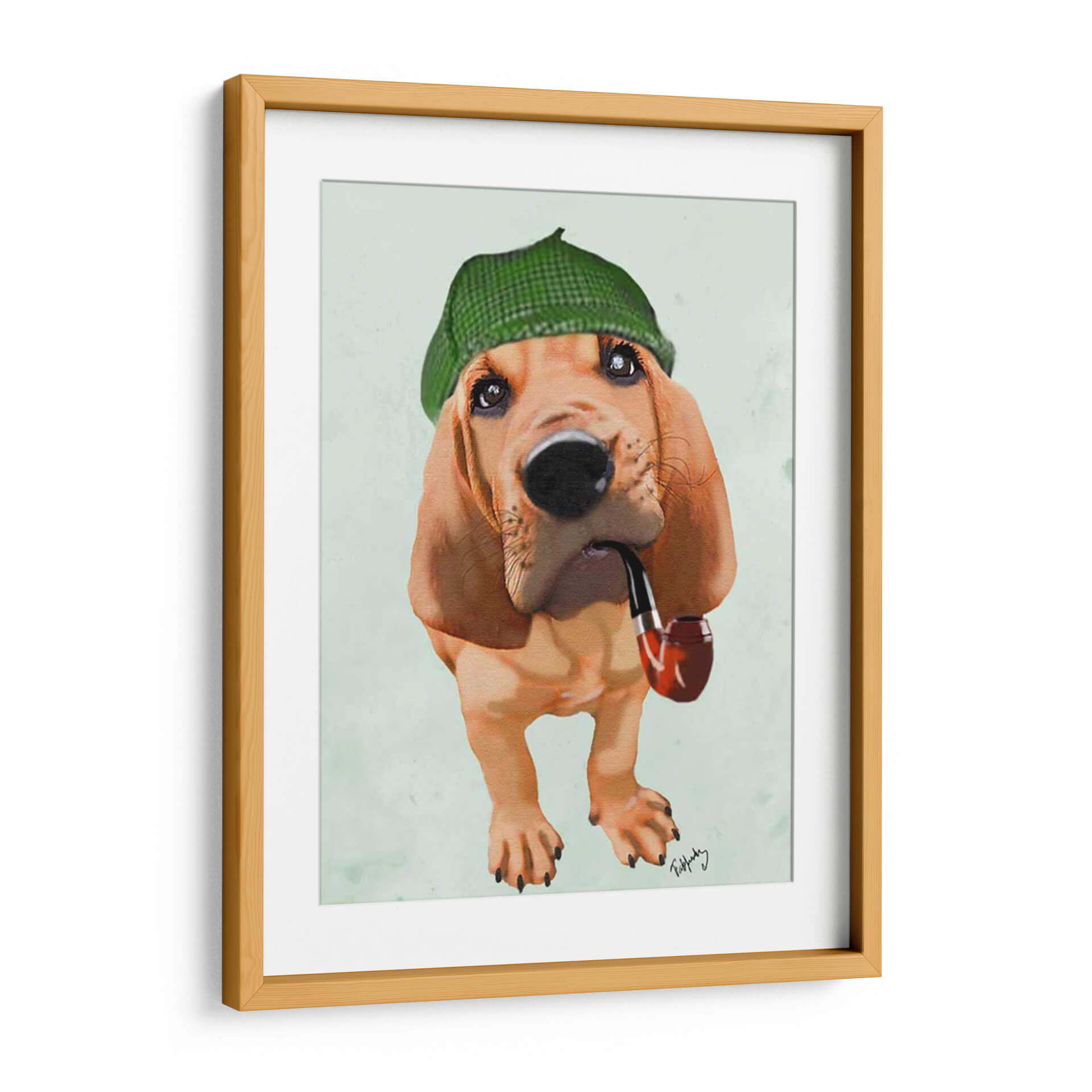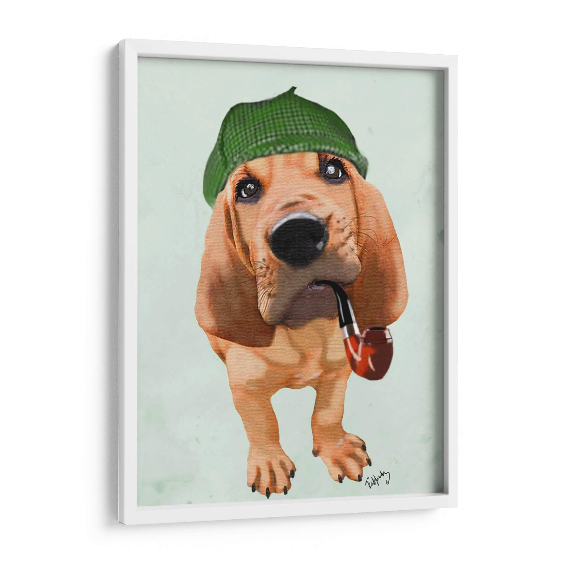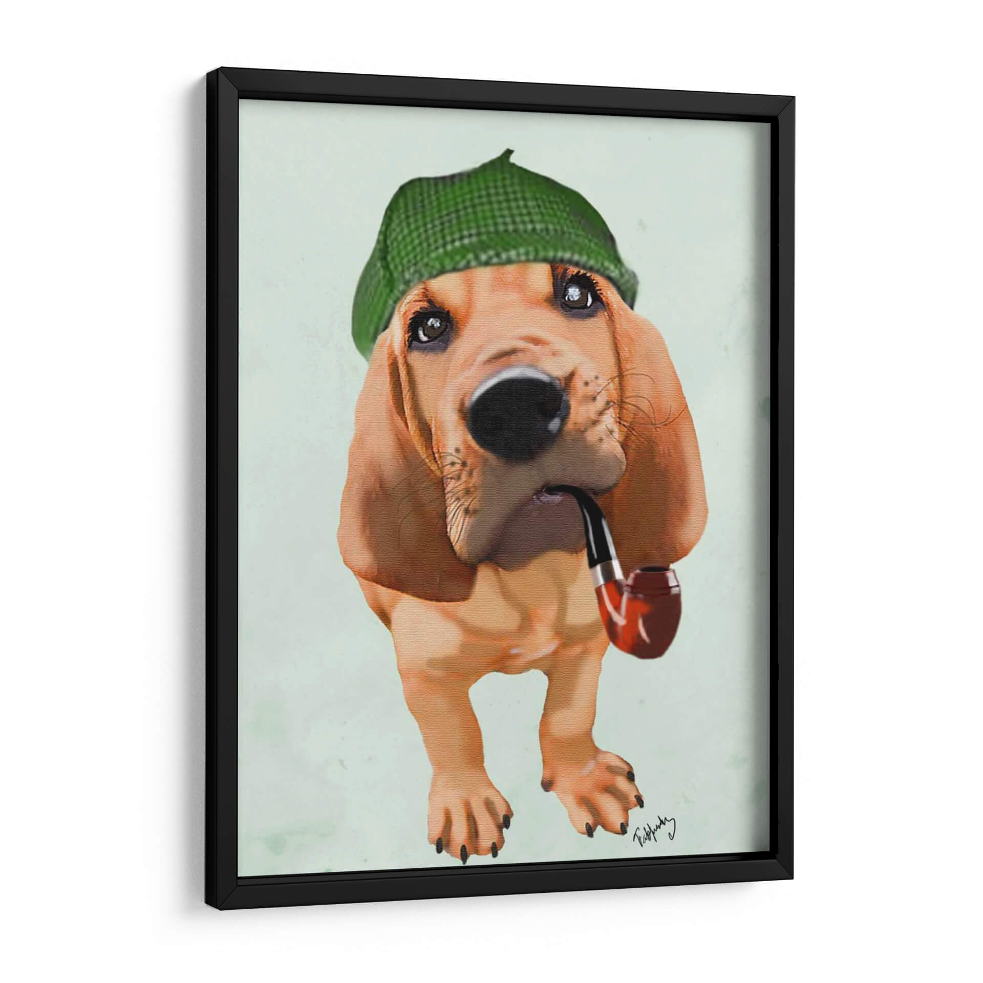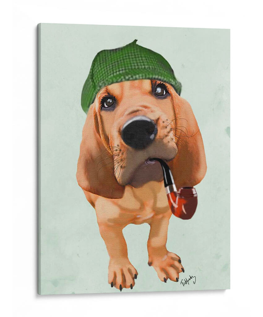 Transforma tu espacio con este encantador cuadro decorativo "Bloodhound Sherlock Holmes" del artista Fab Funky. Esta obra de arte digital captura la esencia de un leal y perspicaz sabueso, vestido con una boina de cuadros verde y portando una pipa, evocando un aire de misterio y elegancia clásica. La paleta de colores se centra en tonos cálidos y terrosos del perro, contrastando con el verde vibrante de la boina y un suave fondo aguamarina, creando una atmósfera acogedora y distinguida. El estilo pictórico, con toques de realismo y una pincelada que sugiere textura, hace que el personaje cobre vida ante tus ojos. Es la pieza perfecta para añadir un toque de personalidad y sofisticación a cualquier sala de estar, estudio u oficina, o incluso para dar un toque de humor y carácter a un dormitorio. Este cuadro decorativo es ideal para amantes de los perros, aficionados a la cultura británica o cualquiera que busque una pieza de arte única y memorable que inicie conversaciones y aporte un estilo inconfundible a su decoración.