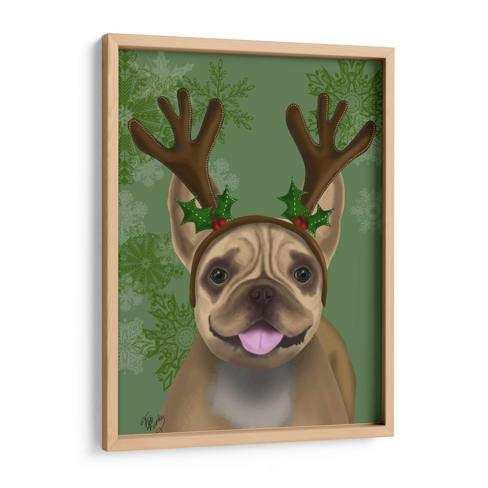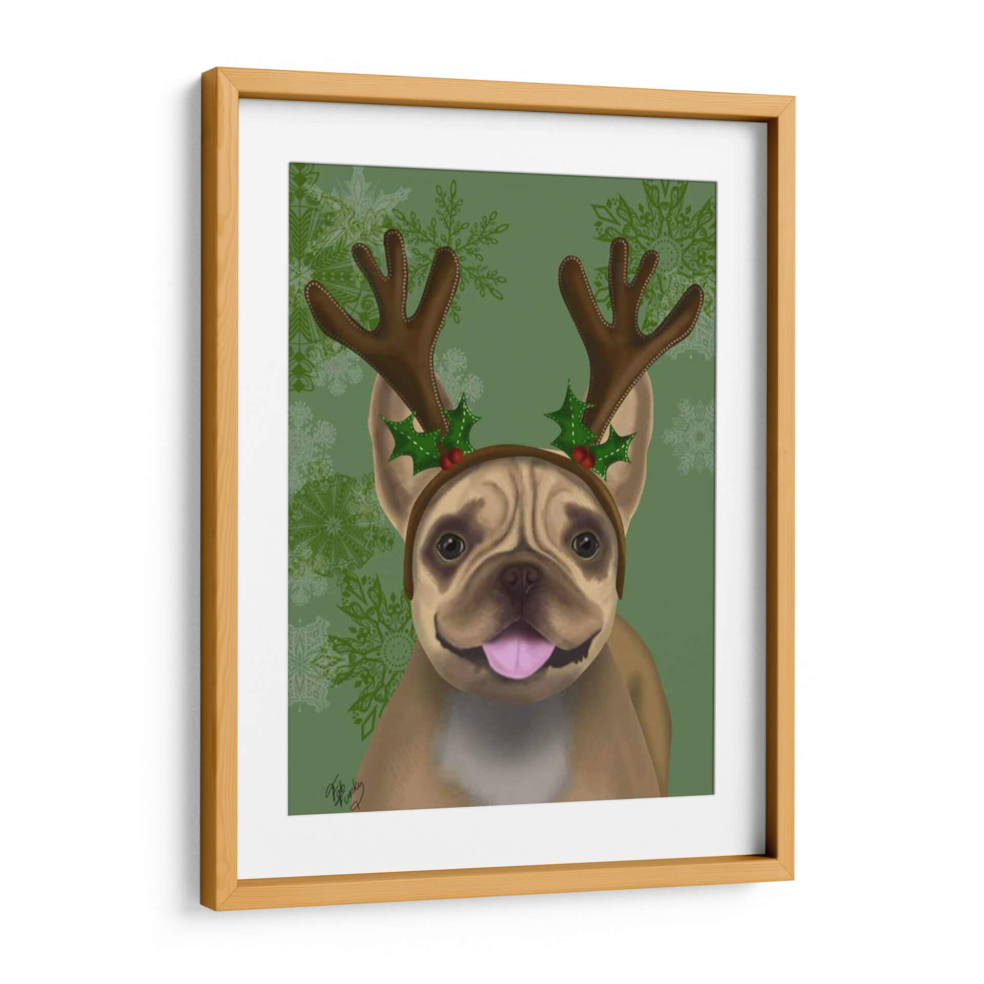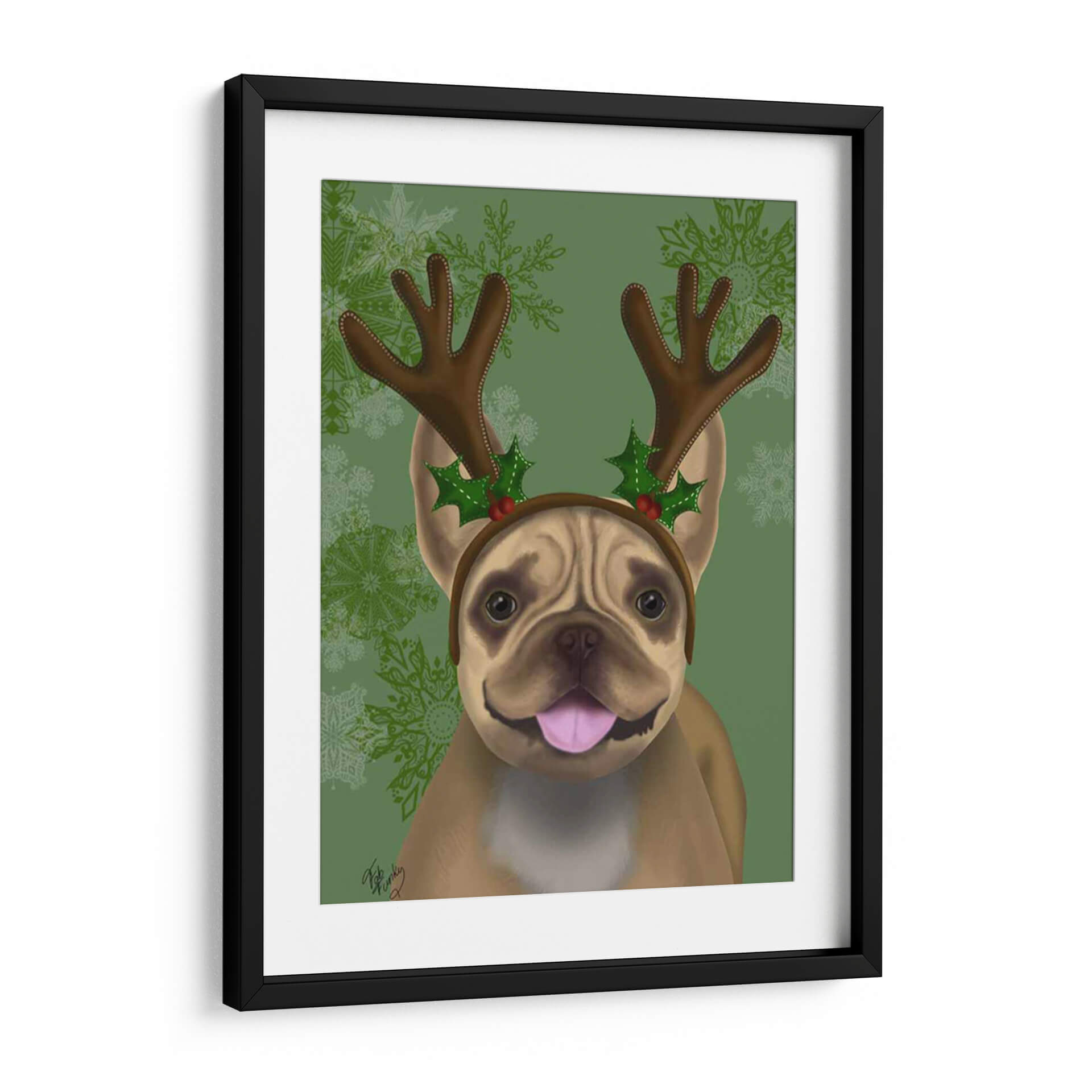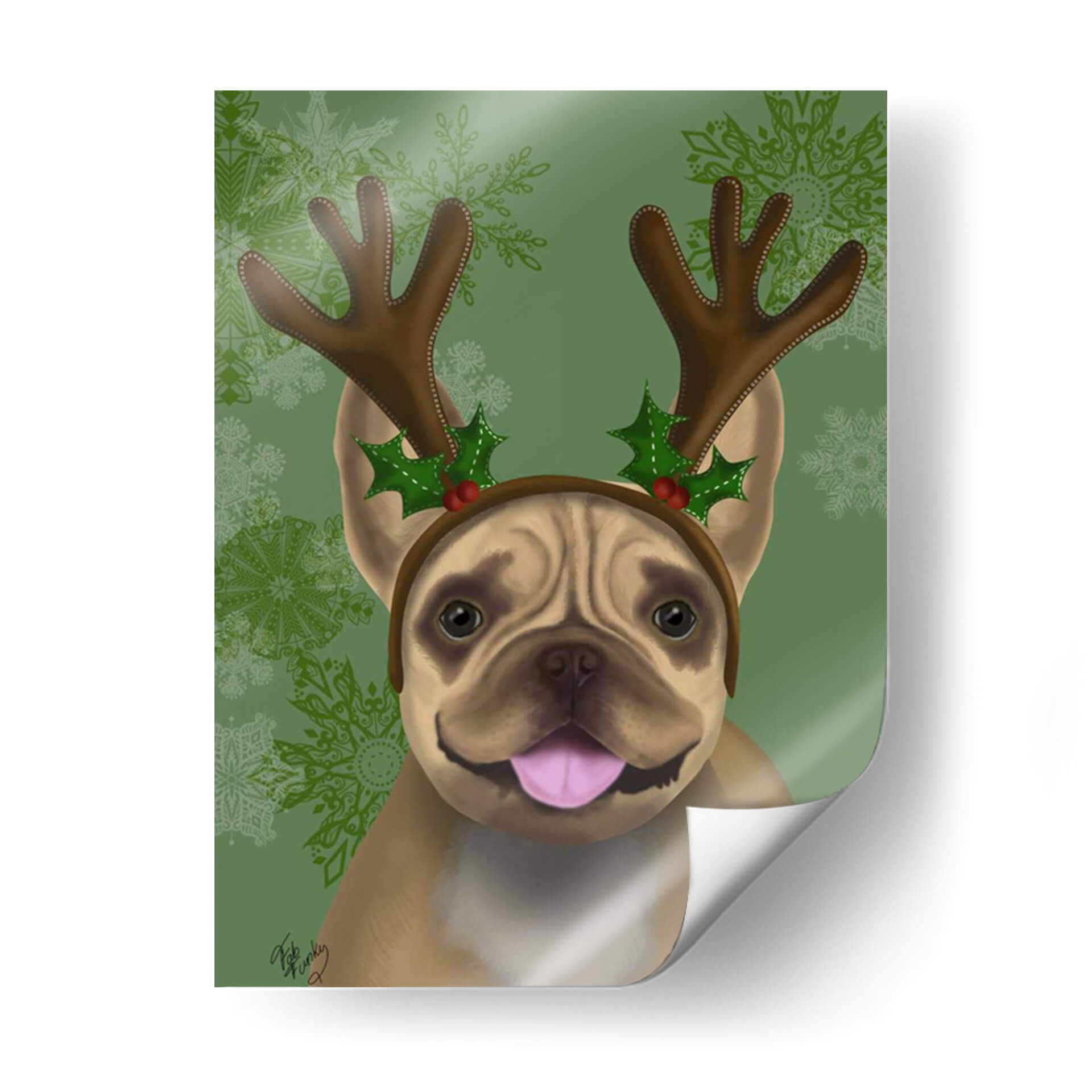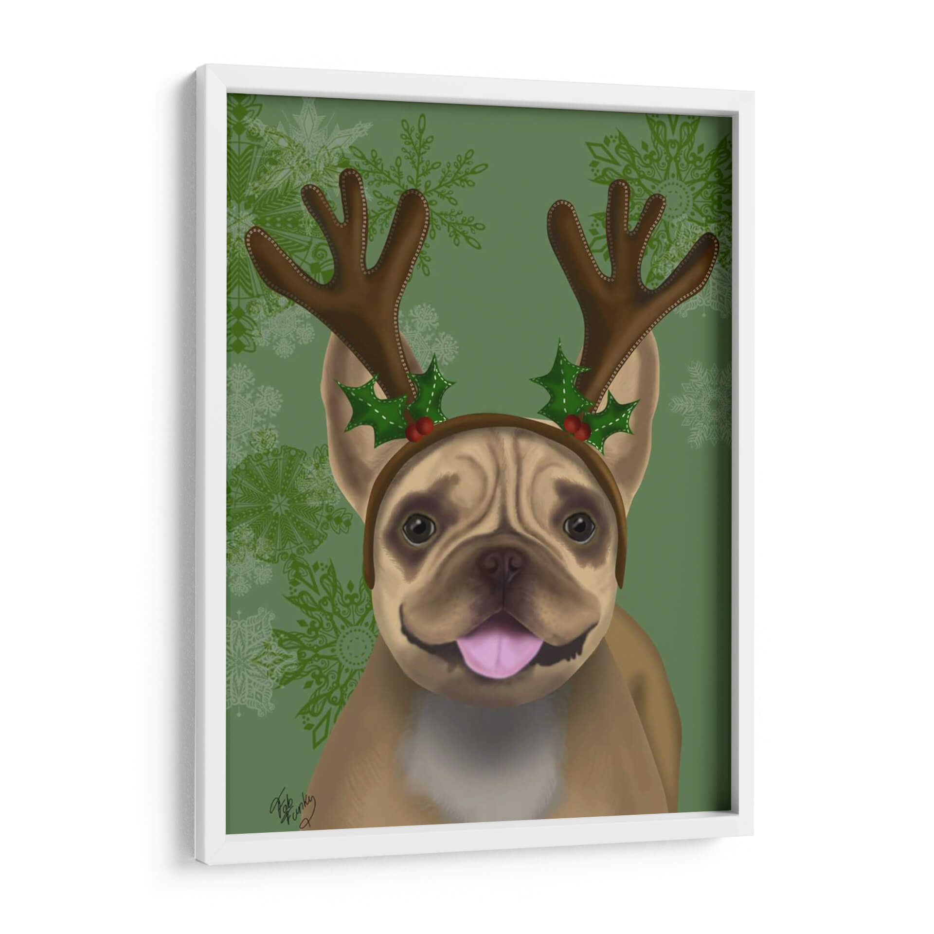 Embárcate en un viaje festivo con nuestro cautivador cuadro decorativo de un Bulldog Francés adornado con astas y acebo, una pieza de arte digital que irradia alegría y espíritu navideño. La obra presenta a un adorable Bulldog Francés con una expresión juguetona, coronado con una diadema de astas de reno y detalles de acebo y bayas rojas, evocando la magia de la temporada. El fondo, en un vibrante tono verde con delicados copos de nieve ornamentados, complementa a la perfección la calidez y el encanto del protagonista, creando una atmósfera de celebración y calidez hogareña. El estilo artístico, con toques lúdicos y un acabado digital pulido, hace que este cuadro sea un acierto seguro para añadir personalidad a cualquier espacio. Ideal para amantes de los animales, entusiastas de la Navidad y cualquiera que busque infundir un ambiente festivo y lleno de carácter en su hogar u oficina. Este cuadro decorativo es perfecto para la temporada navideña o para quienes desean mantener vivo el espíritu festivo todo el año, aportando una dosis de humor y ternura a la decoración de paredes.