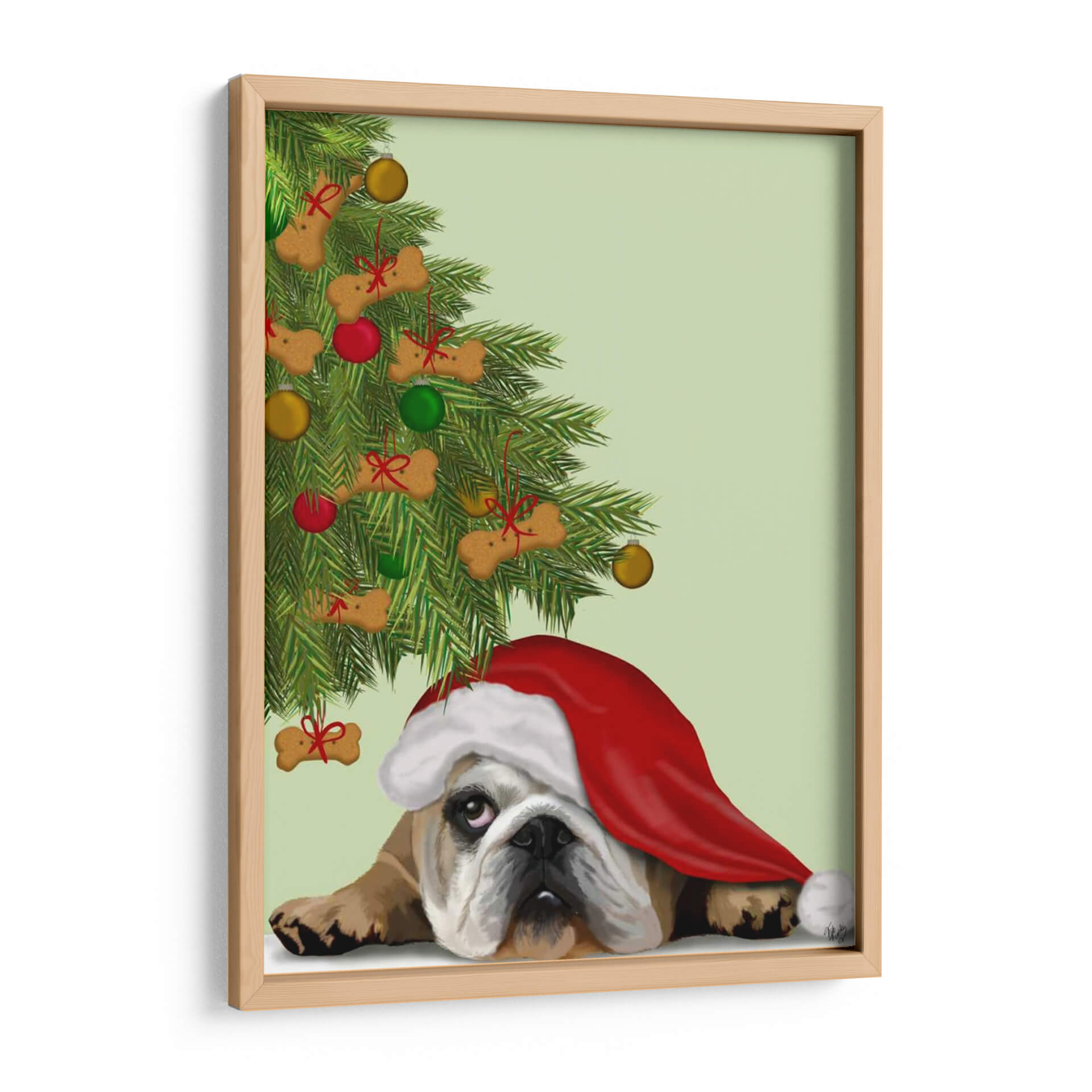 Captura la magia festiva con este encantador cuadro decorativo que presenta un adorable Bulldog Inglés bajo un árbol de Navidad adornado. La obra, titulada 'Bulldog Inglés, Árbol De Galletas', es una creación del artista Fab Funky. La paleta de colores, dominada por verdes vibrantes del pino, los tonos cálidos y marrones del perro, y los toques festivos de rojo y dorado en los adornos, crea una atmósfera acogedora y alegre, perfecta para la temporada navideña o para amantes de los perros durante todo el año. La expresión melancólica pero entrañable del bulldog, contrastada con la exuberancia del árbol decorado con galletas en forma de hueso y adornos clásicos, añade una capa de humor y ternura a la pieza. Su estilo de ilustración digital detallada y el fondo suave en tono pastel la hacen versátil para diversos espacios. Ideal para añadir un toque de personalidad y calidez a tu sala de estar, cocina o incluso una oficina, este cuadro decorativo es un regalo perfecto para los aficionados a los perros y una adición entrañable a cualquier decoración festiva o temática.