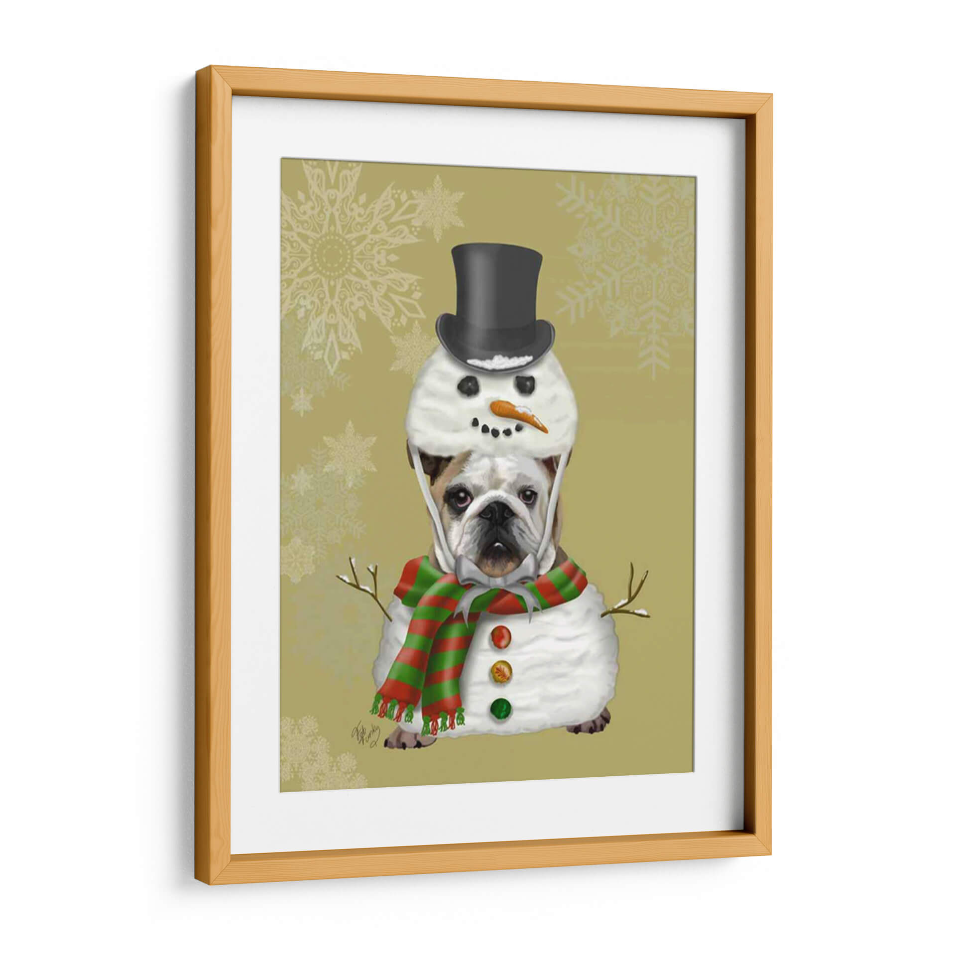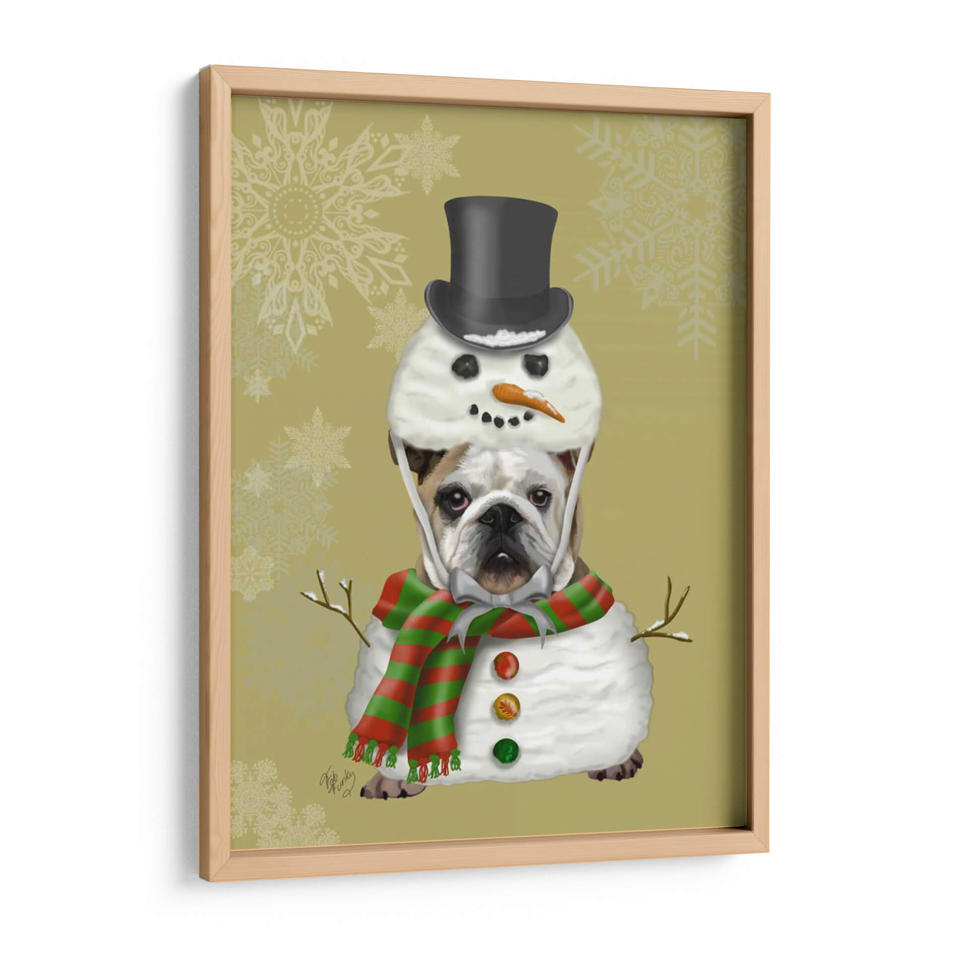 Celebra la temporada navideña con un toque de humor y originalidad con este encantador cuadro decorativo del "Bulldog Inglés, Traje de Muñeco de Nieve" del artista Fab Funky. Esta obra de arte digital presenta a un adorable bulldog inglés con un divertido disfraz de muñeco de nieve, completo con un sombrero de copa, una nariz de zanahoria y un bufanda a rayas rojas y verdes. El fondo de color mostaza suave y los detalles de copos de nieve crean una atmósfera festiva y acogedora, perfecta para añadir un espíritu navideño a tu hogar u oficina. El estilo realista pero caprichoso de la ilustración, combinado con la expresión entrañable del perro, evoca sentimientos de alegría y diversión. Este cuadro es ideal para colgar en salas de estar, cocinas o incluso como un regalo único para los amantes de los perros y la Navidad. Su paleta de colores cálidos y fríos se adapta a diversas decoraciones, aportando un toque de personalidad y calidez a cualquier espacio. Dale vida a tus paredes con esta pieza peculiar y festiva que sin duda será un tema de conversación.
