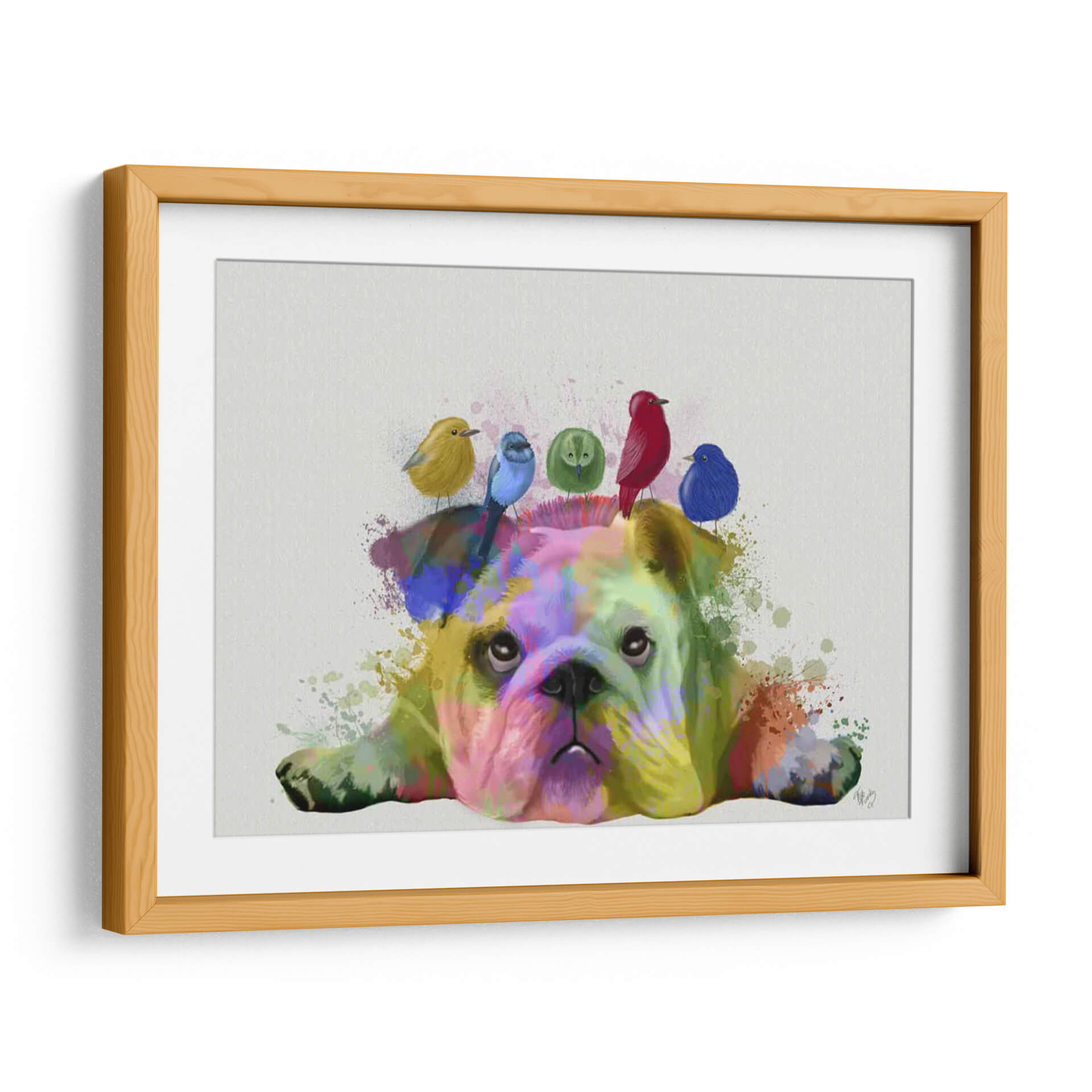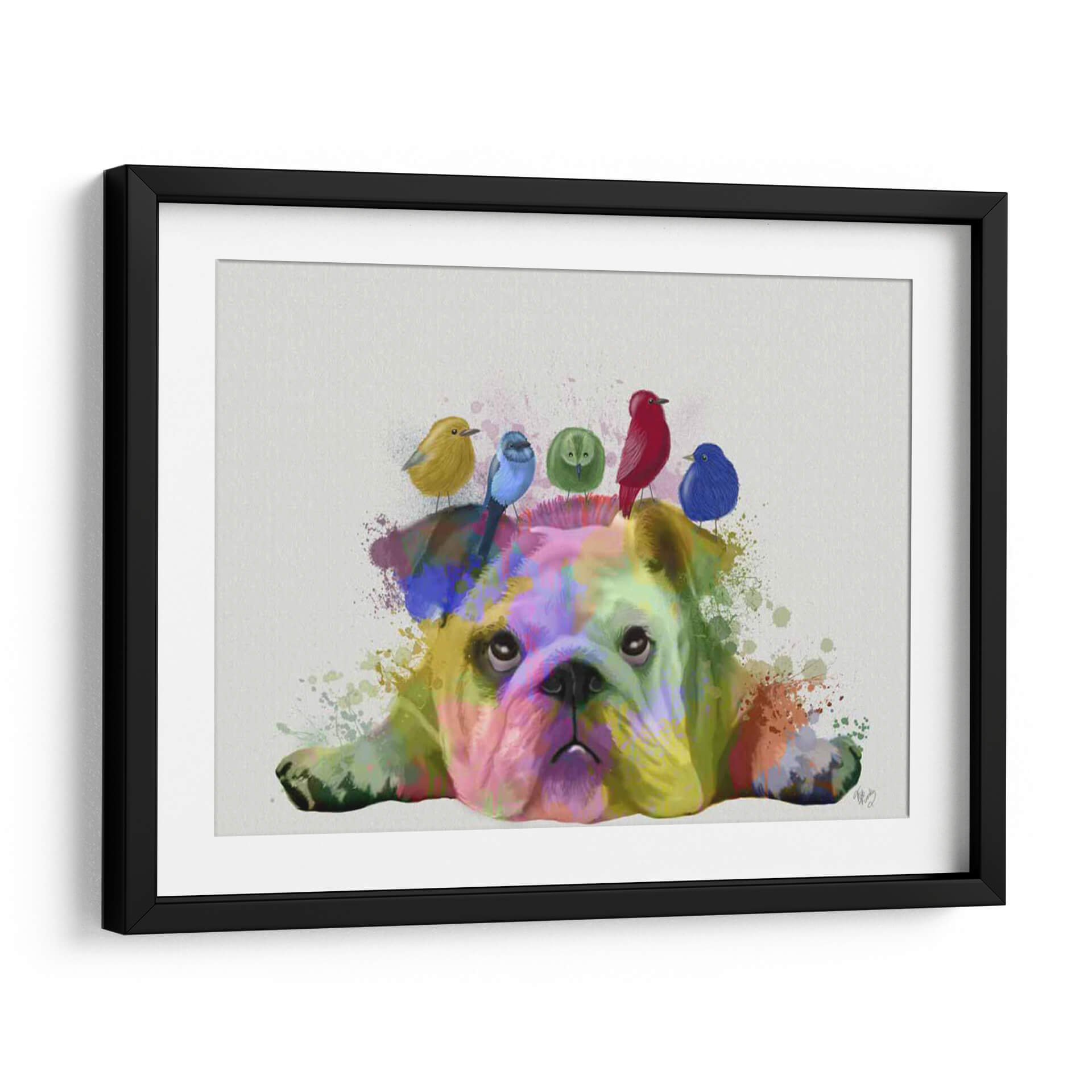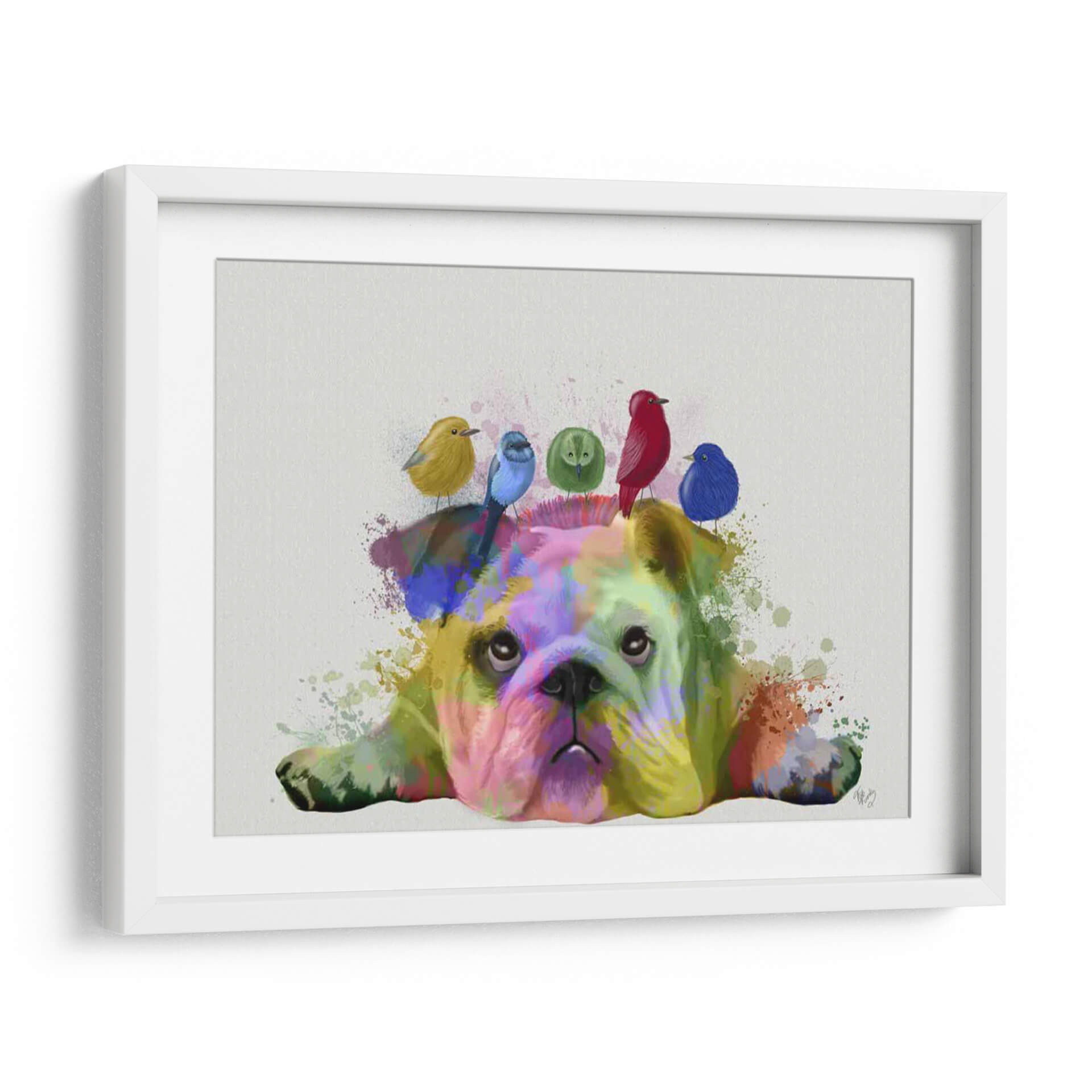 Transforma tu espacio con el cautivador cuadro decorativo "Bulldog y Pájaros Ingleses, Splash del Arcoíris". Esta obra de arte digital de Fab Funky presenta a un entrañable bulldog inglés sumergido en una explosión de colores vibrantes, con la cabeza adornada por una curiosa bandada de pajaritos en tonos vivos. La técnica de salpicadura de pintura, que recuerda al arte pop y al expresionismo abstracto, dota a la pieza de una energía única y un dinamismo sorprendente. Los colores primarios y secundarios se entrelazan de forma audaz sobre el pelaje del bulldog, creando un contraste fascinante con el fondo neutro y los pájaros de plumaje intenso. El resultado es una composición juguetona y llena de vida, que irradia alegría y un toque de irreverencia. Ideal para añadir un acento de color y personalidad a salones modernos, oficinas creativas o cualquier rincón que necesite un toque de optimismo y originalidad. Este cuadro es una pieza que invita a la conversación y captura la mirada, perfecta para amantes de los animales y del arte contemporáneo audaz.