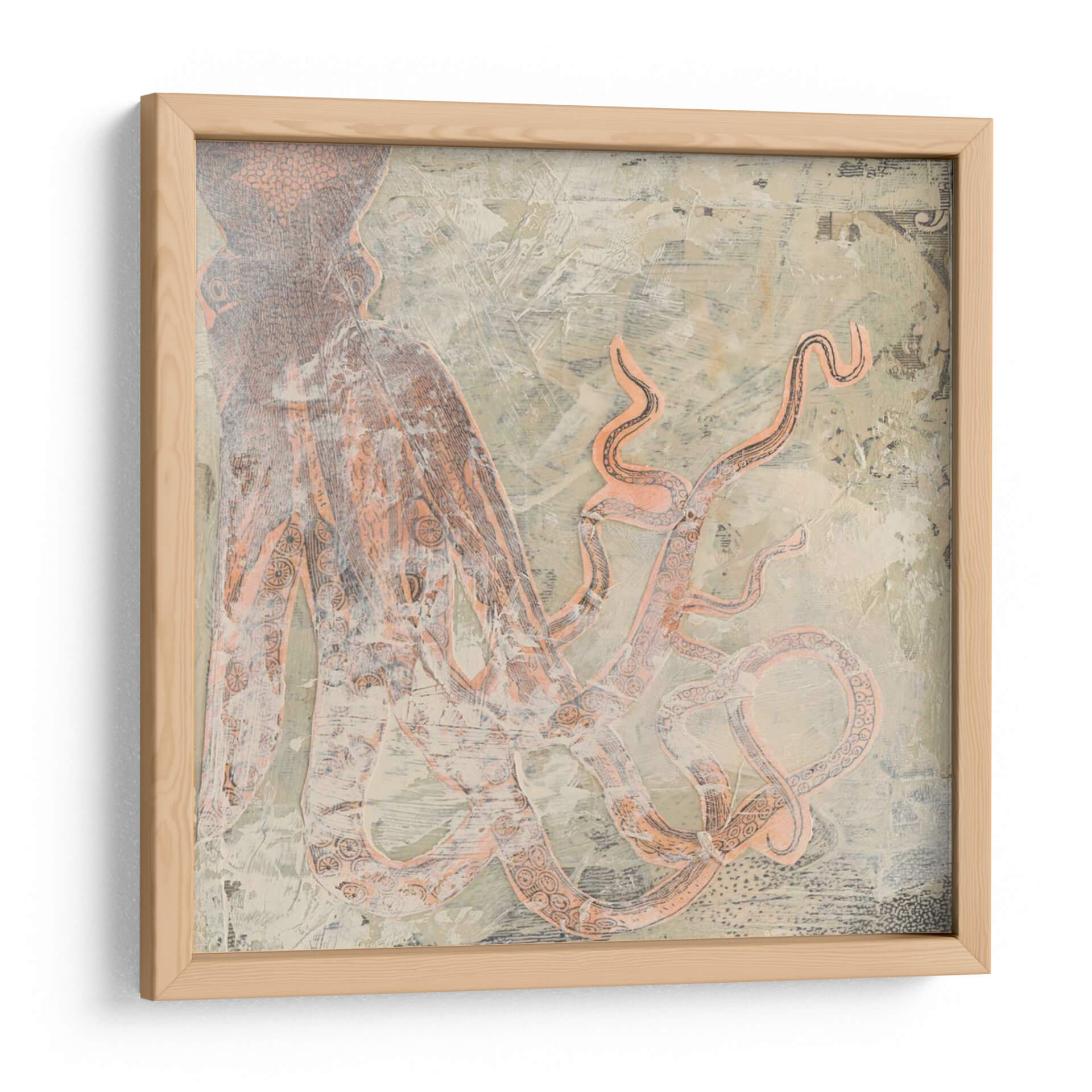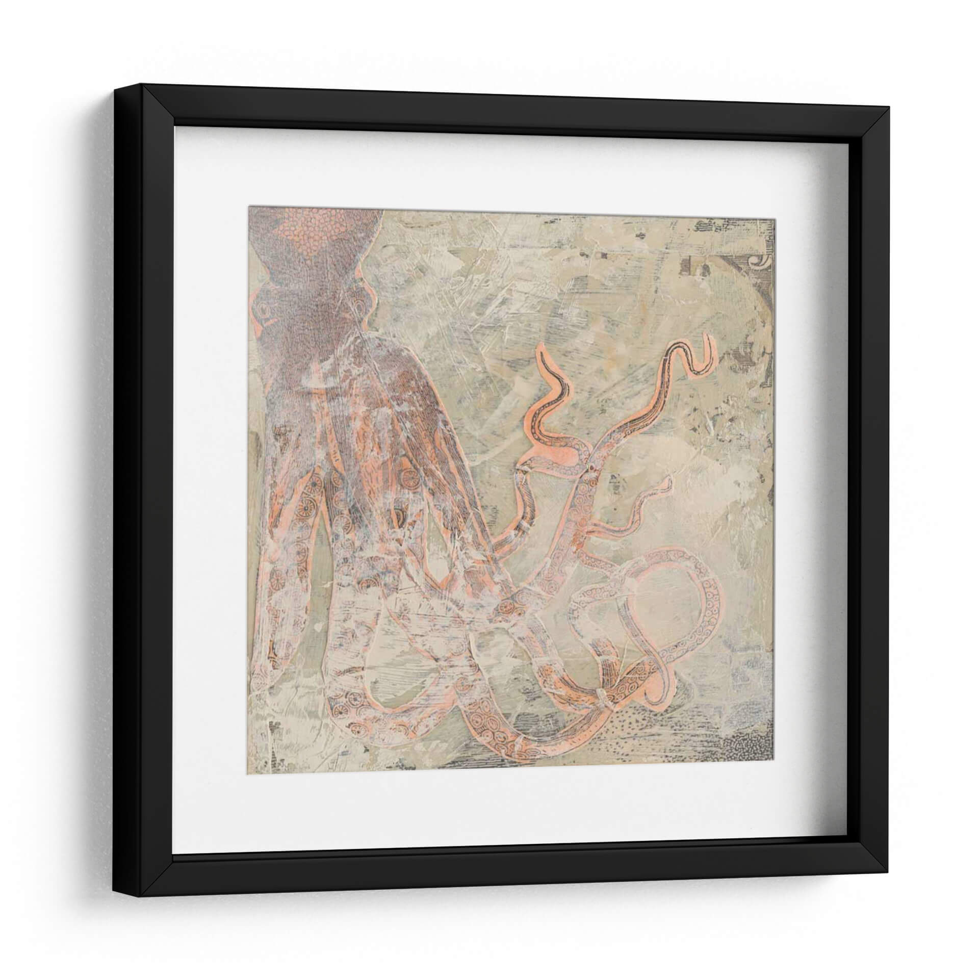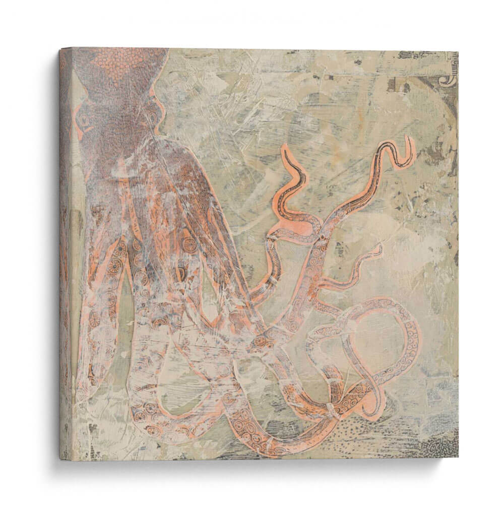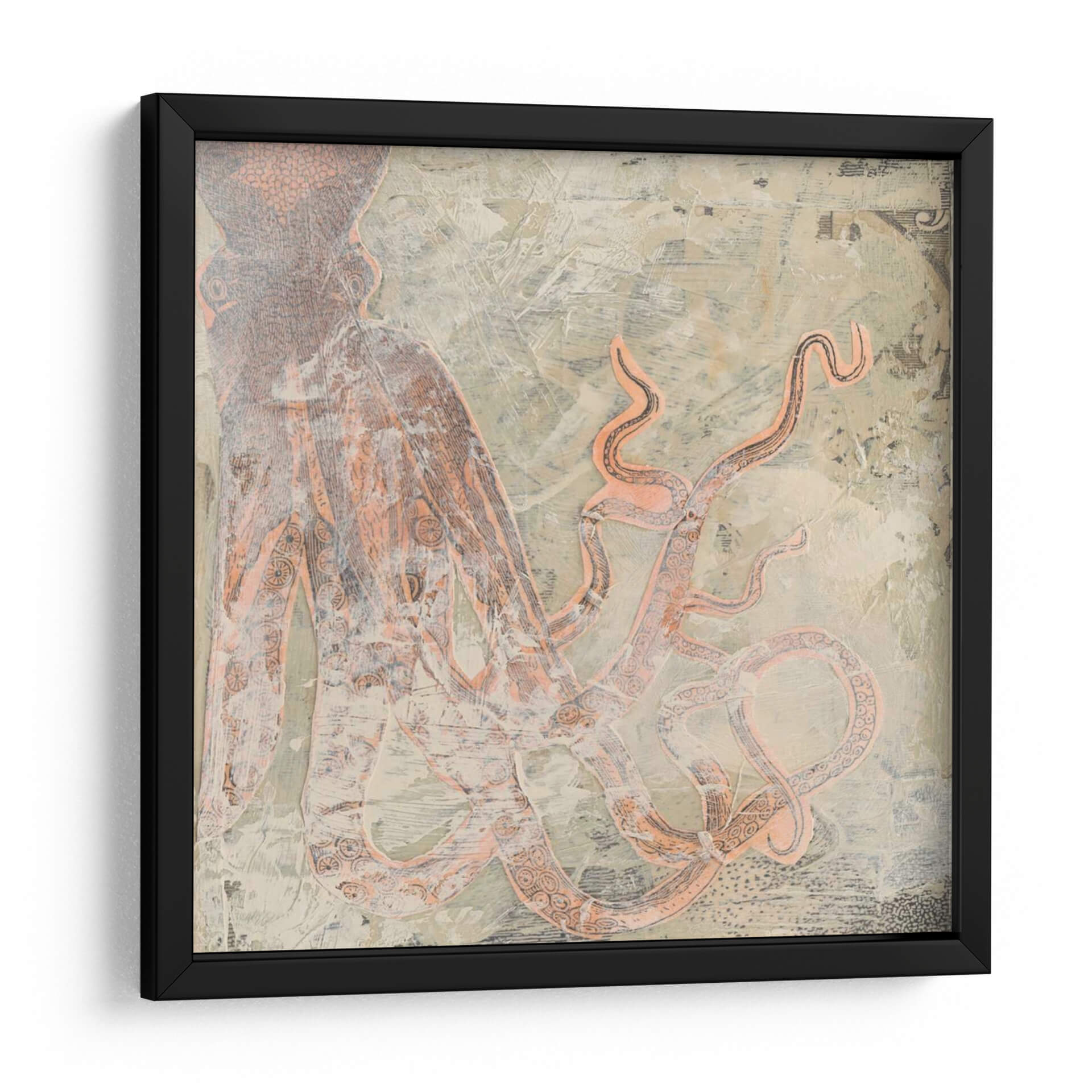 Sumérgete en las profundidades del océano con "Camafeo Costero II", una cautivadora obra de arte de June Erica Vess que evoca la majestuosidad del mundo marino. Esta pieza presenta una representación estilizada de un pulpo, cuyas volutas y tentáculos se entrelazan con un fondo texturizado que sugiere la arena y las corrientes marinas. La paleta de colores, dominada por tonos ocres, verdes apagados y acentos de coral, crea una atmósfera serena y a la vez intrigante. El estilo, que fusiona elementos figurativos con una estética casi de grabado o esténcil, aporta un toque contemporáneo y sofisticado. La composición, centrada en la figura principal, invita a la contemplación de las formas orgánicas y los sutiles detalles que adornan los apéndices del pulpo. Este cuadro decorativo es ideal para añadir un toque de misterio y elegancia natural a salones, estudios o cualquier espacio que busque una conexión con la naturaleza marina. Su diseño único lo convierte en un punto focal que inspira tranquilidad y admiración, perfecto para quienes aprecian el arte con alma y carácter.
