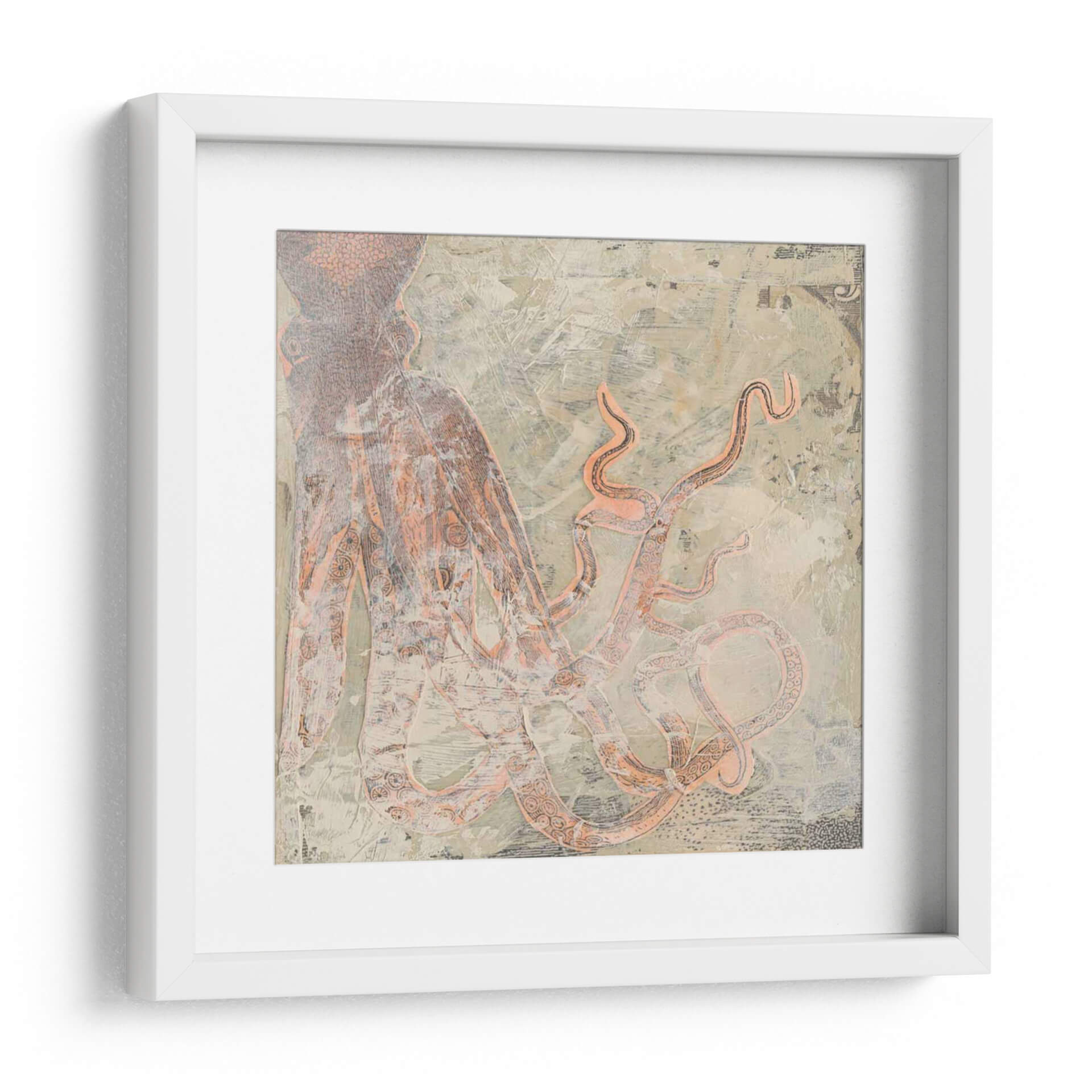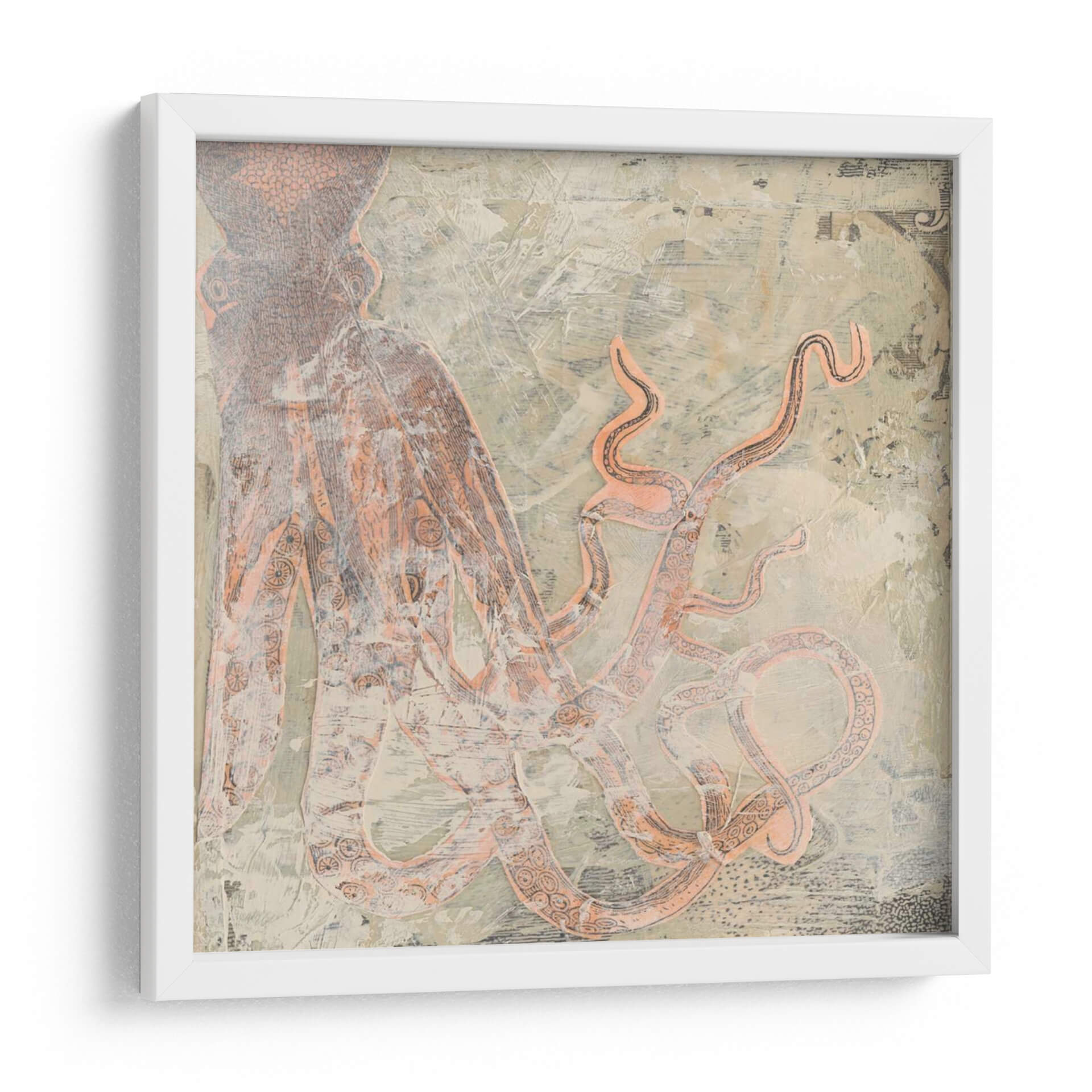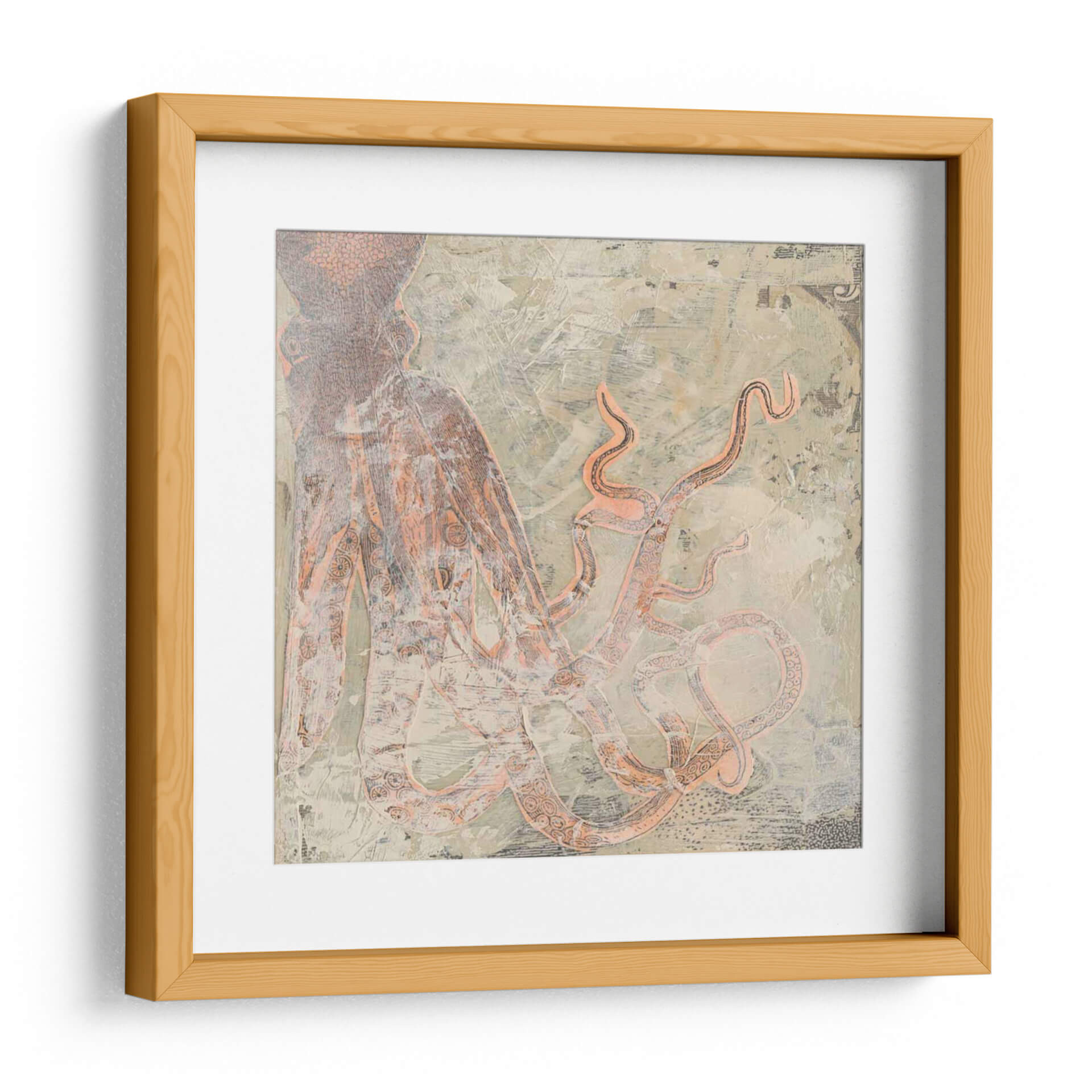 Sumérgete en las profundidades del océano con "Camafeo Costero II", una cautivadora obra de arte de June Erica Vess que evoca la majestuosidad del mundo marino. Esta pieza presenta una representación estilizada de un pulpo, cuyas volutas y tentáculos se entrelazan con un fondo texturizado que sugiere la arena y las corrientes marinas. La paleta de colores, dominada por tonos ocres, verdes apagados y acentos de coral, crea una atmósfera serena y a la vez intrigante. El estilo, que fusiona elementos figurativos con una estética casi de grabado o esténcil, aporta un toque contemporáneo y sofisticado. La composición, centrada en la figura principal, invita a la contemplación de las formas orgánicas y los sutiles detalles que adornan los apéndices del pulpo. Este cuadro decorativo es ideal para añadir un toque de misterio y elegancia natural a salones, estudios o cualquier espacio que busque una conexión con la naturaleza marina. Su diseño único lo convierte en un punto focal que inspira tranquilidad y admiración, perfecto para quienes aprecian el arte con alma y carácter.