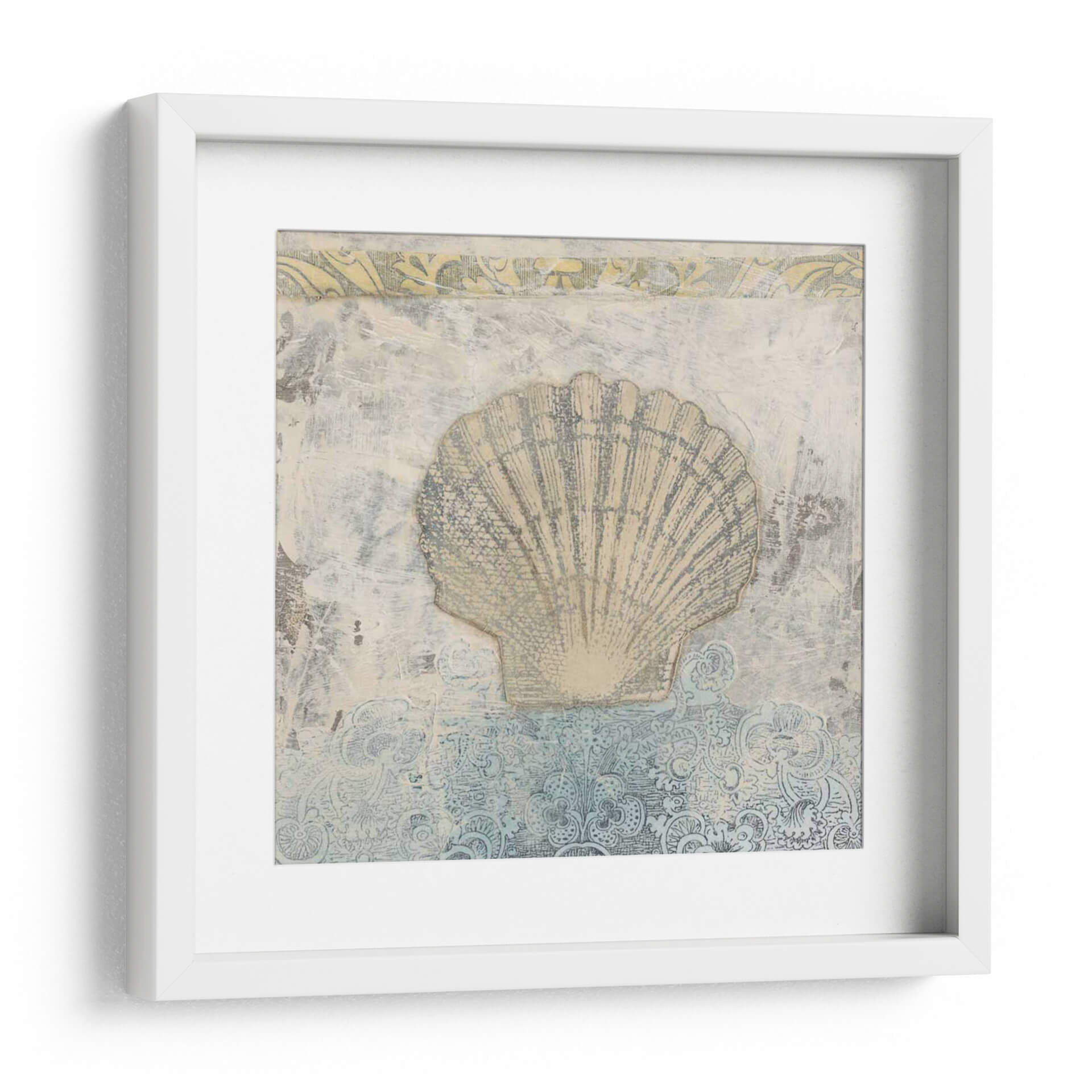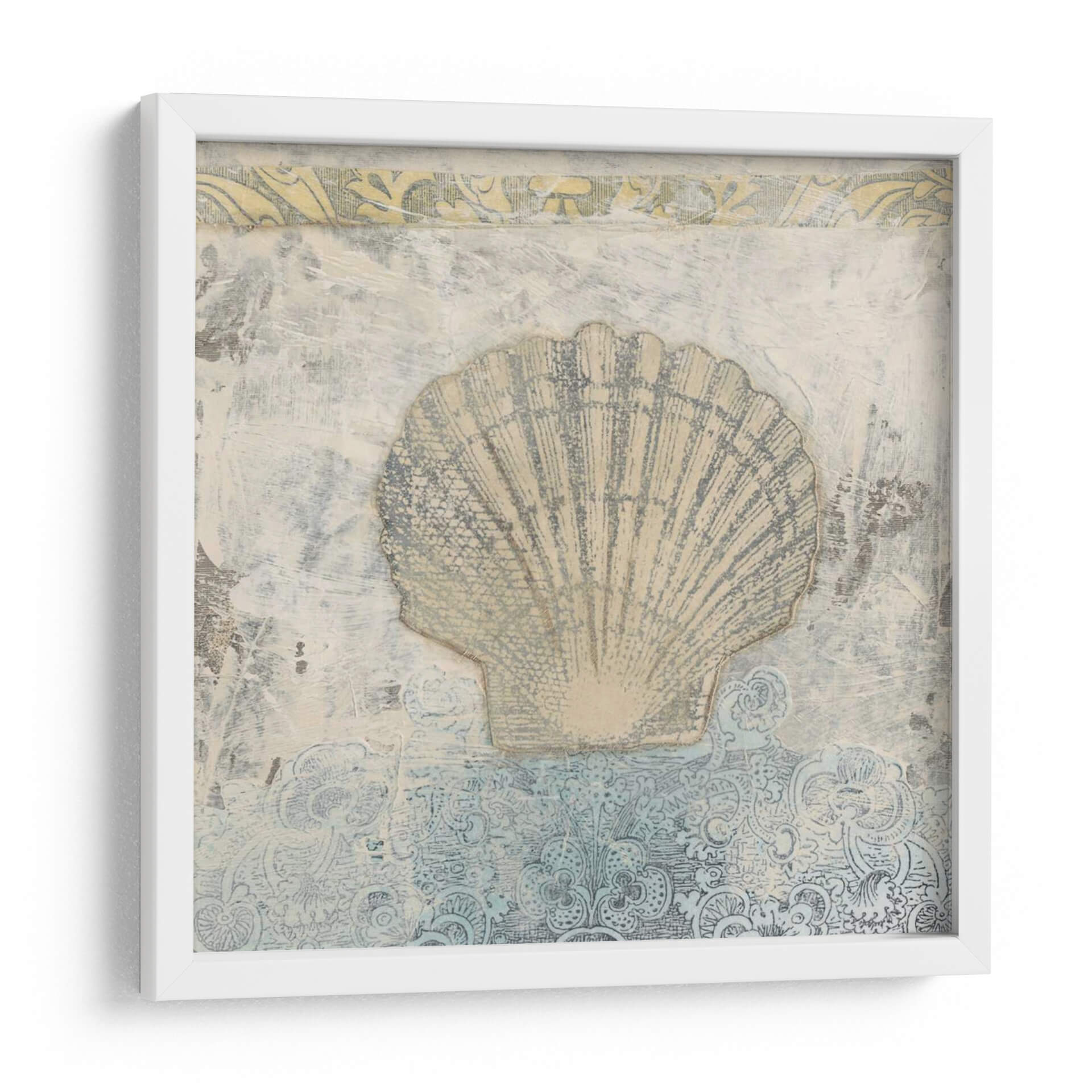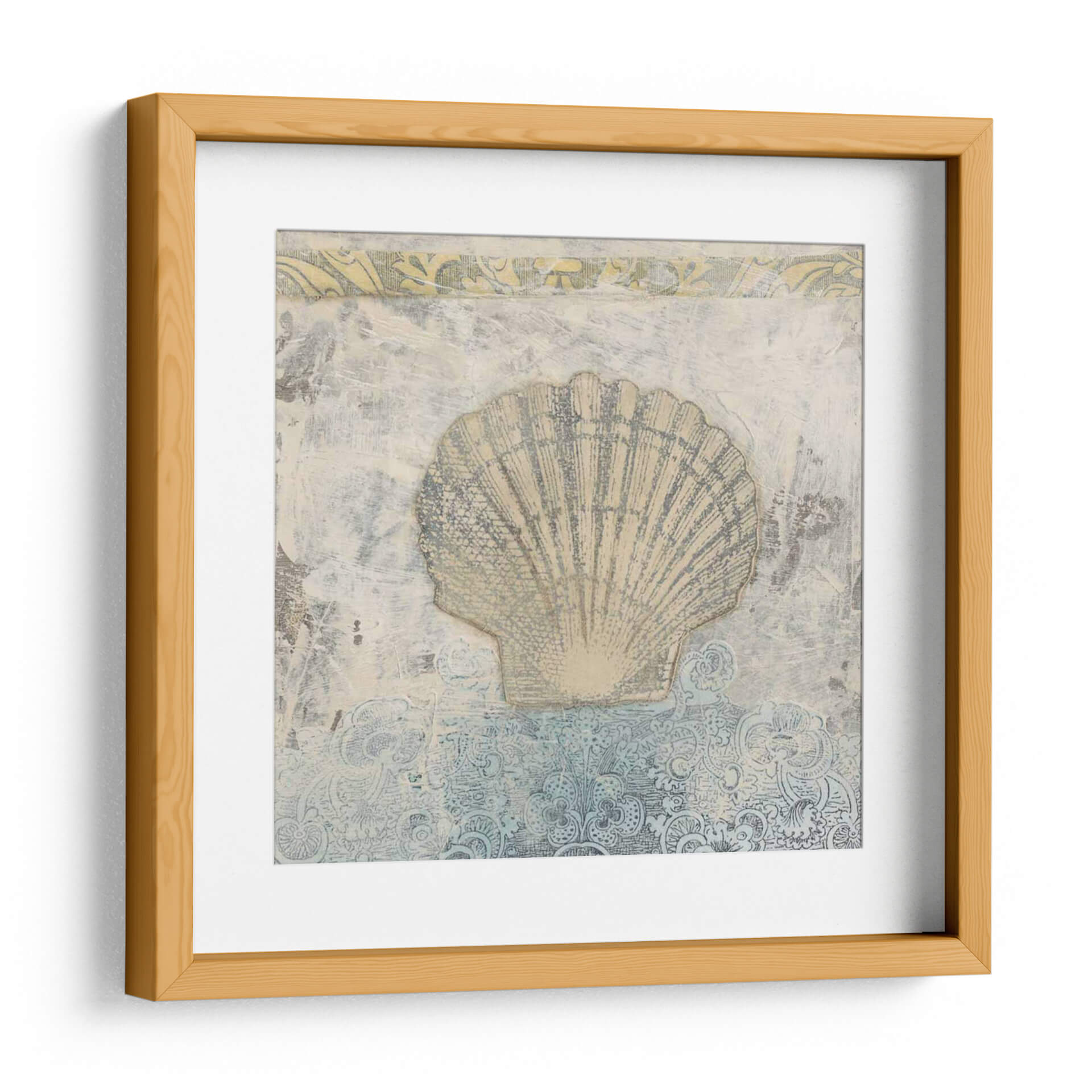Sumérgete en la serenidad costera con "Caminueve Costero V", una obra de arte cautivadora de June Erica Vess. Este cuadro decorativo captura la delicada belleza de una concha marina sobre un fondo texturizado que evoca la calma del océano. La paleta de colores, dominada por tonos suaves de azul pálido, blanco roto y toques de gris, crea una atmósfera relajante y etérea, perfecta para cualquier espacio que busque un refugio de tranquilidad. La composición presenta una concha de gran tamaño en el centro, con detalles intrincados que sugieren las marcas del tiempo y la naturaleza. La parte inferior de la obra se adorna con un patrón ornamental en tono azul claro, que imita las olas o encajes marinos, añadiendo profundidad y un toque de sofisticación. La técnica mixta y las texturas visibles aportan una cualidad táctil a la pieza, invitando a la contemplación. Este cuadro es ideal para dormitorios, baños o cualquier estancia donde se desee infundir una sensación de paz y conexión con el mar. Añade un toque de elegancia costera a tu hogar con esta pieza única.