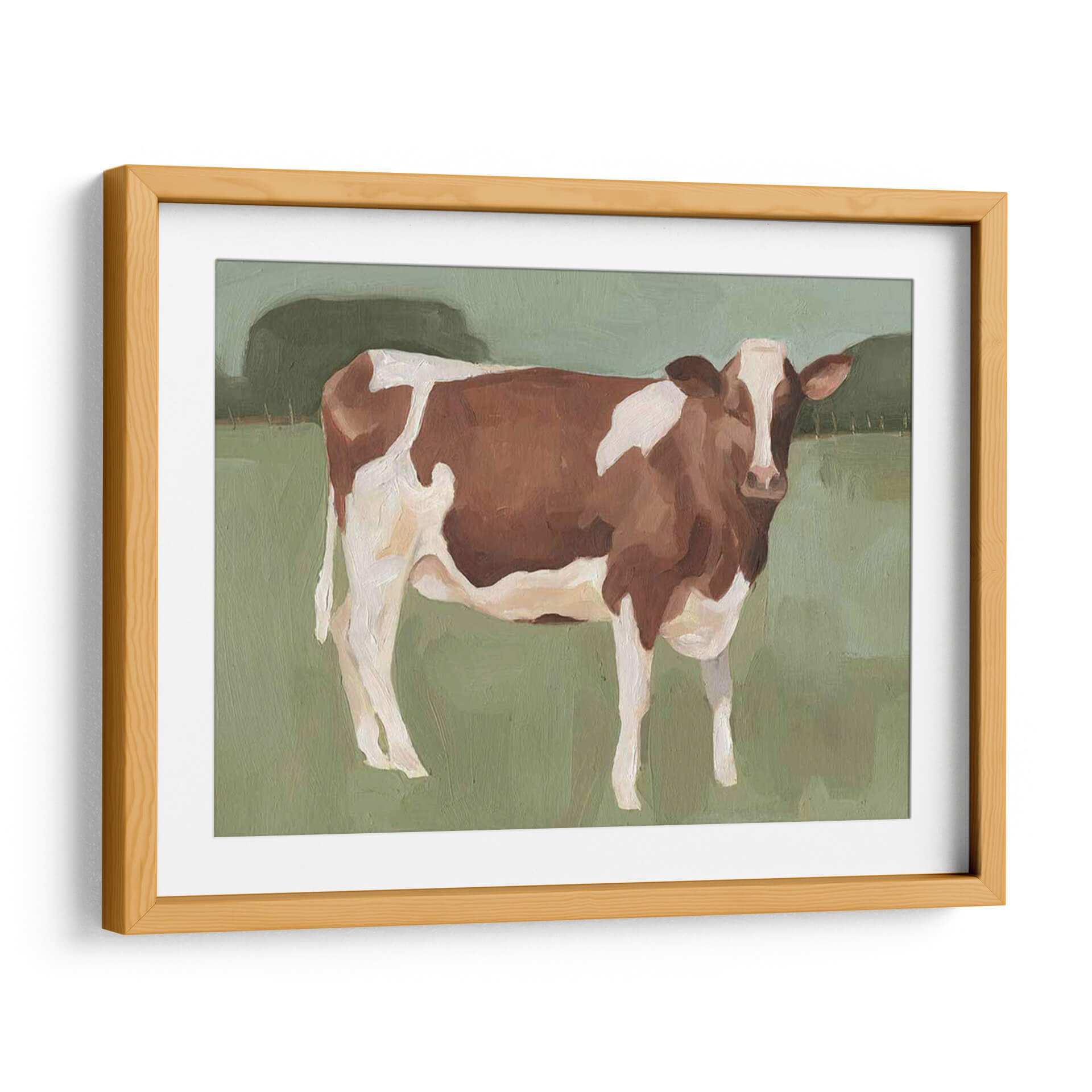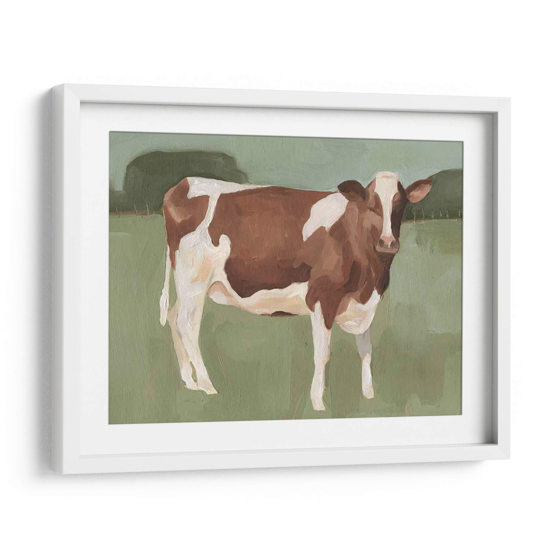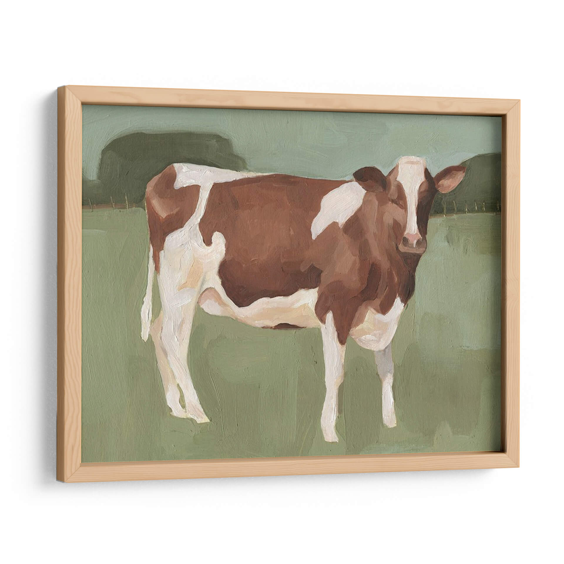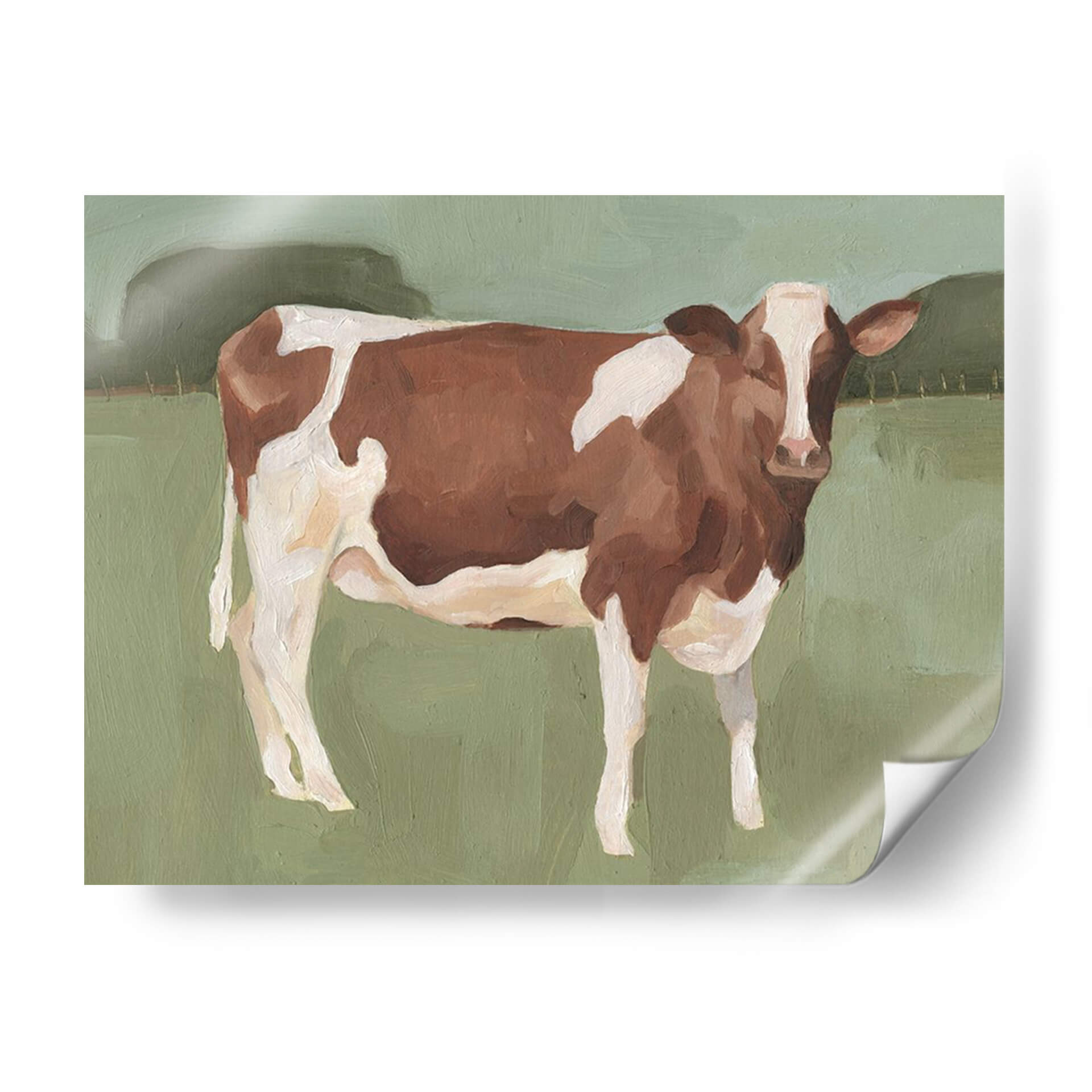 Atrae la serenidad del campo a tu hogar con "Campo Bovino II", una cautivadora obra de arte de Emma Scarvey. Este cuadro decorativo captura la esencia de una vaca de raza parda y blanca, enmarcada por un paisaje bucólico y minimalista. Los tonos verdes suaves del fondo, junto con las pinceladas visibles que definen a la vaca, crean una atmósfera de calma y conexión con la naturaleza. La composición se centra en la figura del animal, invitando a la contemplación y aportando una sensación de paz rústica a cualquier habitación. Ideal para salones, dormitorios o estudios que busquen un toque de tranquilidad campestre y sofisticación contemporánea. La paleta de colores terrosos y apagados asegura una integración armónica en diversos estilos decorativos, desde el rústico moderno hasta el escandinavo. Transforma tu espacio con la belleza sencilla y la serenidad que emana de "Campo Bovino II", una pieza que evoca recuerdos de días tranquilos y la vida rural.