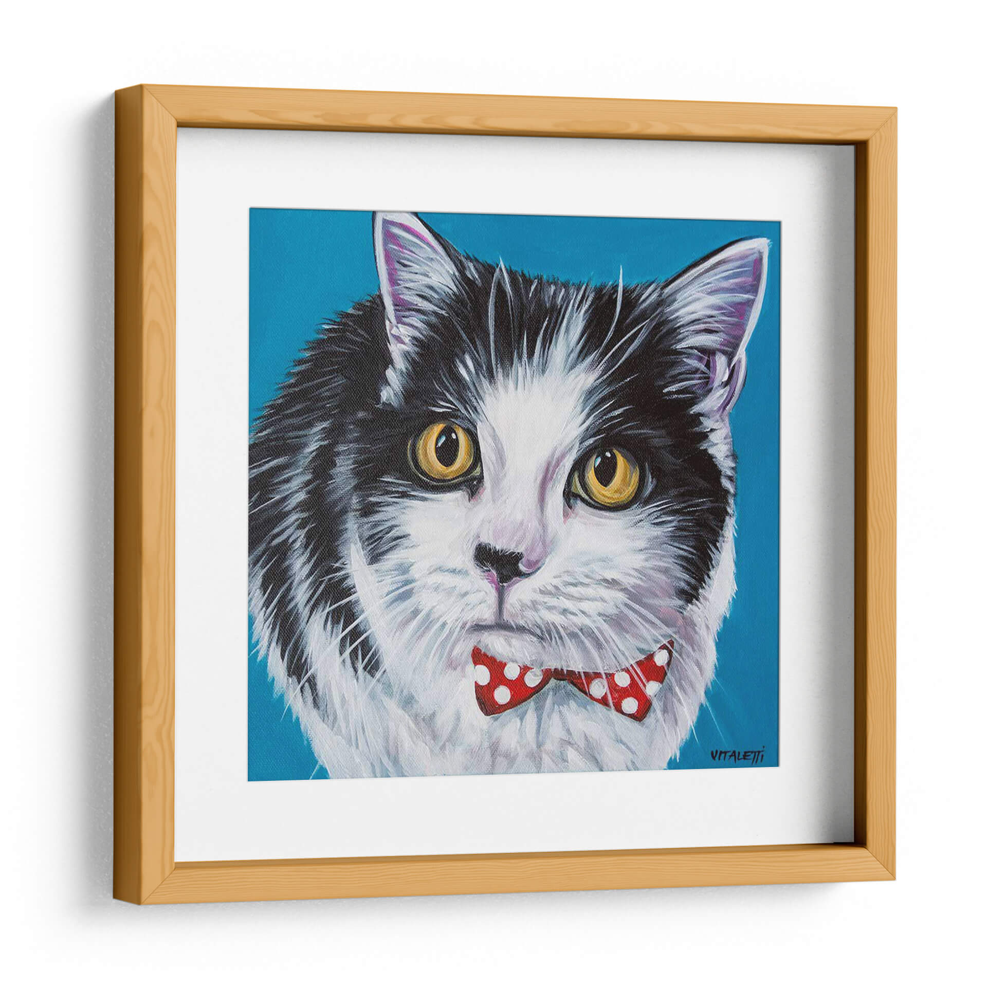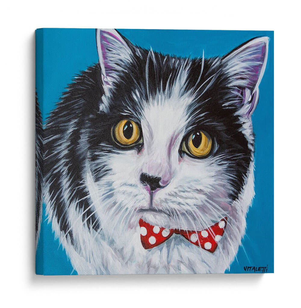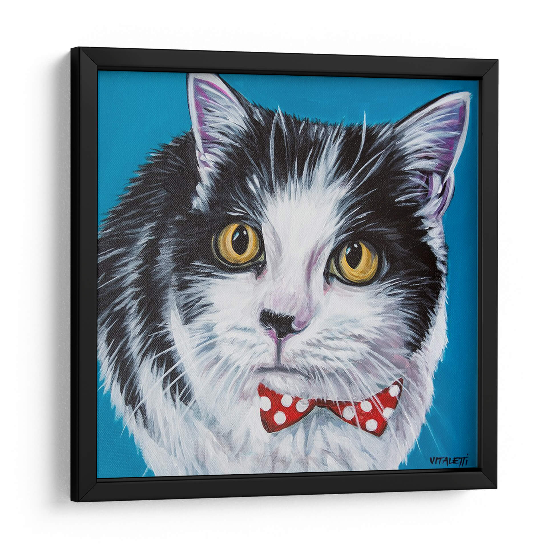 Captura la esencia juguetona y encantadora de tu felino favorito con el cuadro decorativo "Caty Cat I" de Carolee Vitaletti. Esta obra de arte presenta un cautivador retrato de un gato atigrado blanco y negro, adornado con un llamativo pajarita roja de lunares blancos. Los penetrantes ojos amarillos del gato, llenos de curiosidad y vivacidad, son el punto focal de la pieza, atrayendo la mirada del espectador. El vibrante fondo azul realza los detalles intrincados del pelaje y la expresión expresiva del animal, creando una atmósfera alegre y acogedora. La técnica pictórica detallada y el estilo expresionista aportan una sensación de profundidad y personalidad a la obra, haciéndola más que una simple representación, sino una ventana al alma de un gato carismático. Este cuadro decorativo es perfecto para los amantes de los gatos y para aquellos que buscan añadir un toque de color y carácter a sus espacios. Imagina esta pieza aportando calidez a una sala de estar, un toque de personalidad a una oficina o una dosis de alegría a un dormitorio. "Caty Cat I" es una adición encantadora y distintiva a cualquier colección de arte de pared, ideal para transformar cualquier habitación en un refugio lleno de encanto felino y estilo.
