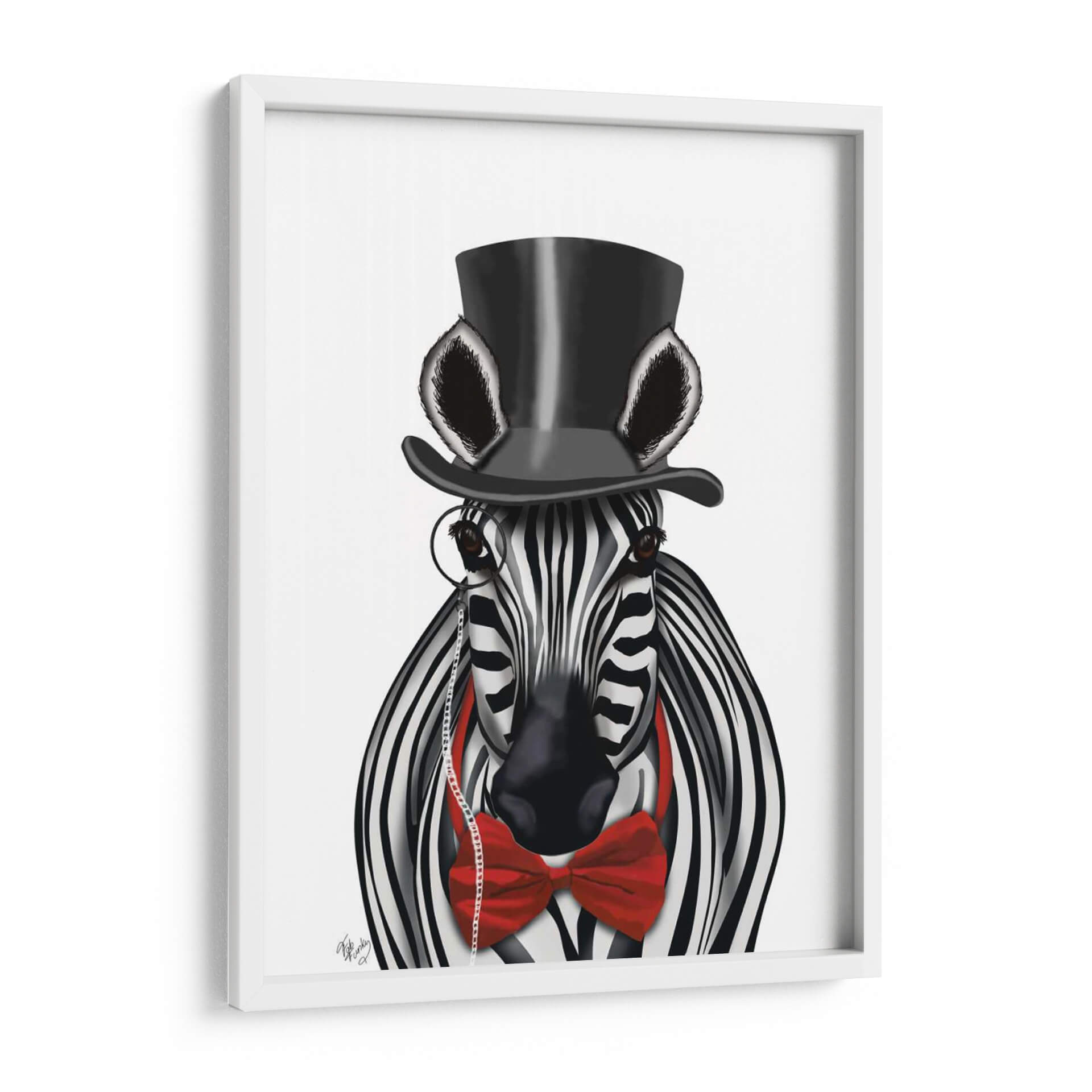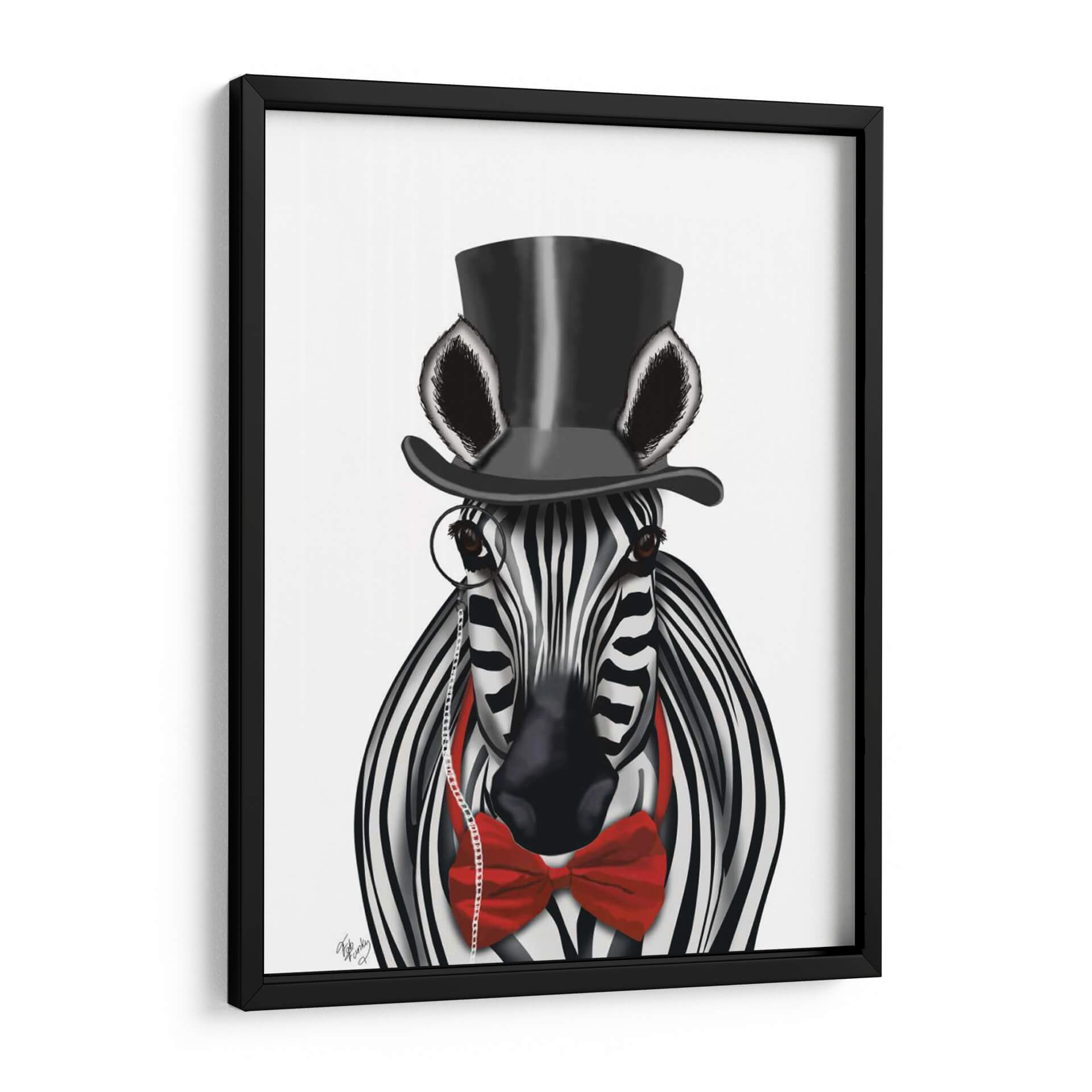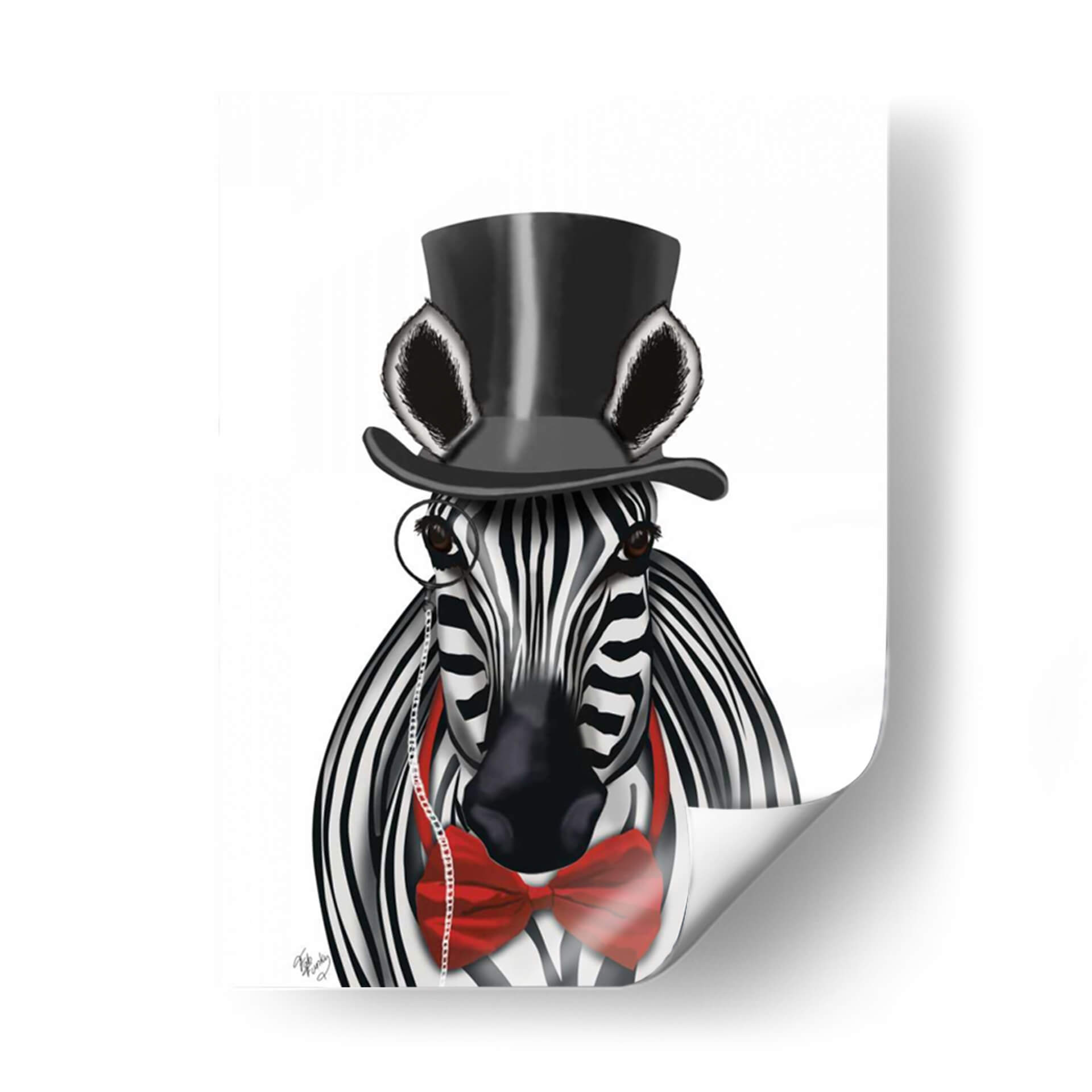 Añada un toque de elegancia y audacia a su espacio con "Cebra Con Sombrero De Copa Y Pajarita 2, Hacia Adelante", una obra de arte digital que redefine la decoración contemporánea. Esta cautivadora pieza presenta una cebra vestida con un sombrero de copa negro y una llamativa pajarita roja, completando su look con un monóculo clásico. La combinación de blanco y negro de las rayas de la cebra contrasta vívidamente con el vibrante rojo de la pajarita y el negro profundo del sombrero, creando un impacto visual inmediato. El estilo distintivo del artista Fab Funky fusiona lo realista con lo caprichoso, resultando en una imagen sorprendentemente sofisticada y juguetona a la vez. El fondo neutro y limpio permite que el personaje central sea el protagonista indiscutible, asegurando que esta obra de arte se convierta en el punto focal de cualquier habitación. Ideal para salones modernos, oficinas con personalidad o incluso como una pieza de declaración en un dormitorio, este cuadro decorativo aporta un aire de distinción y humor. Es perfecto para quienes buscan piezas de pared únicas que provoquen conversación y reflejen un gusto refinado y un espíritu libre. Descubra cómo este animal con acento aristocrático puede transformar su decoración y añadir carácter a sus paredes, ofreciendo una dosis de arte contemporáneo que combina a la perfección estilo y originalidad.