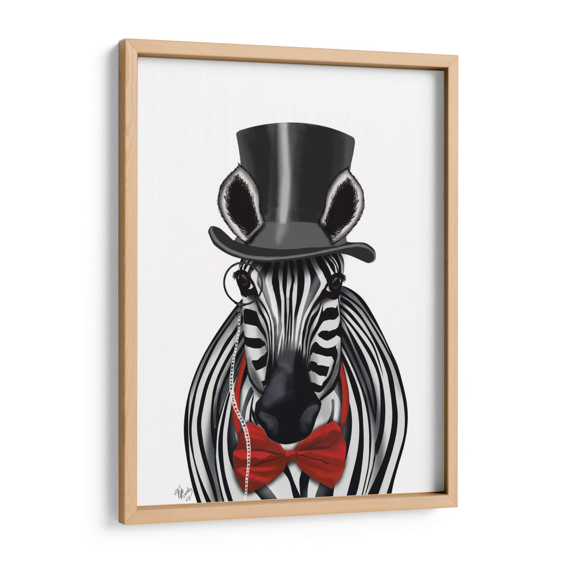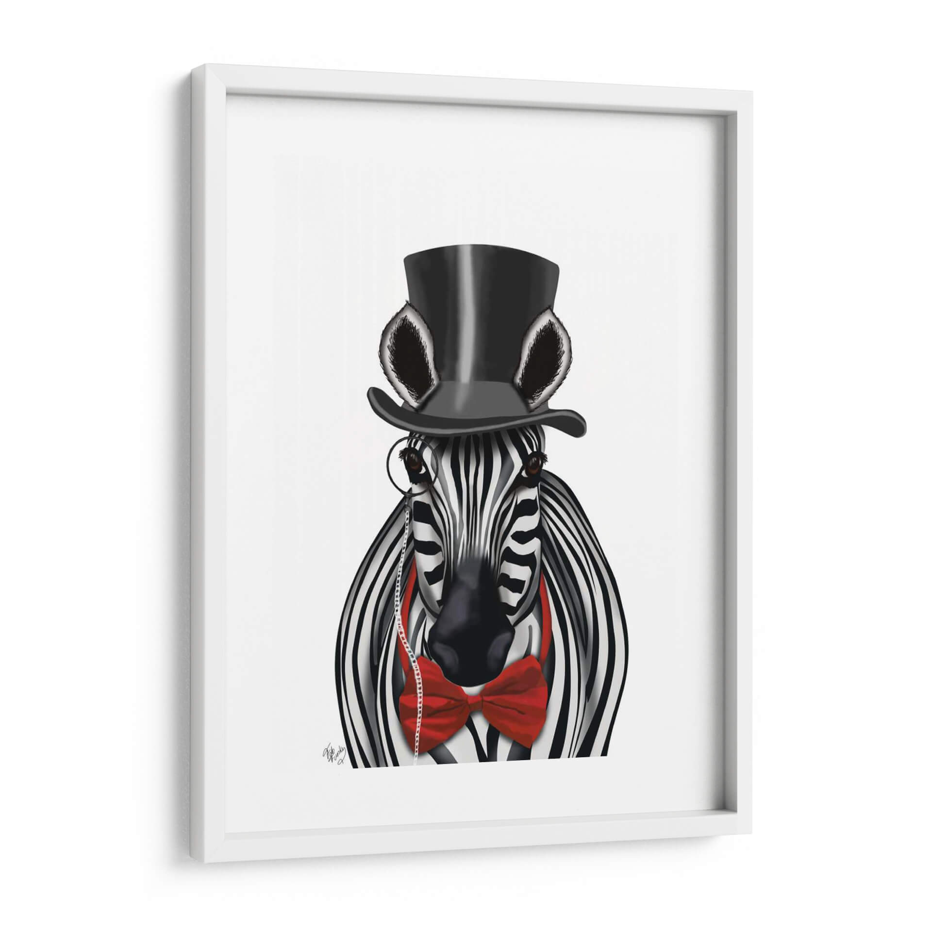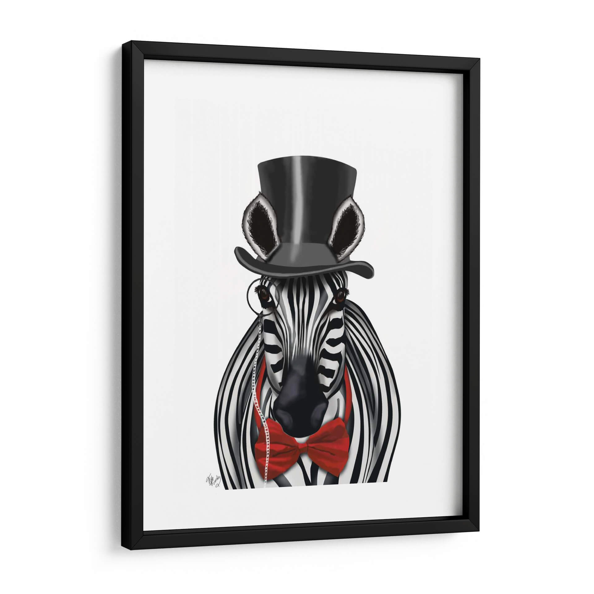 Añada un toque de elegancia y audacia a su espacio con "Cebra Con Sombrero De Copa Y Pajarita 2, Hacia Adelante", una obra de arte digital que redefine la decoración contemporánea. Esta cautivadora pieza presenta una cebra vestida con un sombrero de copa negro y una llamativa pajarita roja, completando su look con un monóculo clásico. La combinación de blanco y negro de las rayas de la cebra contrasta vívidamente con el vibrante rojo de la pajarita y el negro profundo del sombrero, creando un impacto visual inmediato. El estilo distintivo del artista Fab Funky fusiona lo realista con lo caprichoso, resultando en una imagen sorprendentemente sofisticada y juguetona a la vez. El fondo neutro y limpio permite que el personaje central sea el protagonista indiscutible, asegurando que esta obra de arte se convierta en el punto focal de cualquier habitación. Ideal para salones modernos, oficinas con personalidad o incluso como una pieza de declaración en un dormitorio, este cuadro decorativo aporta un aire de distinción y humor. Es perfecto para quienes buscan piezas de pared únicas que provoquen conversación y reflejen un gusto refinado y un espíritu libre. Descubra cómo este animal con acento aristocrático puede transformar su decoración y añadir carácter a sus paredes, ofreciendo una dosis de arte contemporáneo que combina a la perfección estilo y originalidad.