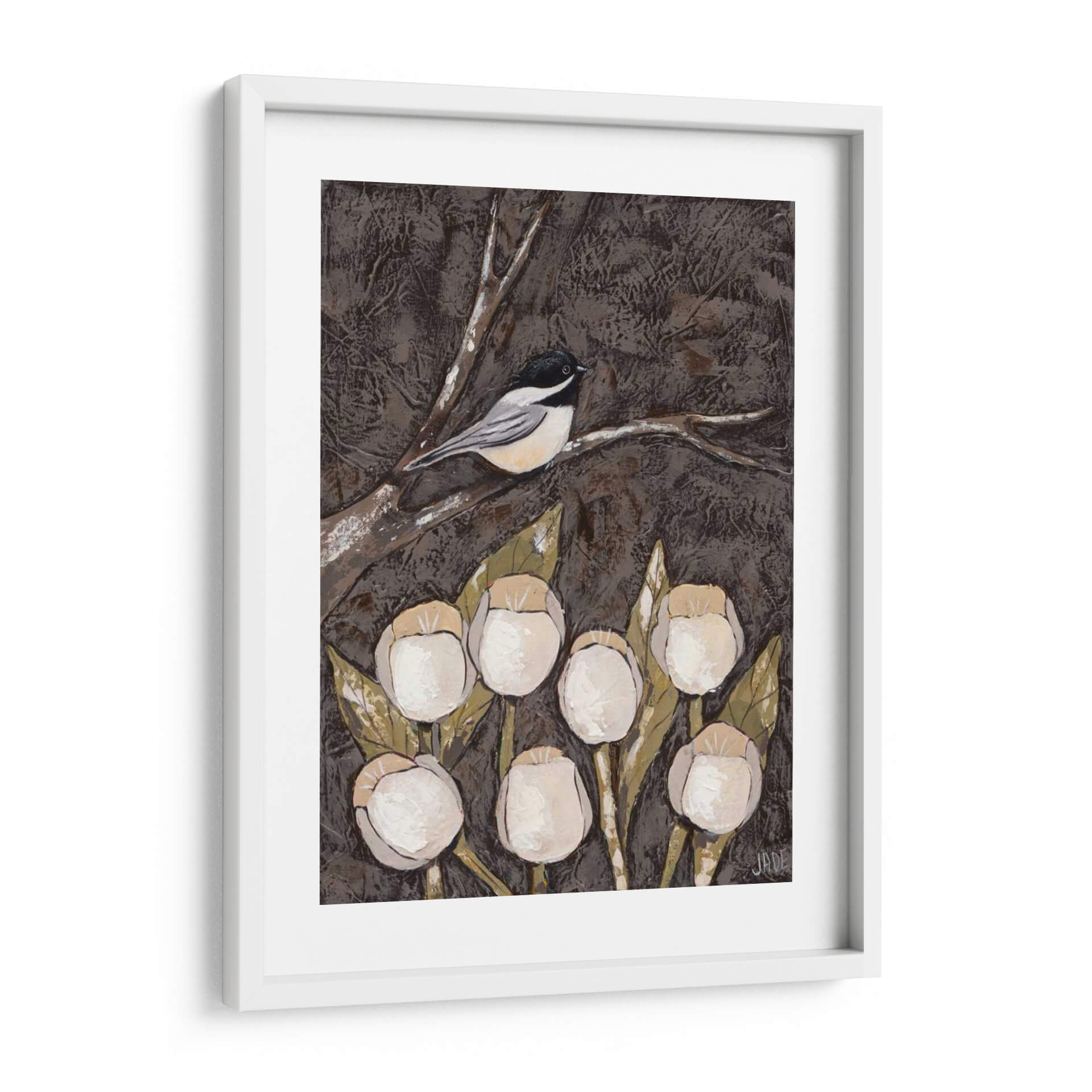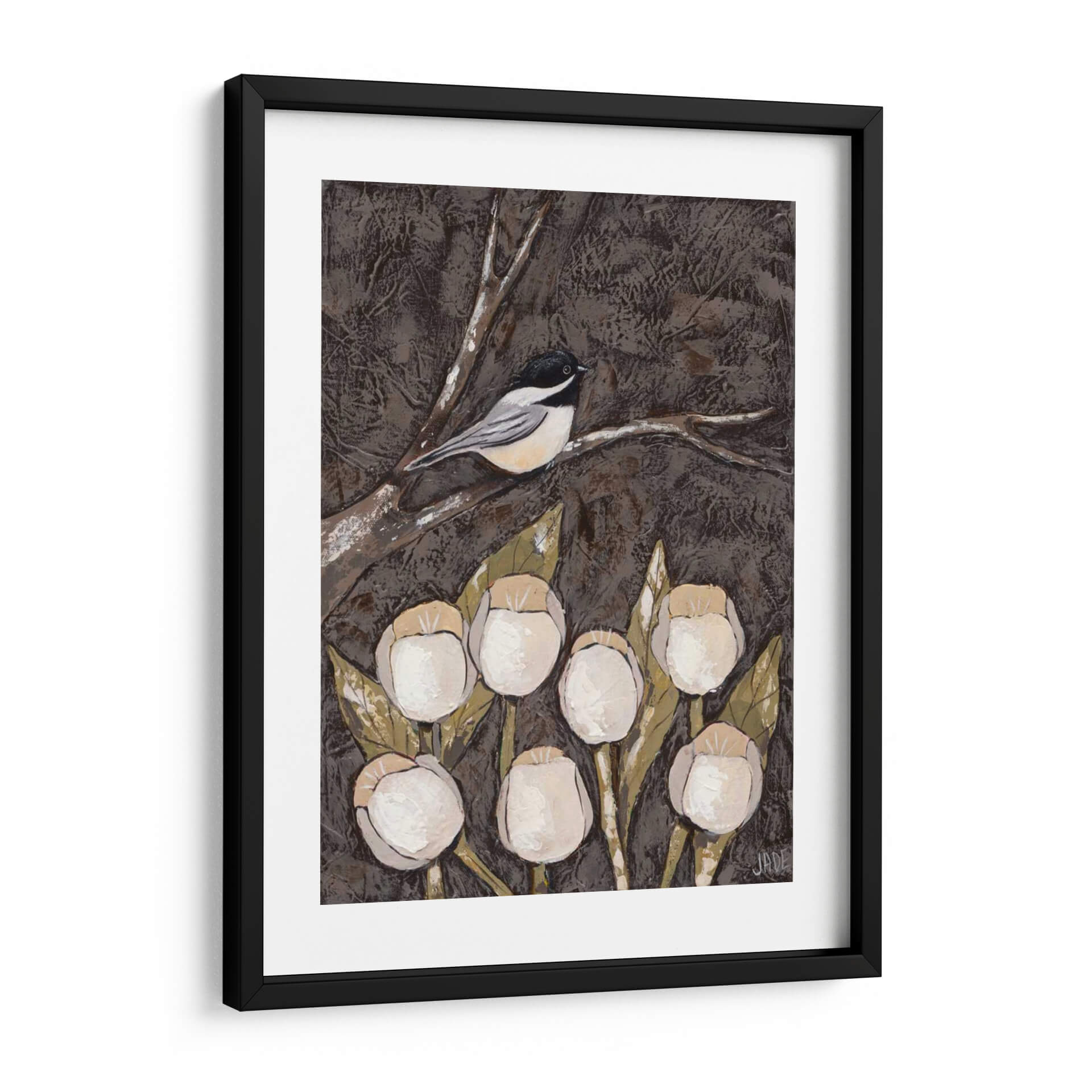 Sumérgete en la serena belleza de "Chickadee Y Tulipanes I", una obra de arte que captura la delicadeza de la naturaleza con un toque contemporáneo. Jade Reynolds nos presenta un cuadro decorativo donde un tierno pájaro petirrojo se posa sobre una rama, rodeado por el suave florecer de tulipanes blancos y cremas. La paleta de colores, dominada por tonos tierra profundos, grises texturizados y toques de blanco puro, crea una atmósfera de calma y elegancia, perfecta para cualquier espacio que busque un refugio de paz visual. La pincelada detallada y la composición equilibrada invitan a la contemplación, haciendo de esta pieza un punto focal encantador para salas de estar, dormitorios o estudios. Ideal para quienes aprecian el arte figurativo con un aire moderno y una conexión profunda con el mundo natural. Este cuadro no solo embellece, sino que también evoca una sensación de tranquilidad y la efímera belleza de la primavera. Añade un toque de sofisticación natural a tu hogar con esta cautivadora pieza.