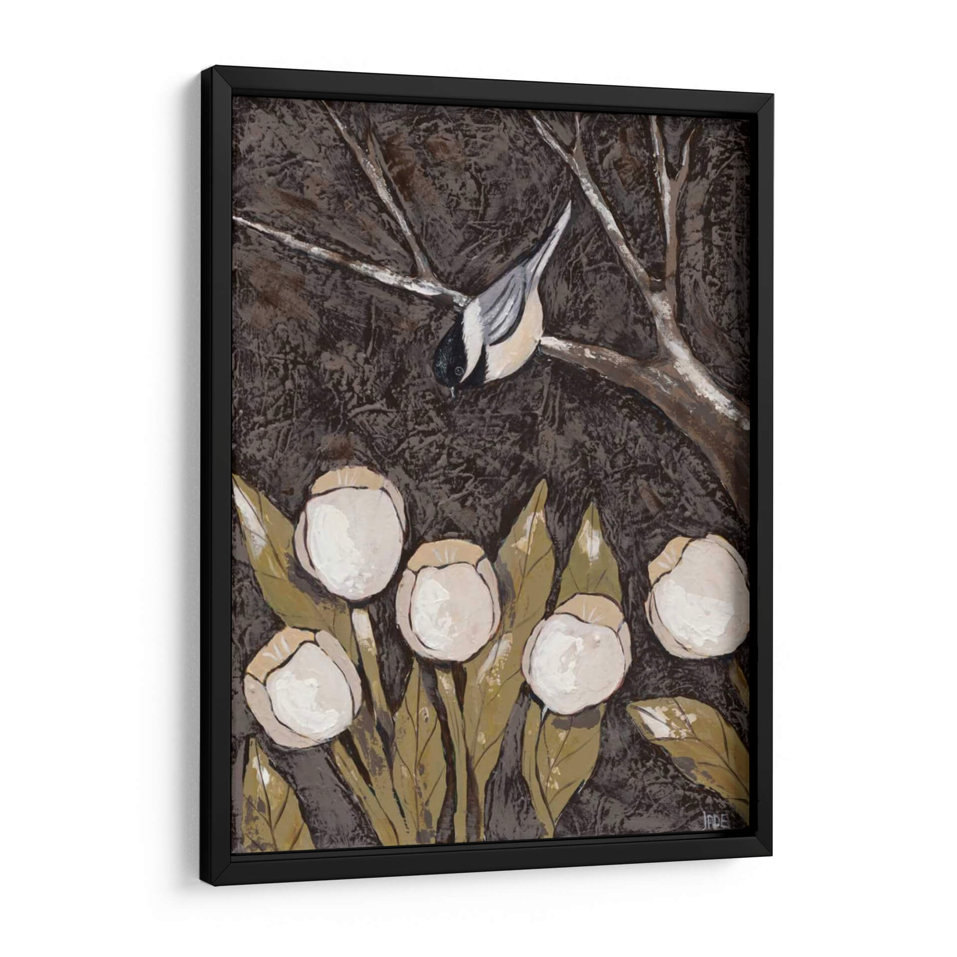 Adéntrate en la delicadeza y la serenidad con "Chickadee Y Tulipanes Ii", una obra de arte que captura la belleza efímera de la naturaleza en un lienzo cautivador. El artista Jade Reynolds nos presenta una escena íntima donde un pájaro petirrojo se posa sobre una rama, observando un grupo de capullos de tulipán listos para florecer. La paleta de colores, dominada por tonos tierra, grises profundos y blancos cremosos, crea una atmósfera de tranquilidad y contemplación, perfecta para añadir un toque de calma a tu hogar u oficina. La textura rica y casi táctil de la pintura evoca la frescura del bosque, invitando a la reflexión y al disfrute de los pequeños detalles. Este cuadro decorativo es ideal para quienes buscan una pieza que combine la elegancia sutil con la conexión con el mundo natural. Su estilo pictórico, que fusiona realismo con una pincelada expresiva, lo convierte en un punto focal armonioso para cualquier espacio, desde un rincón acogedor en el dormitorio hasta una pared destacada en la sala de estar. "Chickadee Y Tulipanes Ii" no es solo una imagen, es una invitación a la paz interior y a la apreciación de la belleza que nos rodea, un recordatorio constante de la delicada danza entre la vida y la naturaleza.