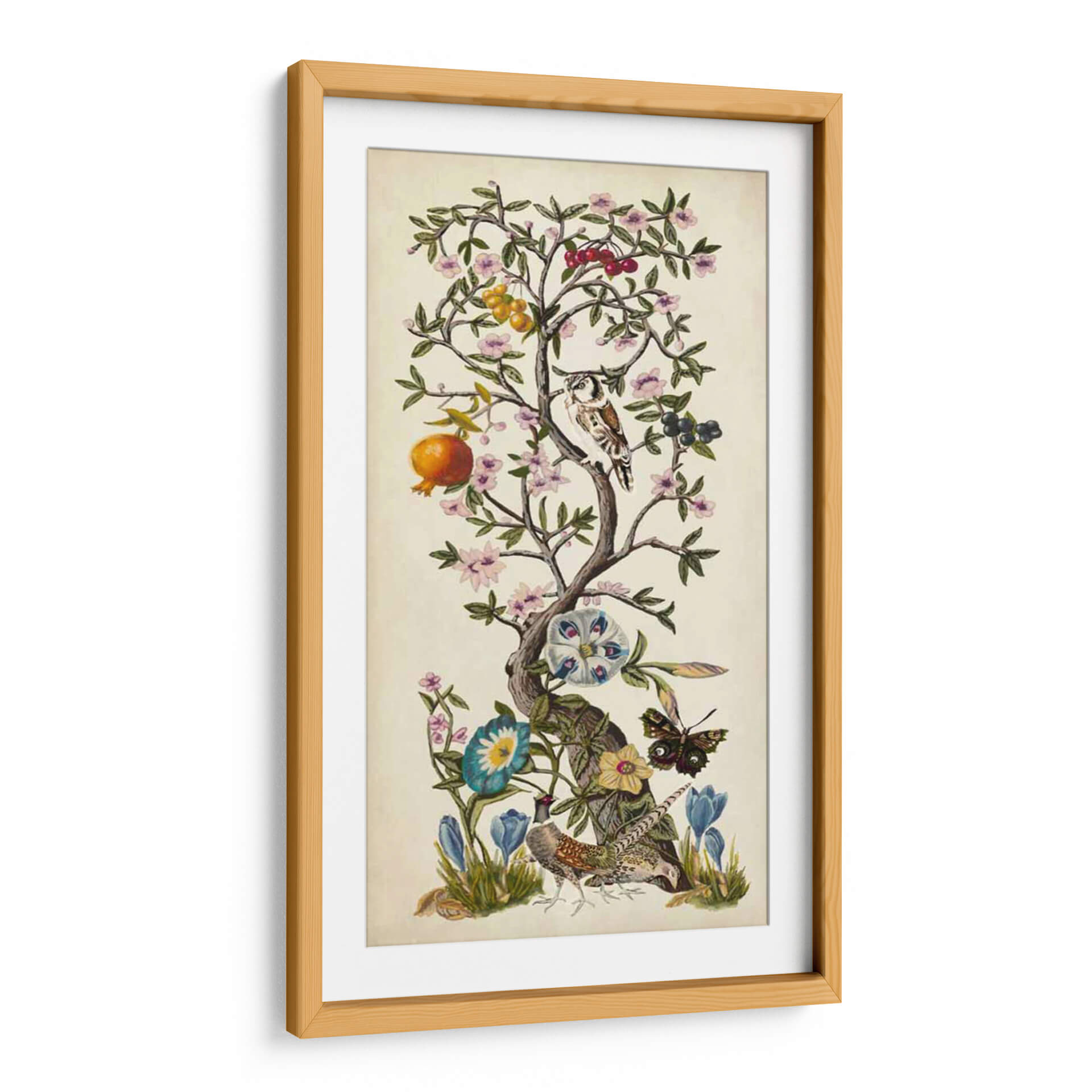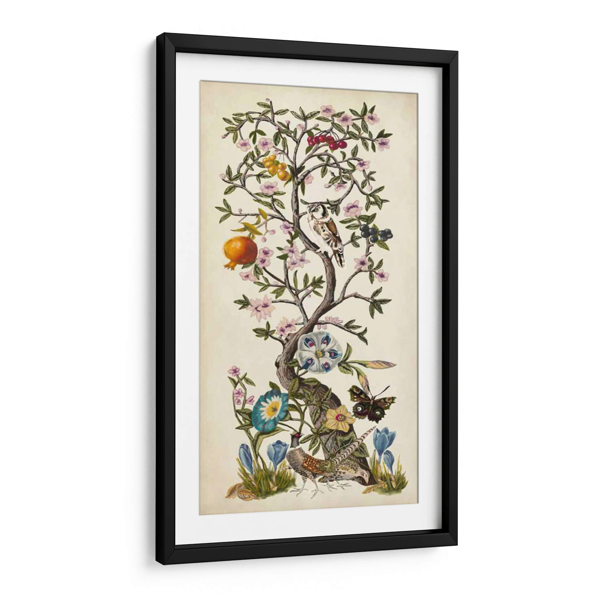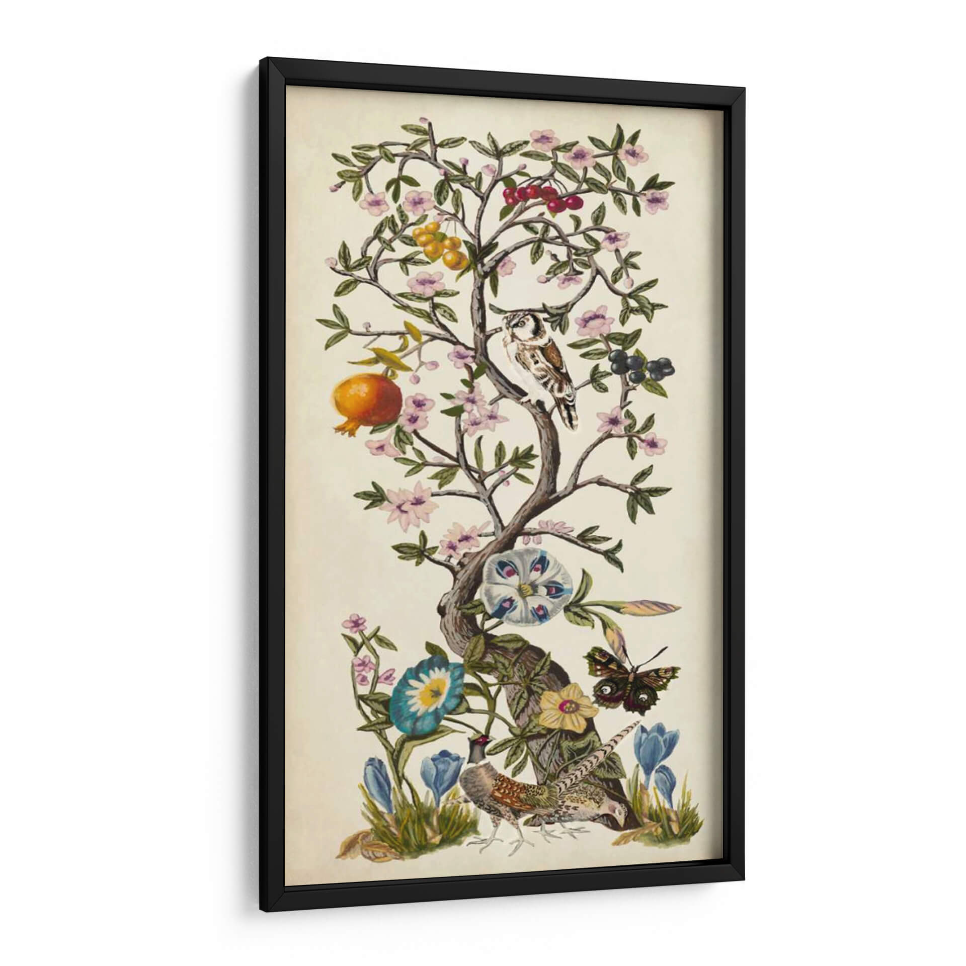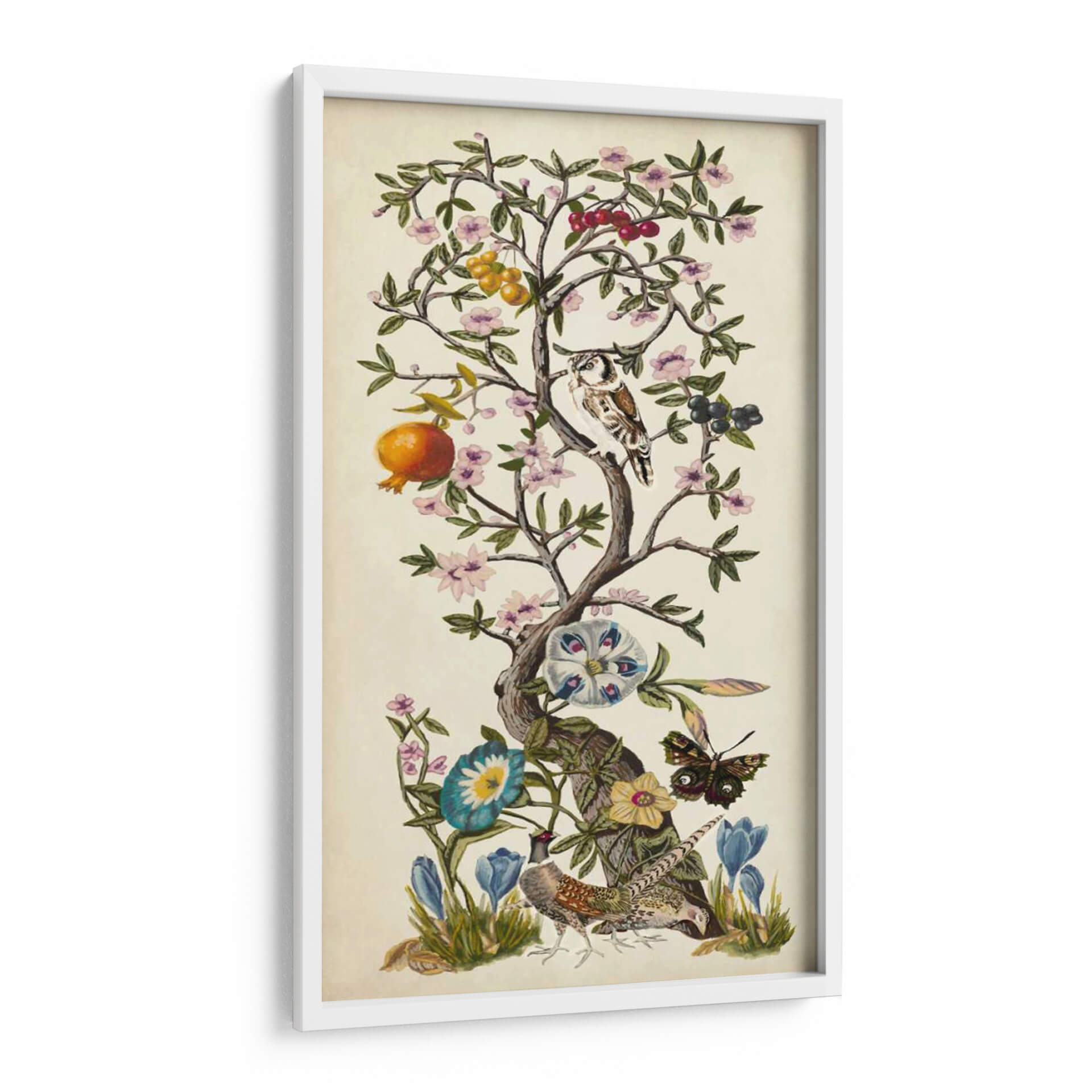 Embárquese en un viaje visual con 'Chinoiserie Natura I' de Naomi McCavitt, una obra de arte que evoca la belleza atemporal de la naturaleza con un toque exótico y refinado. Este cuadro decorativo presenta un árbol frutal exuberante, adornado con delicadas flores en tonos pastel, frutos vibrantes como granadas y bayas, y un observador búho posado entre sus ramas. La composición se complementa con la presencia de un majestuoso faisán, una mariposa de intrincados patrones y capullos de flores que prometen abrirse. La paleta de colores, dominada por tonos tierra suaves, rosas pampita, azules serenos y toques de naranja y verde, crea una atmósfera de calma y sofisticación. El estilo se inspira en la estética oriental y el clasicismo, ofreciendo una pieza que fusiona lo tradicional con lo contemporáneo. "Chinoiserie Natura I" es ideal para añadir un punto de interés elegante y sereno a cualquier espacio, ya sea una sala de estar, un dormitorio o un estudio. Este cuadro decorativo no solo embellece, sino que también invita a la contemplación, aportando una sensación de armonía y conexión con el mundo natural. Descubra la magia de esta pieza única que transformará su hogar en una galería personal.