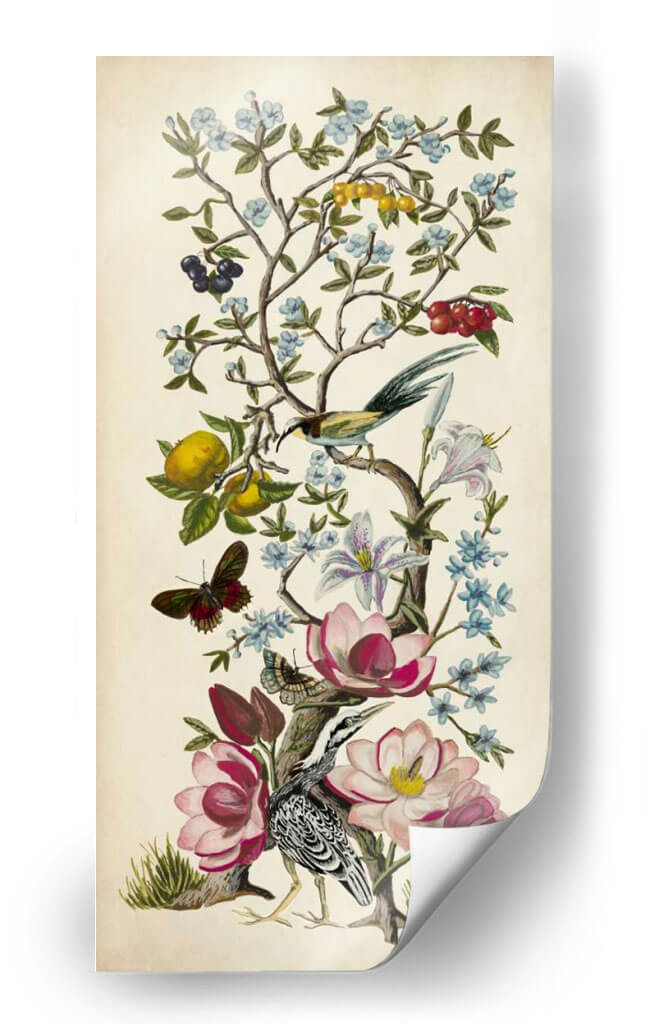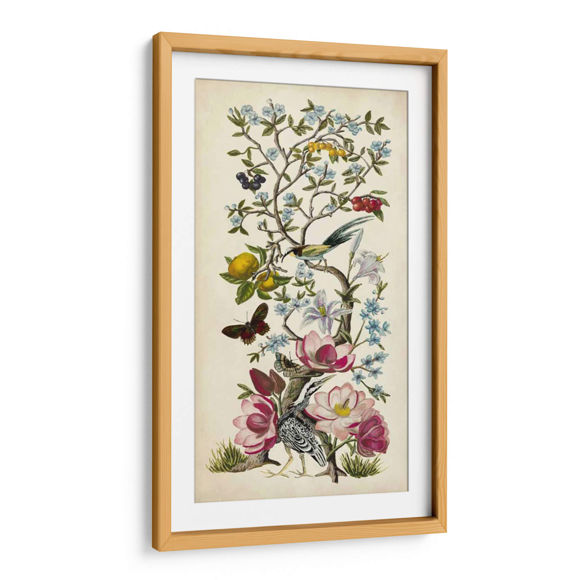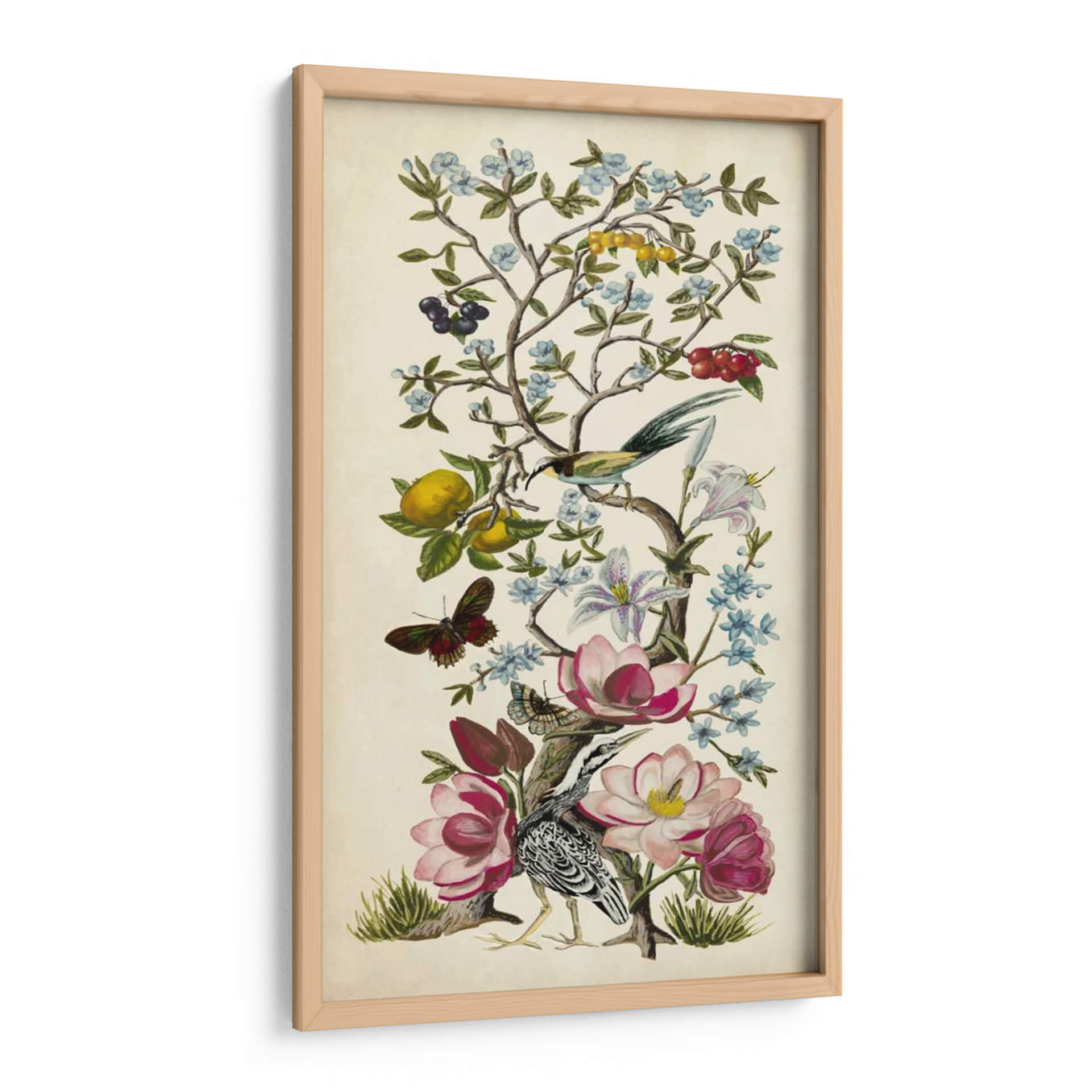 Sumérgete en la delicadeza y el encanto de "Chinoiserie Natura II", una obra de arte que evoca la belleza atemporal de la naturaleza con un toque etéreo. Este cuadro decorativo presenta un intrincado diseño inspirado en el estilo chinoiserie, donde ramas delicadas se entrelazan con vibrantes flores de magnolias en tonos rosados y fucsia, lirios blancos y pequeñas flores azules. Aves exóticas y mariposas de colores se posan graciosamente entre la exuberante vegetación y frutos como limones y cerezas, creando una escena llena de vida y movimiento. La paleta de colores suaves, con el fondo en un tono marfil antiguo, realza la riqueza de los detalles y la profundidad de la composición. Ideal para añadir un punto de sofisticación y serenidad a cualquier espacio, este lienzo es perfecto para salones, dormitorios o estudios que buscan un toque de elegancia clásica con una sensibilidad contemporánea. Su atmósfera tranquila y detallada invita a la contemplación y transforma cualquier pared en una ventana a un jardín encantado.