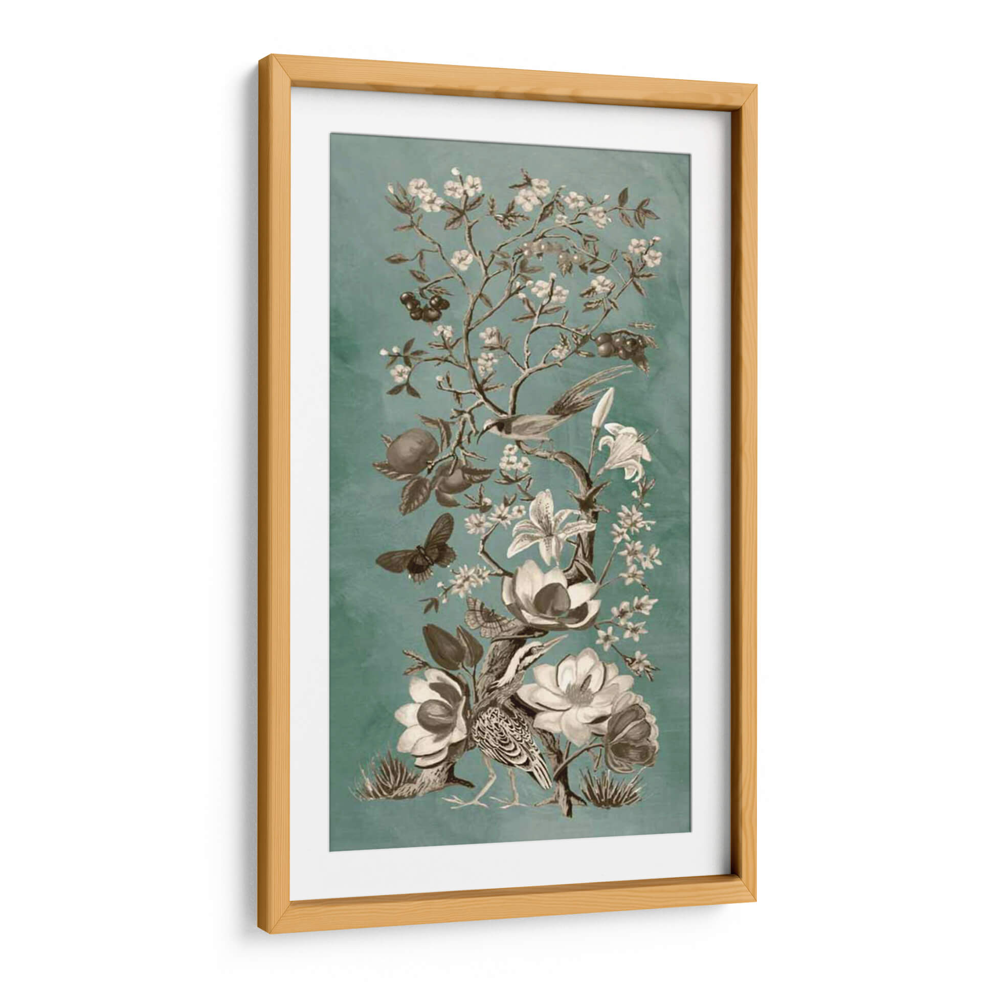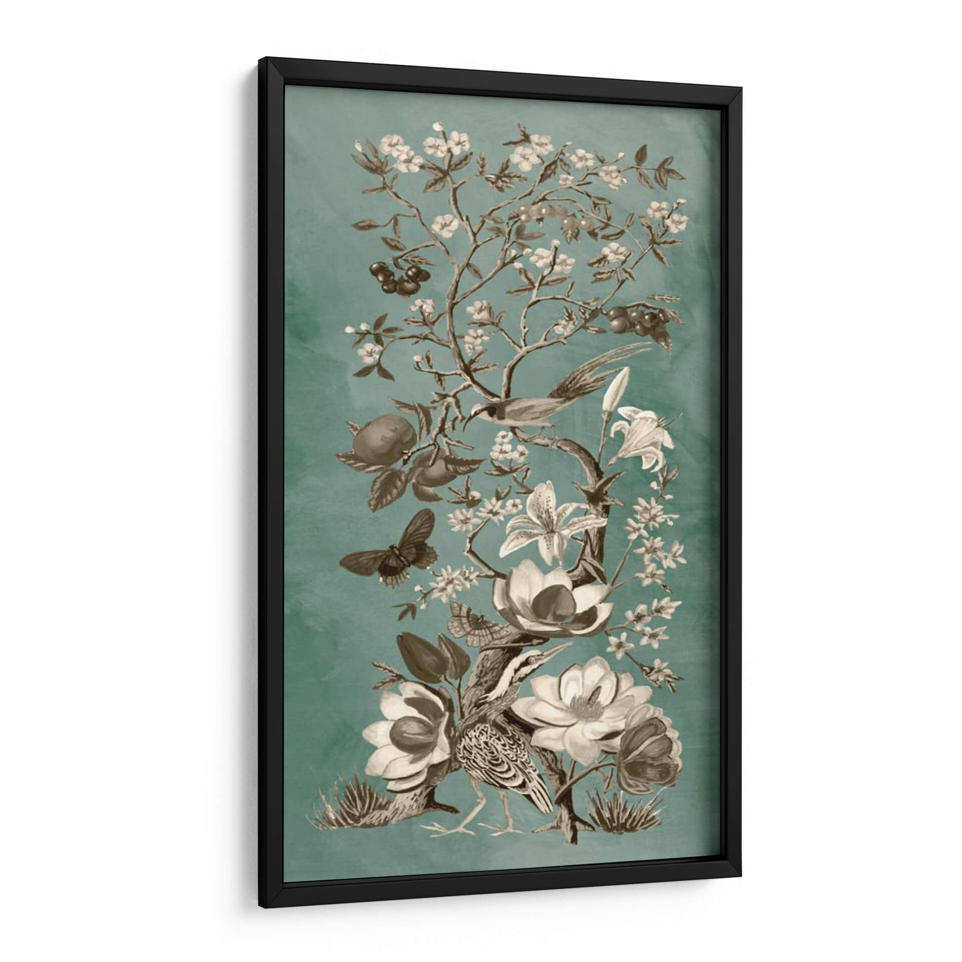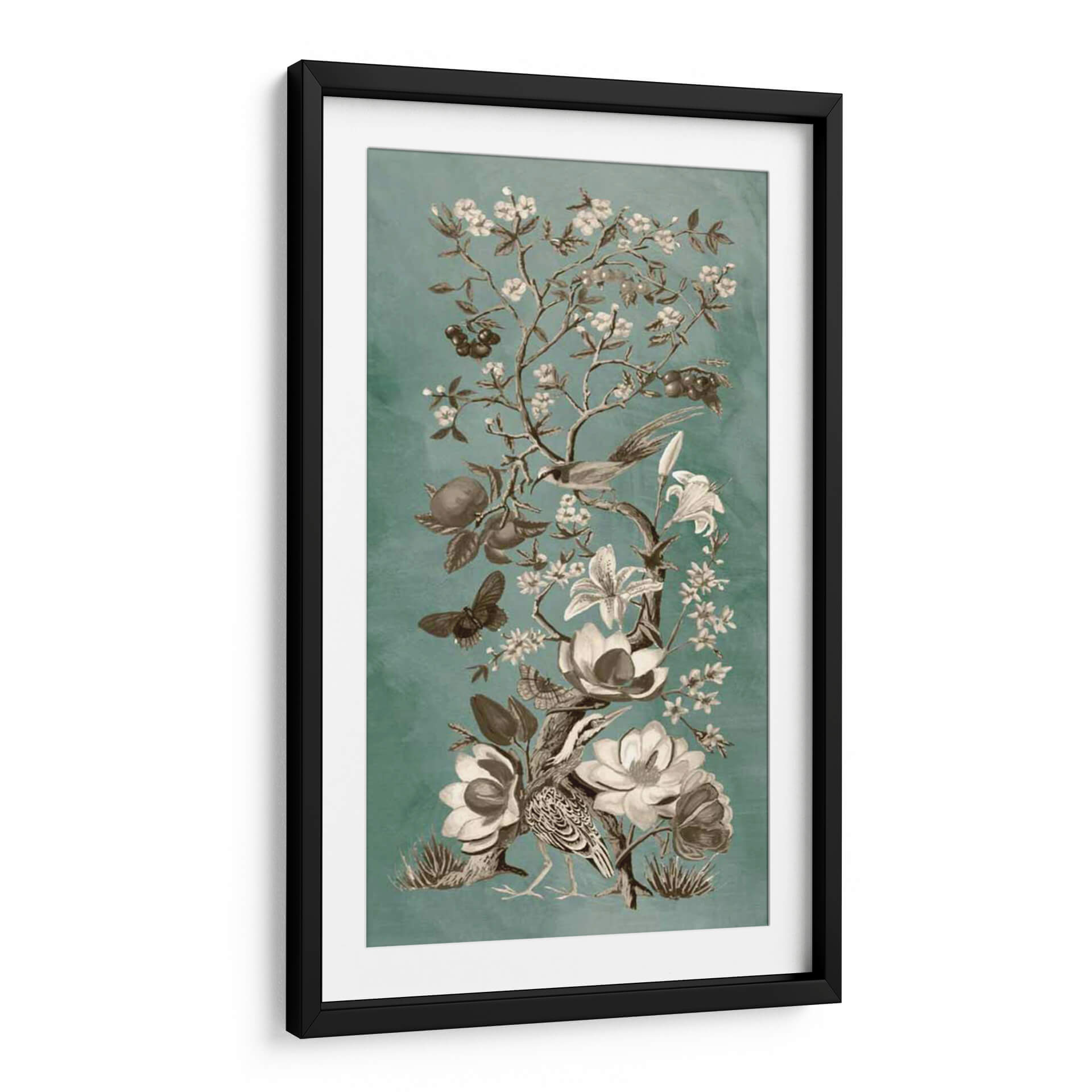 Sumérgete en la delicada belleza de "Chinoiserie Patina II" de Naomi McCavitt, un cuadro decorativo que evoca la serenidad de un jardín oriental en plena floración. Esta obra maestra presenta un intrincado diseño de ramas cargadas de flores delicadas y frutos exuberantes, enmarcando a elegantes aves y mariposas en un ballet natural. La paleta de colores, dominada por serenos tonos verde azulado y contrastes de sepia y blanco, crea una atmósfera de calma y sofisticación, perfecta para añadir un toque de refinamiento a cualquier espacio. El estilo, inspirado en la estética asiática y con un acabado de pátina sutil, aporta una profundidad y un aire atemporal a la pieza. Ideal para salones, dormitorios o estudios que buscan inspiración y tranquilidad, este cuadro decorativo es una invitación a la contemplación. Su composición vertical y detallada lo convierte en un punto focal cautivador, capaz de transformar cualquier pared en una ventana a un paraíso botánico. Descubre la armonía y la elegancia de la naturaleza capturada por el talento de Naomi McCavitt y lleva la serenidad a tu hogar.
