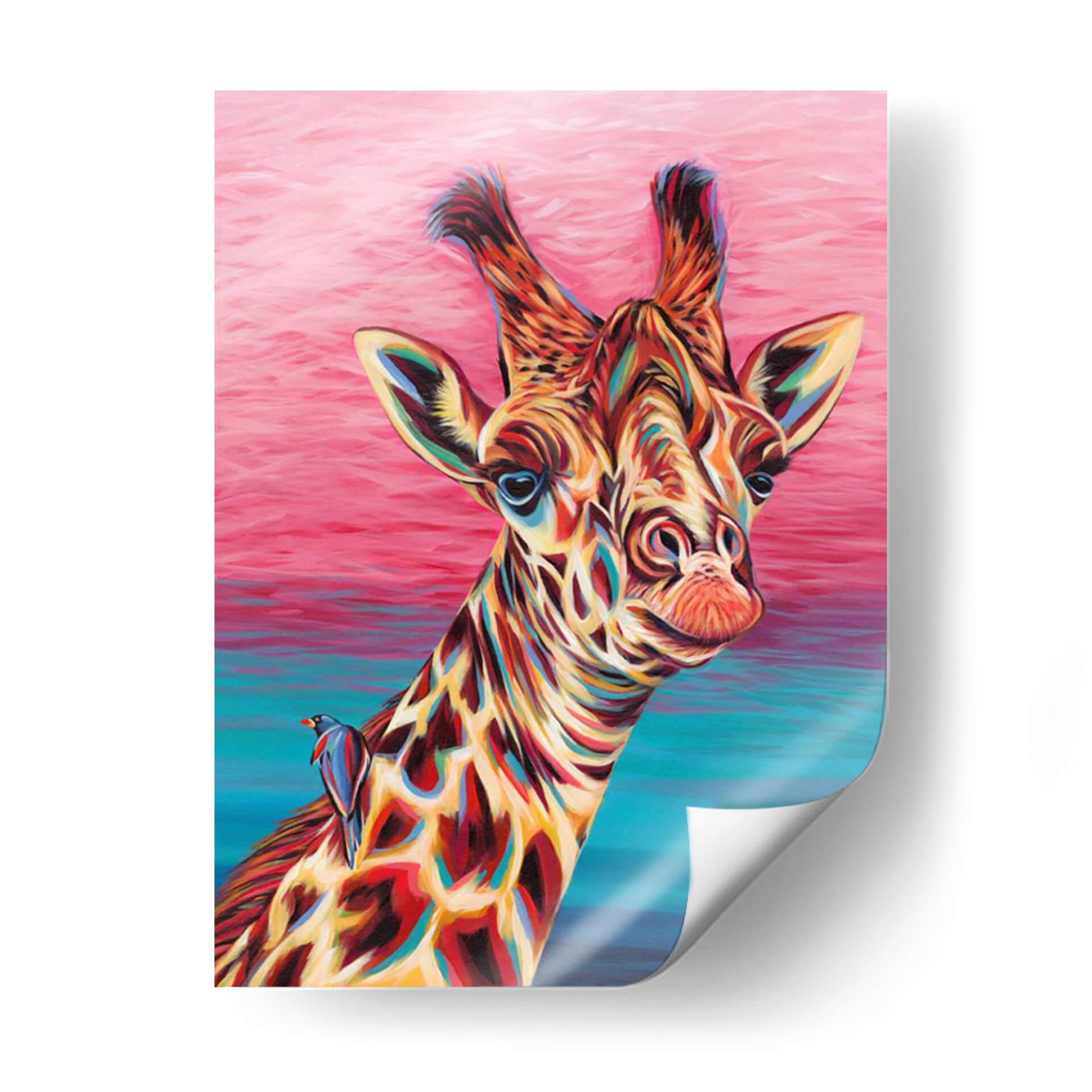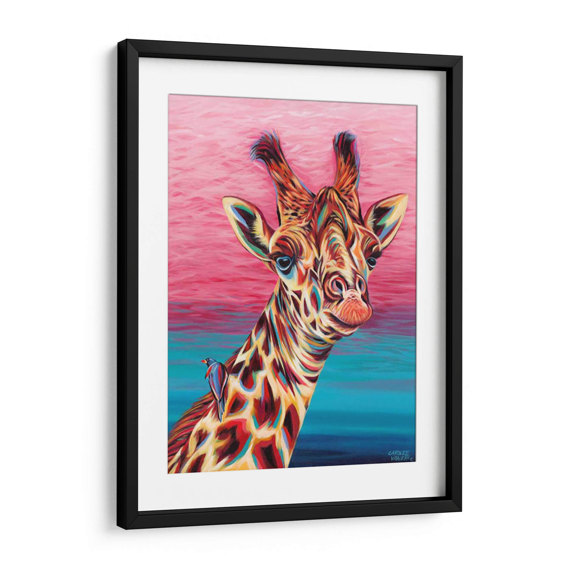Este cautivador cuadro decorativo, "Cielo Alta Jirafa I" de Carolee Vitaletti, es una explosión de color y vida que transformará cualquier espacio. La obra presenta un primer plano detallado de una jirafa, cuya piel está representada con pinceladas vibrantes y audaces que fusionan tonos cálidos como el naranja, el rojo y el amarillo con toques eléctricos de azul y verde. El estilo es contemporáneo y expresionista, con una textura rica que da profundidad a la imagen. El fondo se divide en un degradado de rosa intenso en la parte superior, evocando un atardecer vibrante o un cielo onírico, y un azul profundo en la parte inferior, creando un contraste dinámico. Un pequeño pájaro azul y rojo posado en el cuello de la jirafa añade un detalle encantador y un punto focal adicional. La expresión de la jirafa es serena pero curiosa, invitando a la contemplación. Este cuadro es ideal para añadir un toque de personalidad y alegría a salones modernos, dormitorios acogedores u oficinas creativas, sirviendo como una pieza central que genera conversación y admiración. Su paleta de colores inusual y su interpretación artística la convierten en una adición única a cualquier colección de arte decorativo de pared, perfecta para quienes buscan romper con lo convencional y abrazar la expresividad artística.