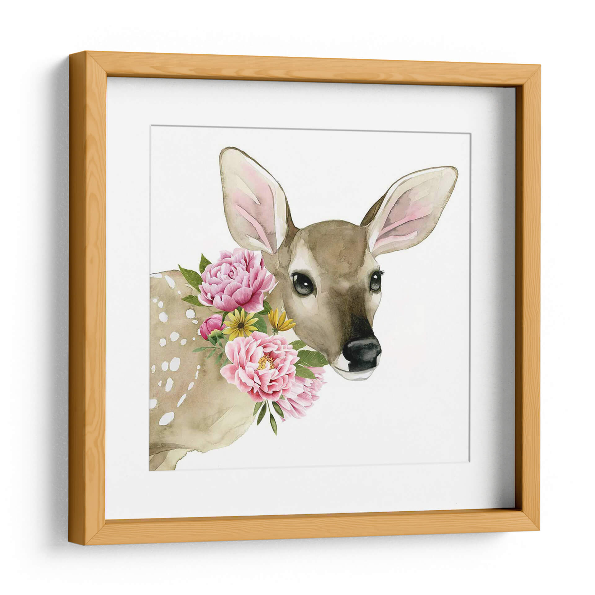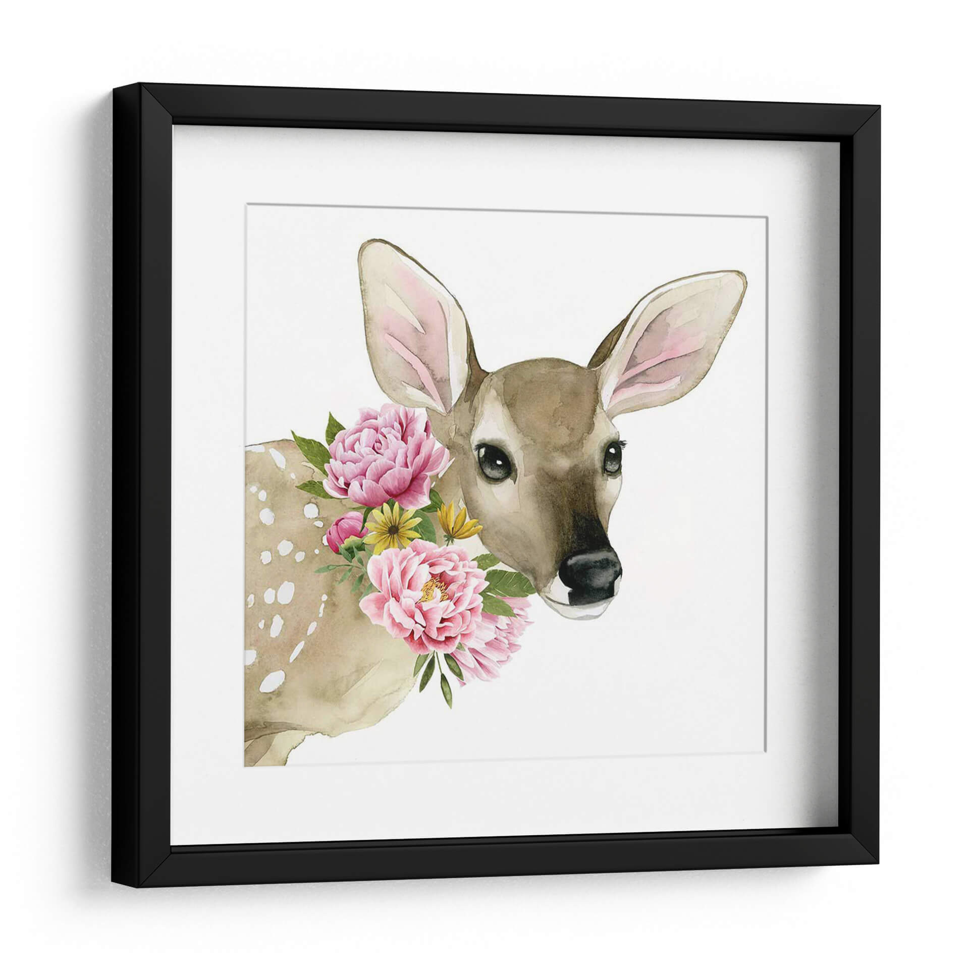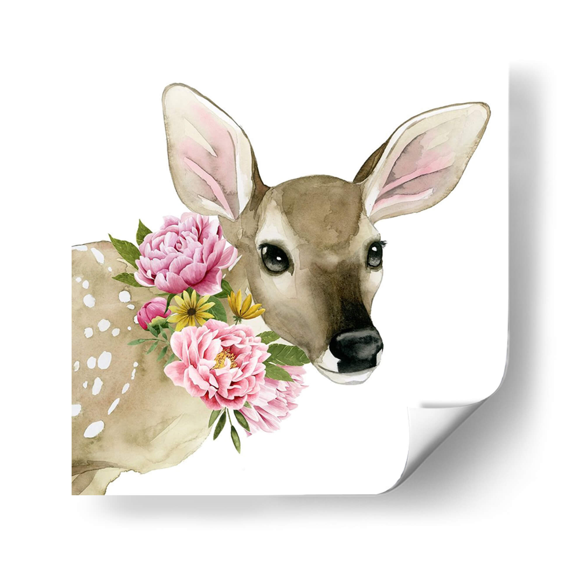 Este encantador cuadro decorativo, titulado 'Ciervo Spring I' por Grace Popp, captura la dulzura de la naturaleza con un toque de fantasía. La obra presenta un tierno cervatillo en un primer plano, con sus grandes orejas y ojos expresivos que irradian inocencia. Su pelaje, en tonos marrones y beige, está sutilmente decorado con delicadas motas blancas, añadiendo un toque etéreo. Lo más destacado de la pieza es el vibrante collar de flores rosas y amarillas que rodean su cuello, creando un contraste juguetón con su semblante sereno. La técnica de acuarela utilizada aporta una suavidad y fluidez a la imagen, mientras que el fondo blanco puro resalta la figura del ciervo y las flores, dándole un aire de pureza y tranquilidad. Este cuadro es ideal para añadir un toque de color y encanto natural a cualquier espacio, desde habitaciones infantiles hasta salones modernos, creando una atmósfera de paz y alegría. Su estilo contemporáneo y temática animal lo convierten en una pieza versátil y cautivadora para quienes buscan un arte que inspire ternura y conexión con la naturaleza.