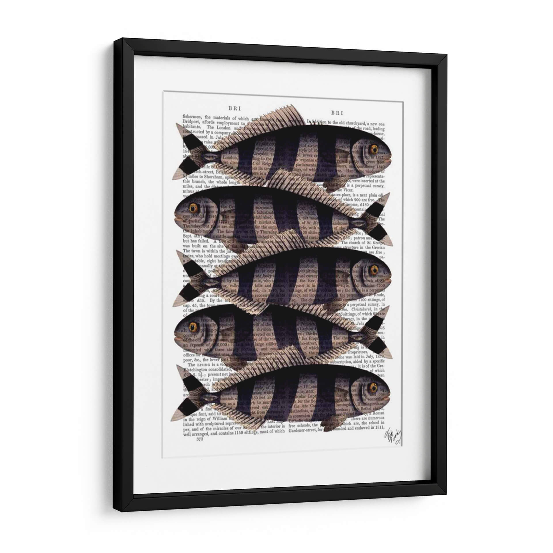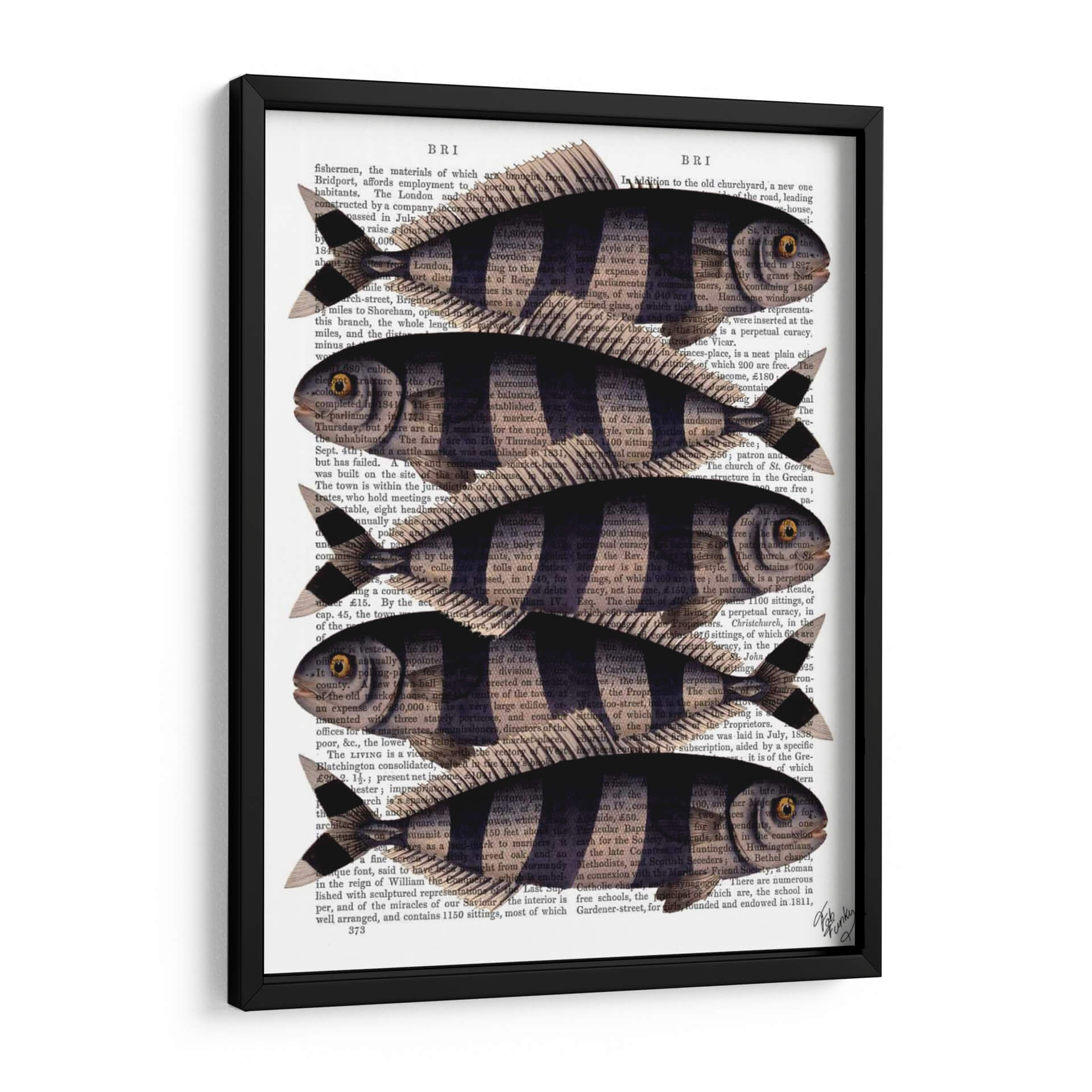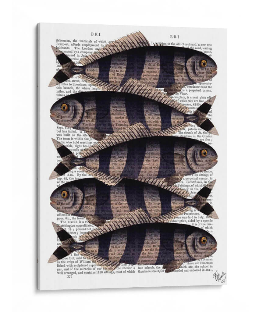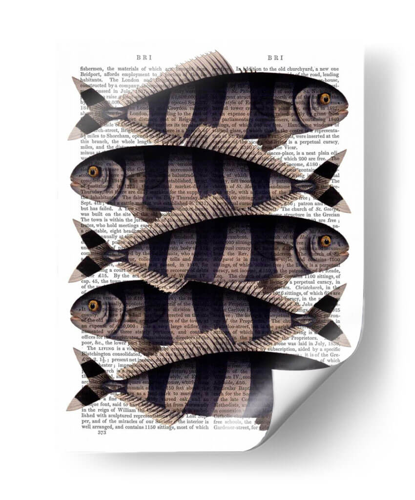 Inyecta un toque de encanto peculiar y estilo vintage a tu hogar con el cuadro decorativo 'Cinco Pescados a Rayas'. Esta obra de arte, creada por el artista Fab Funky, fusiona elementos naturales con una estética retro distintiva. Cinco peces estilizados, con sus llamativas rayas oscuras y cuerpos delineados en negro, nadan elegantemente sobre un fondo de texto antiguo, evocando la sensación de un descubrimiento científico de antaño o una ilustración de un libro de historia natural. La paleta de colores se centra en los tonos sepia y negro del papel de periódico, contrastando con las formas definidas de los peces, creando una composición visualmente atractiva y serena. Este cuadro decorativo es ideal para añadir personalidad a la sala de estar, la cocina, el estudio o incluso un baño con temática marina. Su diseño único lo convierte en un punto focal intrigante que seguramente iniciará conversaciones y aportará una dosis de carácter a cualquier espacio. Perfecto para amantes de la naturaleza, entusiastas de lo retro o cualquiera que busque una pieza de arte única y llena de historia.