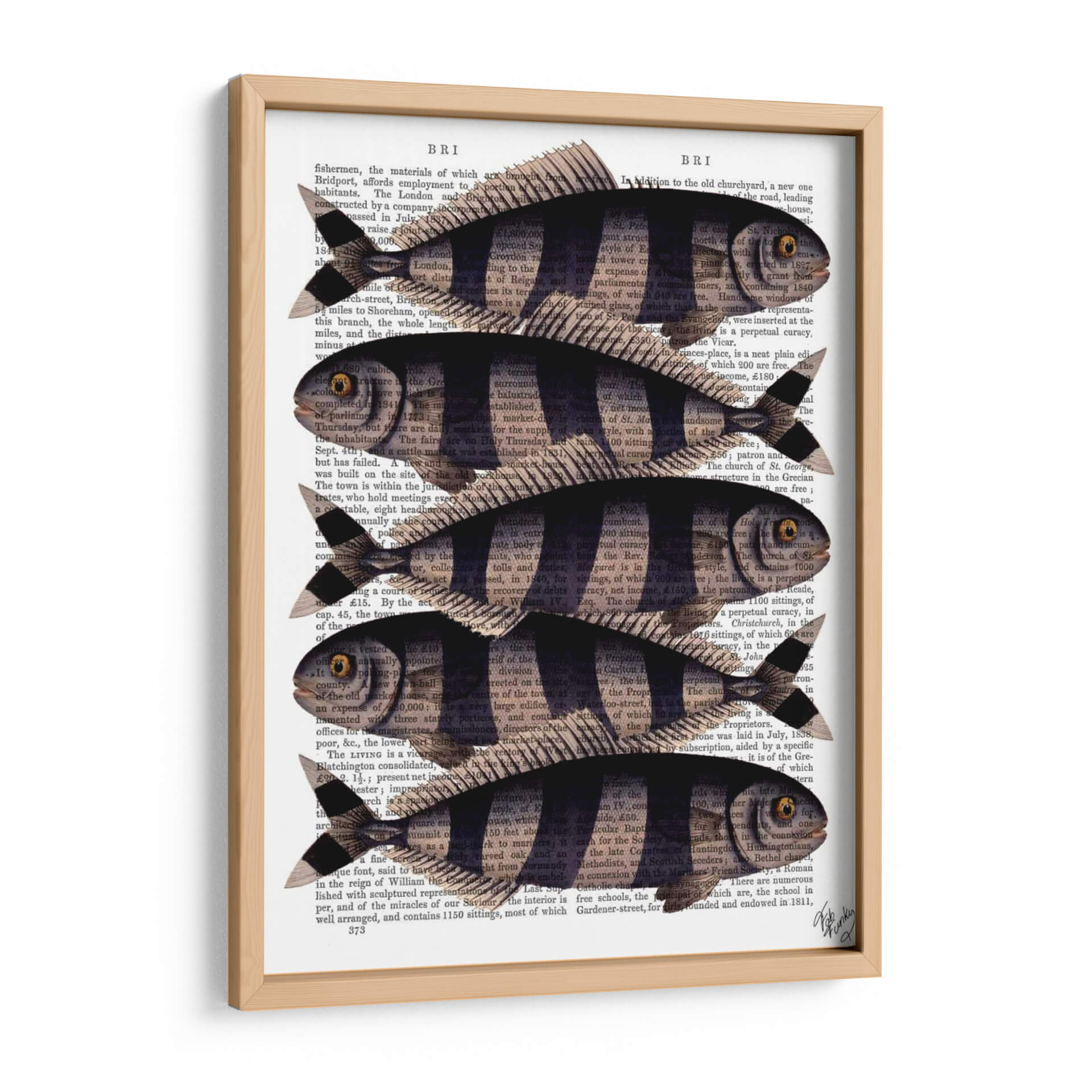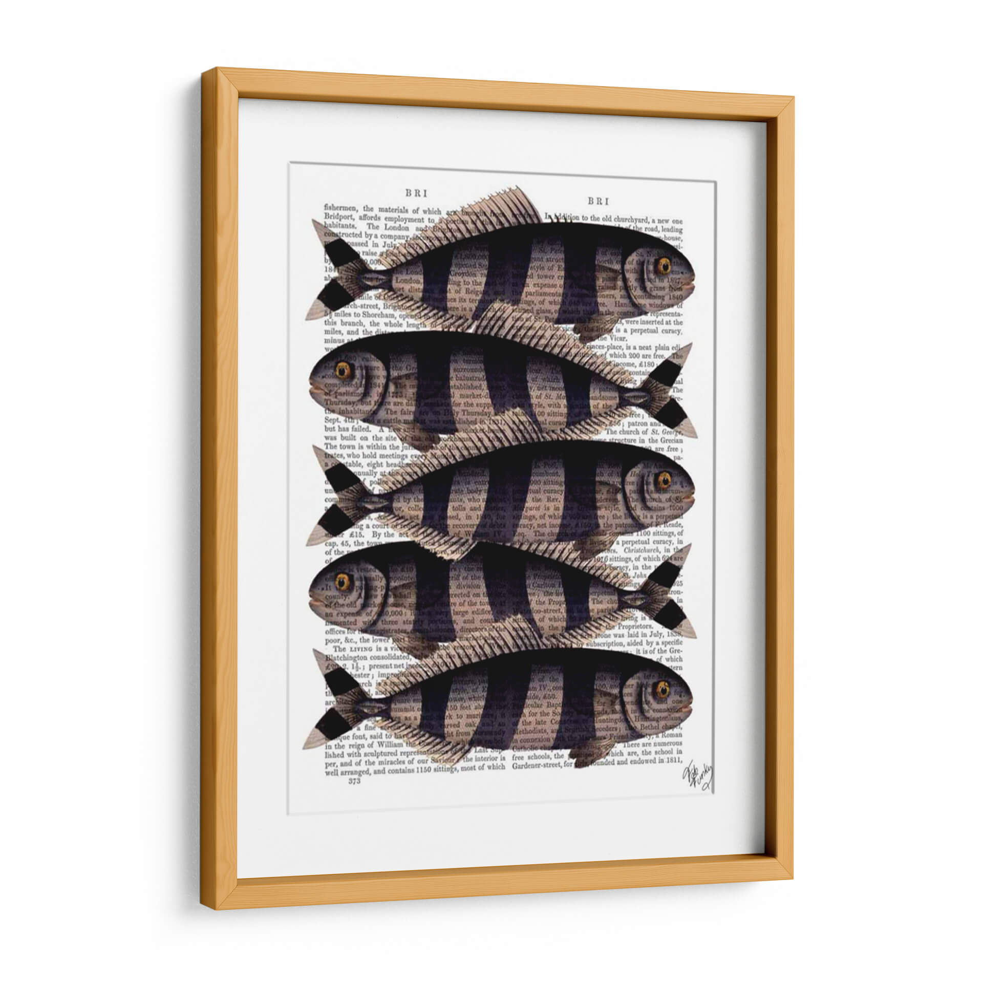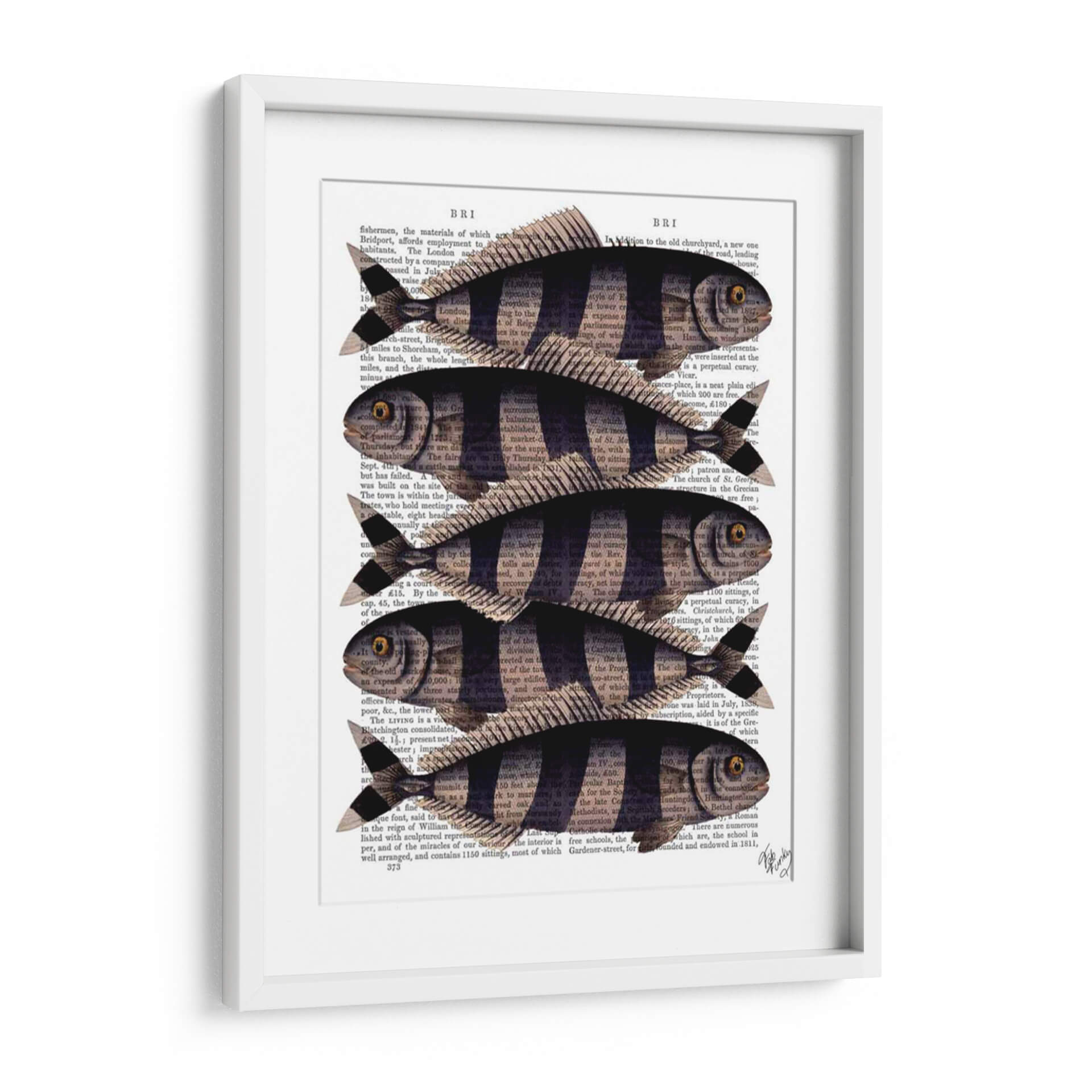 Inyecta un toque de encanto peculiar y estilo vintage a tu hogar con el cuadro decorativo 'Cinco Pescados a Rayas'. Esta obra de arte, creada por el artista Fab Funky, fusiona elementos naturales con una estética retro distintiva. Cinco peces estilizados, con sus llamativas rayas oscuras y cuerpos delineados en negro, nadan elegantemente sobre un fondo de texto antiguo, evocando la sensación de un descubrimiento científico de antaño o una ilustración de un libro de historia natural. La paleta de colores se centra en los tonos sepia y negro del papel de periódico, contrastando con las formas definidas de los peces, creando una composición visualmente atractiva y serena. Este cuadro decorativo es ideal para añadir personalidad a la sala de estar, la cocina, el estudio o incluso un baño con temática marina. Su diseño único lo convierte en un punto focal intrigante que seguramente iniciará conversaciones y aportará una dosis de carácter a cualquier espacio. Perfecto para amantes de la naturaleza, entusiastas de lo retro o cualquiera que busque una pieza de arte única y llena de historia.