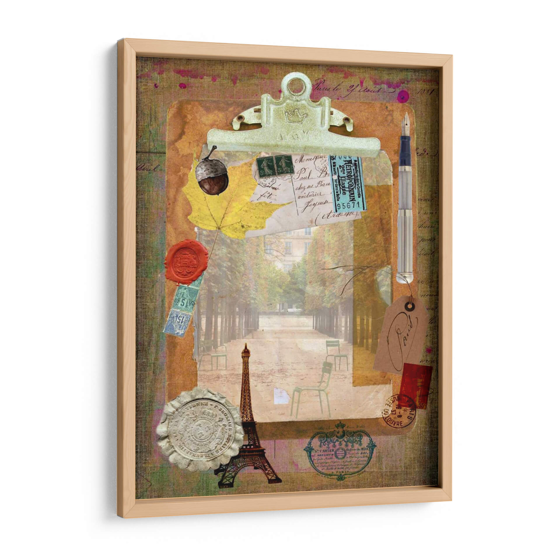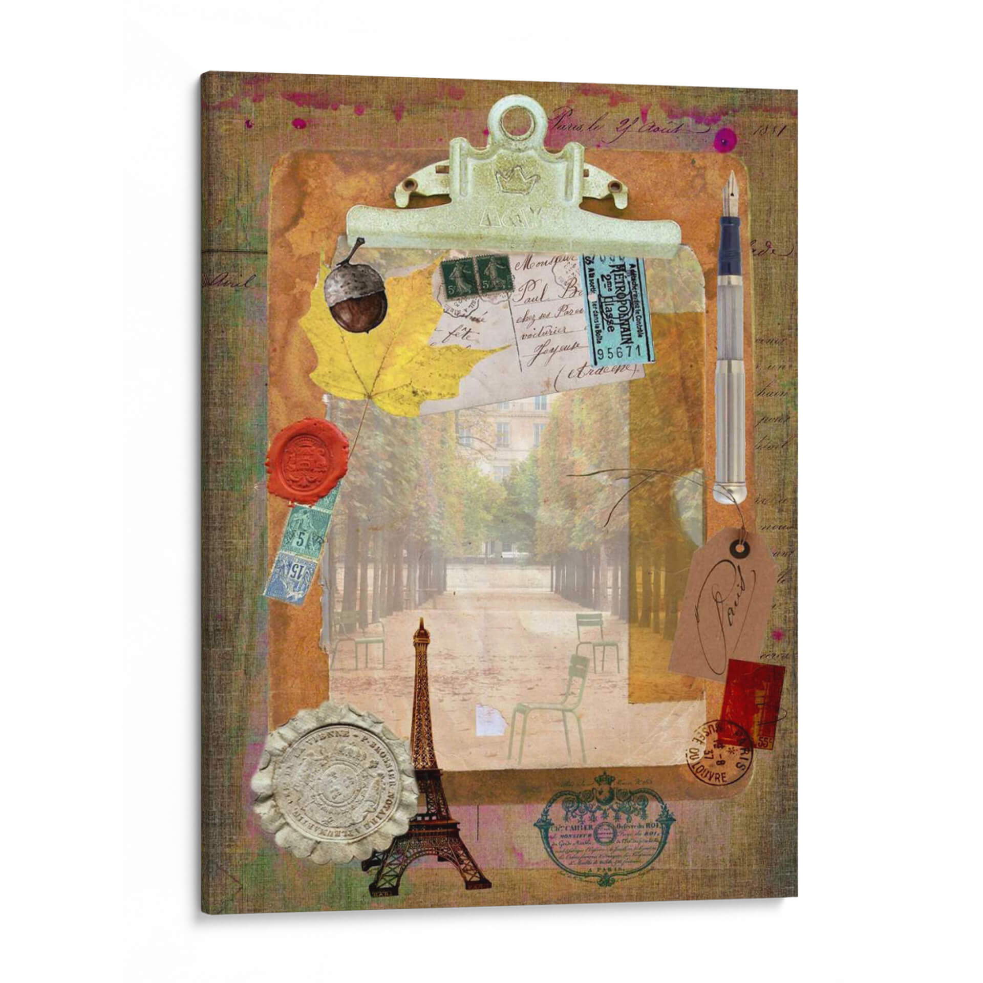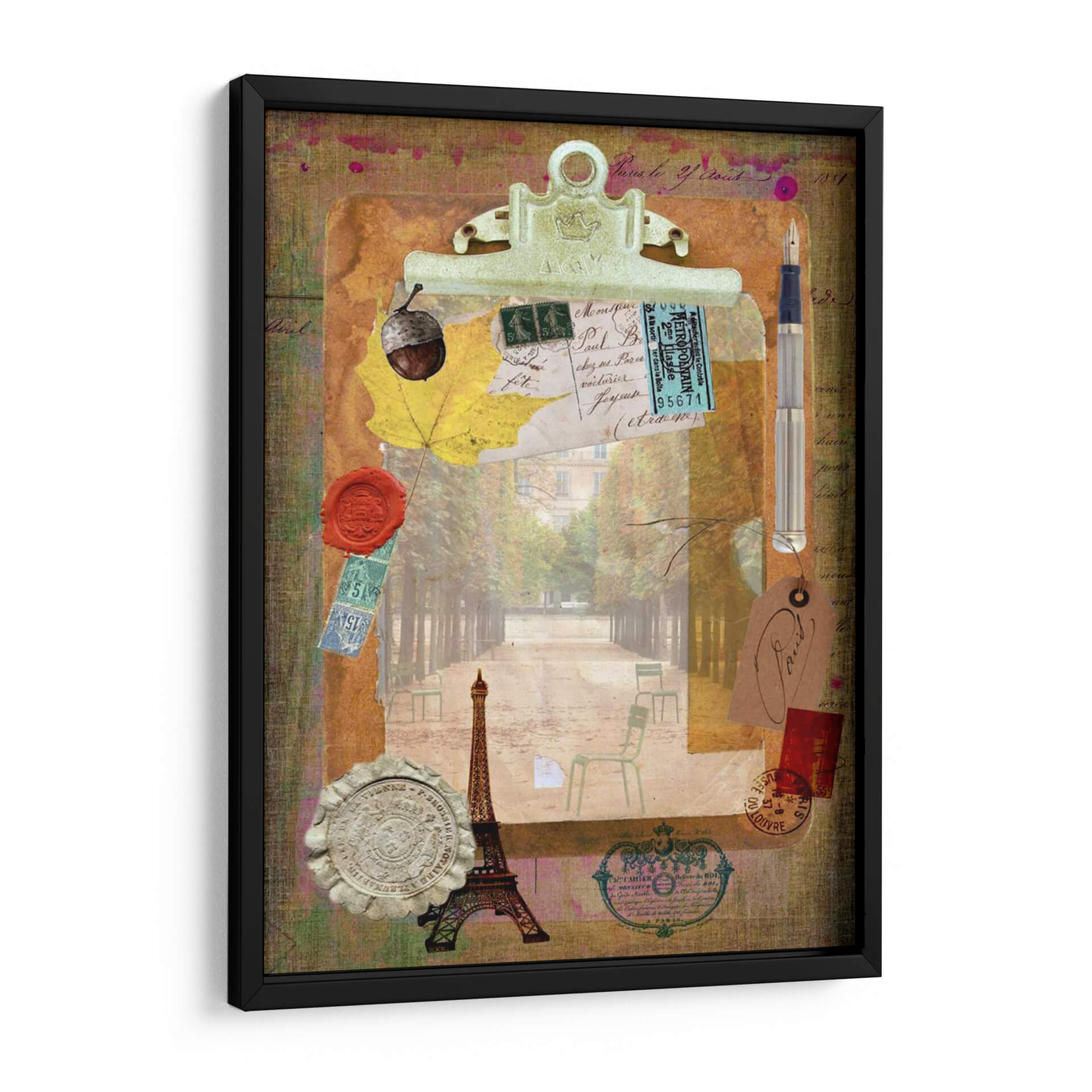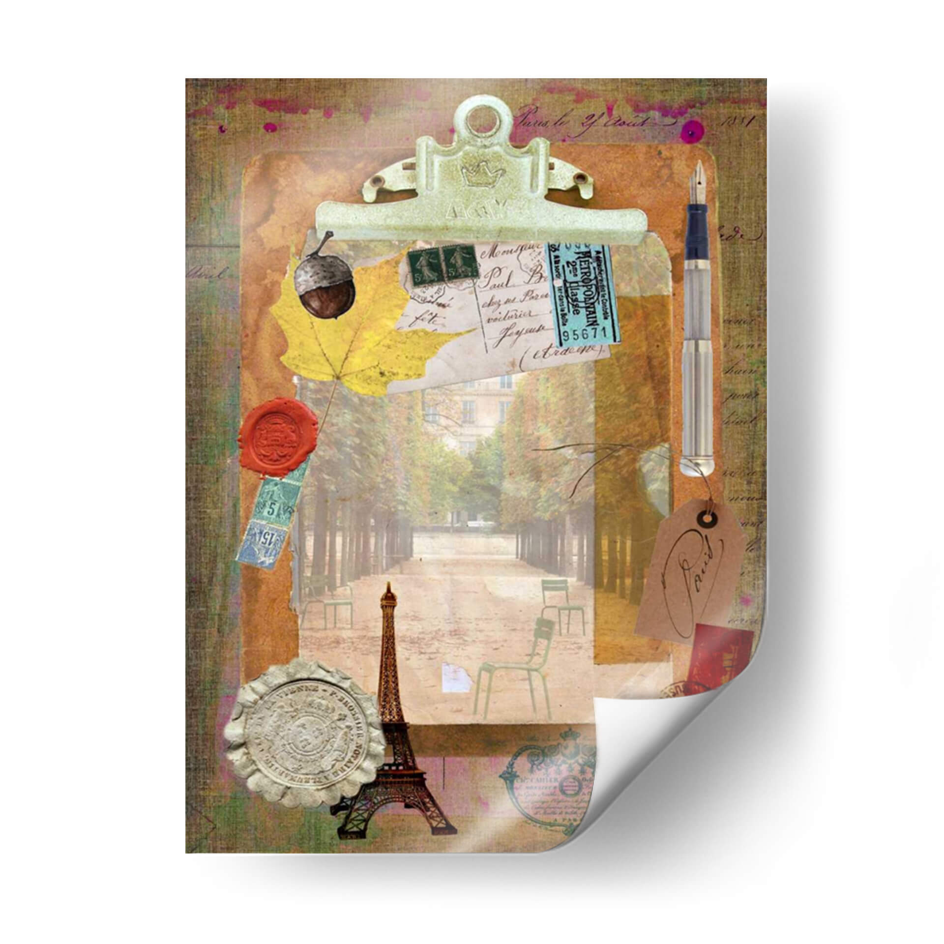 Sumérgete en la nostalgia y el encanto de París con 'Cobró El Otoño III', una obra de arte digital de Sandy Lloyd que evoca la esencia de una escapada otoñal. Este cuadro decorativo es un collage meticuloso que fusiona elementos icónicos de la capital francesa con texturas ricas y una paleta de colores cálidos. Observamos un camino arbolado que se pierde en la distancia, salpicado de sillas de parque de estilo bistro, la emblemática Torre Eiffel en miniatura y sellos postales vintage. La presencia de una hoja de otoño amarilla, una bellota y un sello de cera rojo añade un toque rústico y estacional, mientras que la pluma estilográfica sugiere la narrativa y las cartas escritas desde el pasado. Los tonos ocres, marrones y verdes crean una atmósfera acogedora y evocadora, perfecta para añadir un toque de sofisticación bohemia a tu sala de estar, estudio u oficina. Este cuadro abstracto es ideal para quienes buscan una pieza que inspire recuerdos de viaje, momentos de contemplación o simplemente una conexión con la belleza atemporal de París. Su composición detallada y su estilo único lo convierten en un punto focal cautivador que invita a la reflexión y la apreciación del arte.