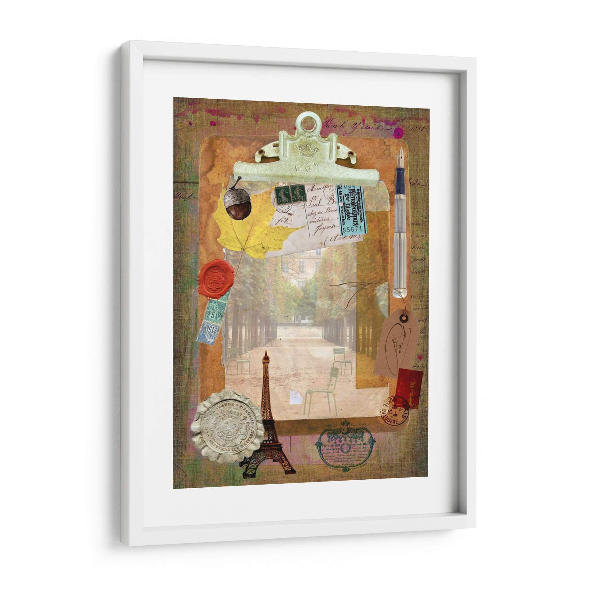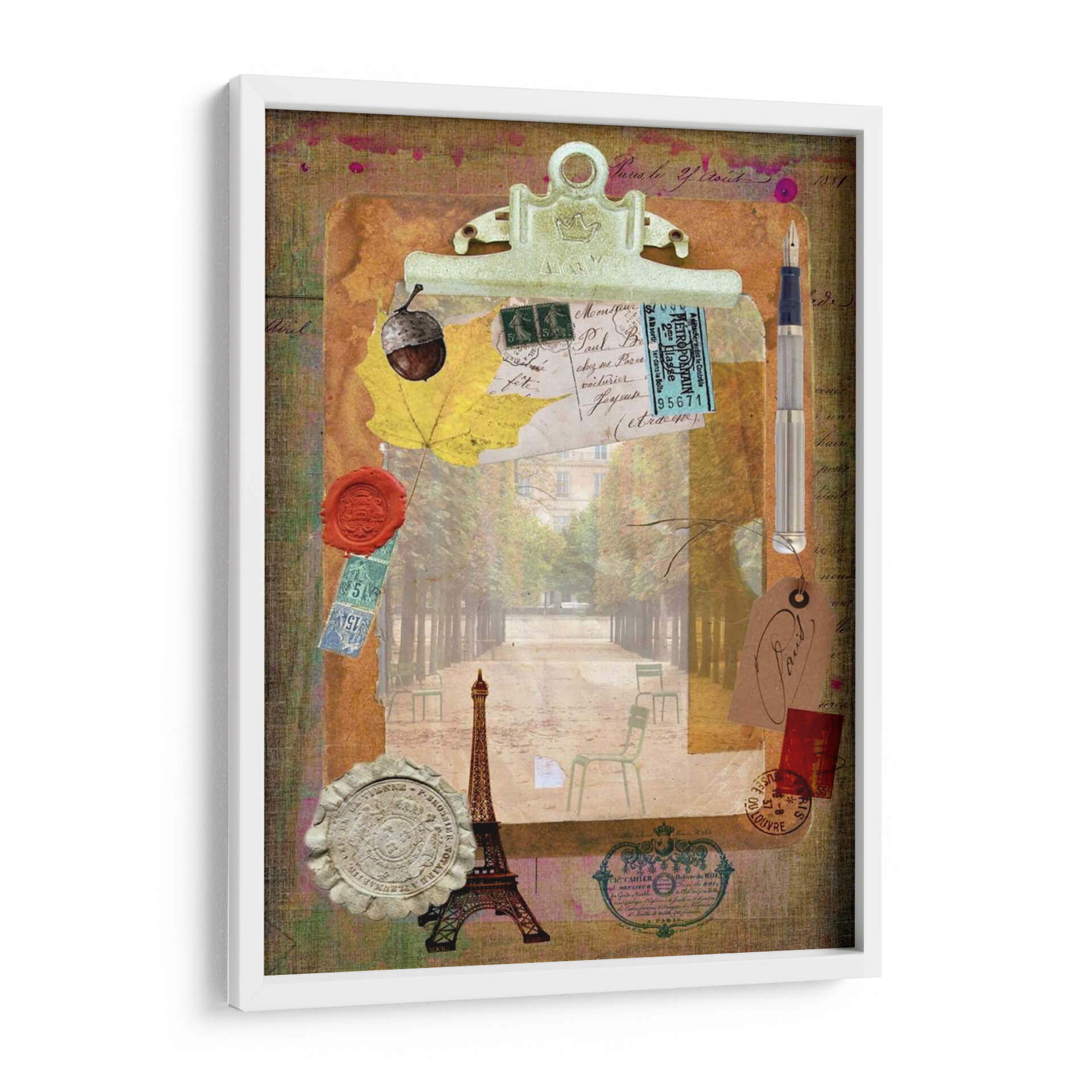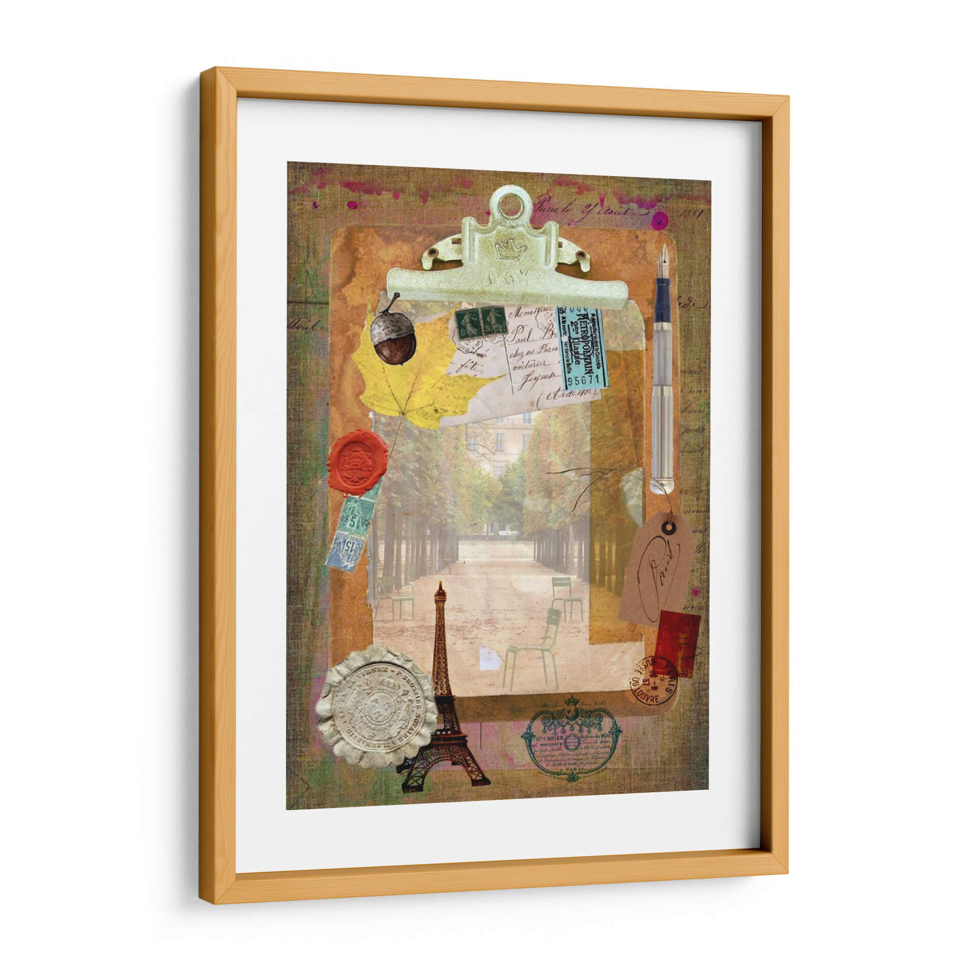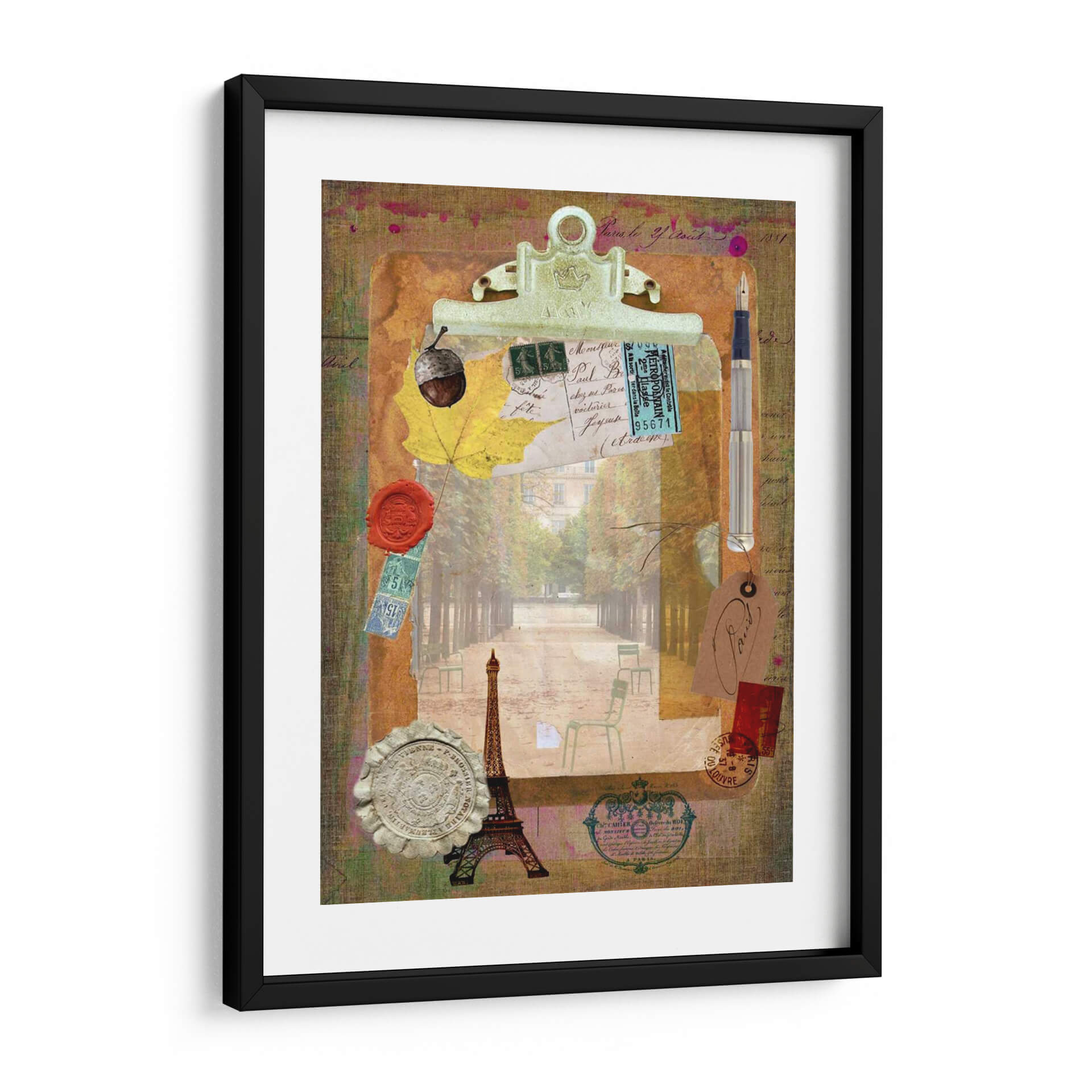 Sumérgete en la nostalgia y el encanto de París con 'Cobró El Otoño III', una obra de arte digital de Sandy Lloyd que evoca la esencia de una escapada otoñal. Este cuadro decorativo es un collage meticuloso que fusiona elementos icónicos de la capital francesa con texturas ricas y una paleta de colores cálidos. Observamos un camino arbolado que se pierde en la distancia, salpicado de sillas de parque de estilo bistro, la emblemática Torre Eiffel en miniatura y sellos postales vintage. La presencia de una hoja de otoño amarilla, una bellota y un sello de cera rojo añade un toque rústico y estacional, mientras que la pluma estilográfica sugiere la narrativa y las cartas escritas desde el pasado. Los tonos ocres, marrones y verdes crean una atmósfera acogedora y evocadora, perfecta para añadir un toque de sofisticación bohemia a tu sala de estar, estudio u oficina. Este cuadro abstracto es ideal para quienes buscan una pieza que inspire recuerdos de viaje, momentos de contemplación o simplemente una conexión con la belleza atemporal de París. Su composición detallada y su estilo único lo convierten en un punto focal cautivador que invita a la reflexión y la apreciación del arte.
